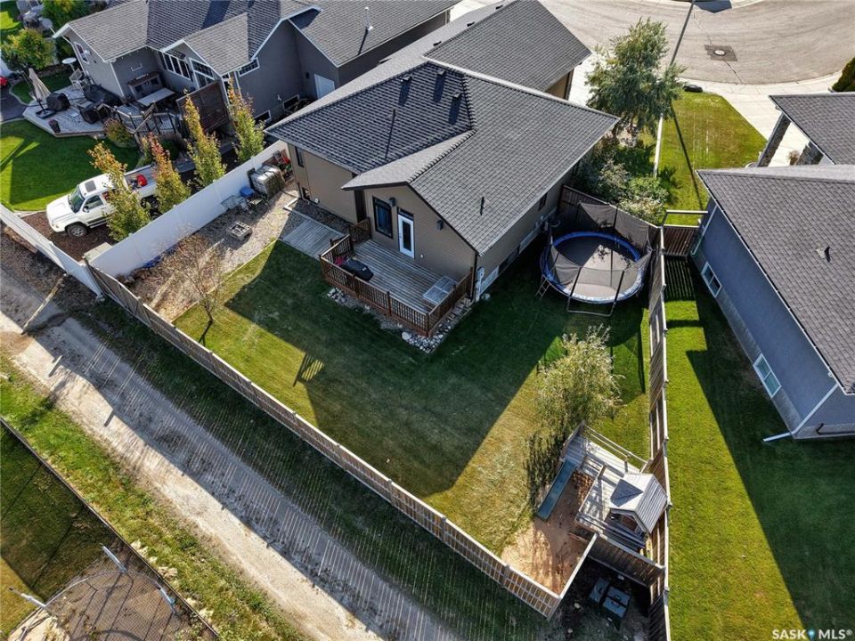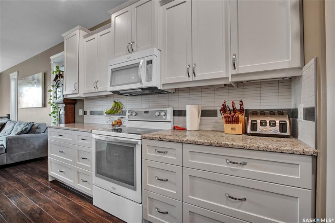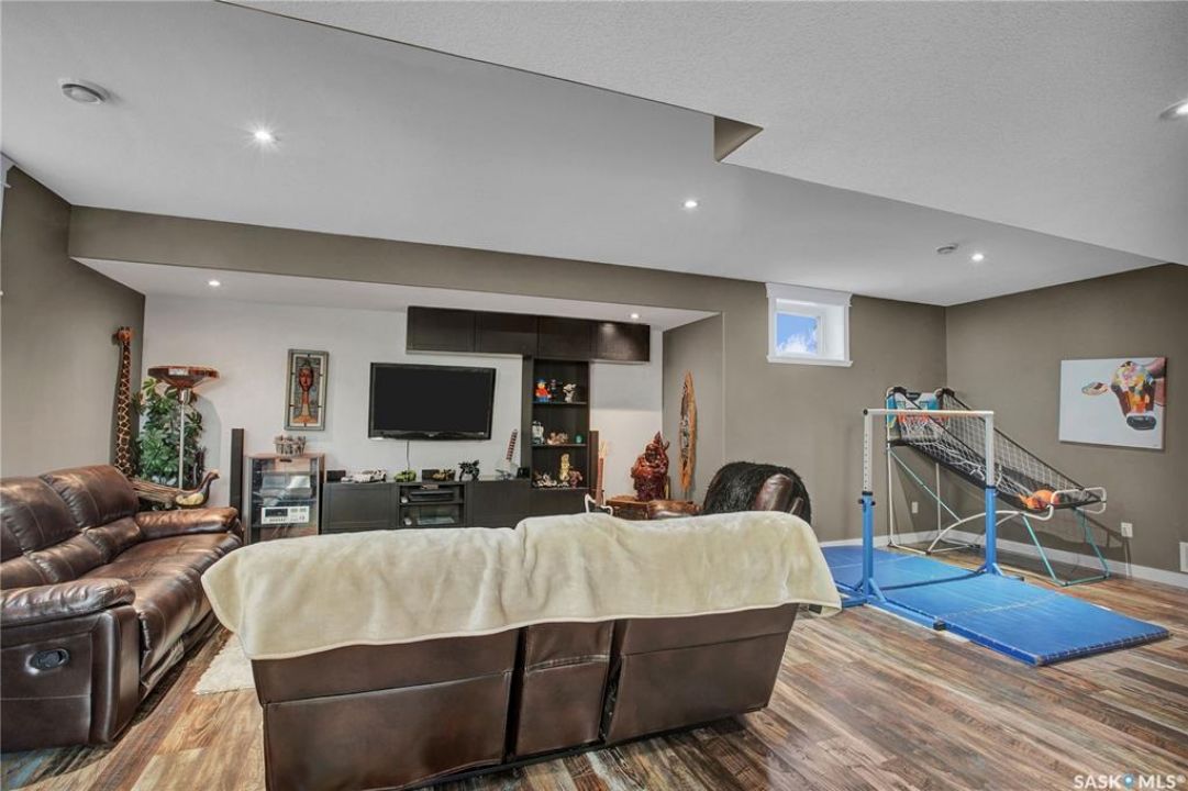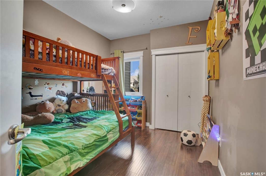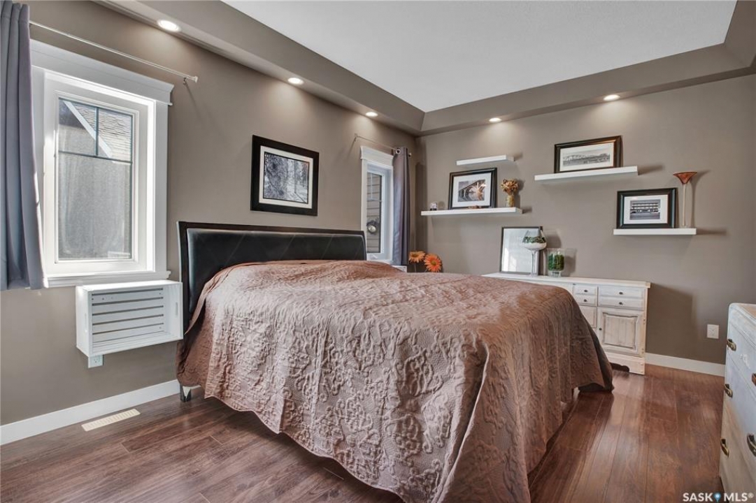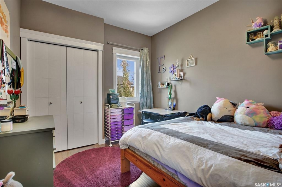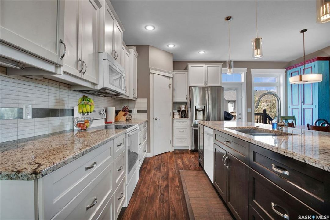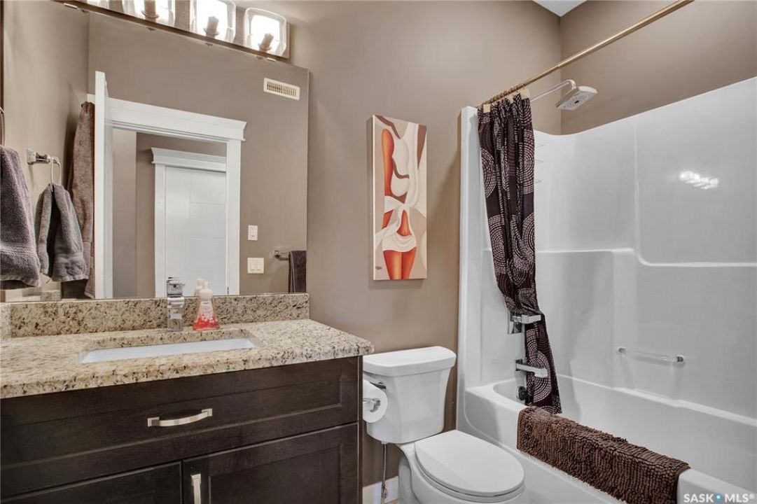 Welcome home to this immaculate 1,316 sq. ft. 4-bedroom, 3-bathroom bungalow—fully finished top to bottom and beautifully maintained throughout. The main floor offers a bright, open layout with a spacious living room featuring rich laminate floors and maple railings with metal spindles. The timeless two-tone kitchen includes granite countertops, tile backsplash, a large eat-up island, walk-in corner pantry, and under-cabinet lighting. The dining area easily accommodates large gatherings and includes a glass patio door to the back deck, plus transom windows that fill the space with natural light. Down the hall, the primary suite awaits with an upgraded drop-soffit ceiling, walk-in closet, and a 3-piece ensuite with custom tiled shower. Two additional bedrooms and a full 4-piece bathroom with tile floors and granite countertops complete the main level. The basement was designed for entertaining. A fantastic wet bar area features built-in cabinetry, bar fridge, and a raised seating peninsula. The massive family room is perfect for hosting game nights, movie nights, or setting up your home theater, and the adjoining games area offers plenty of room for a pool table or poker table. You'll also find a large bedroom, another full 4-piece bathroom, and a spacious laundry/storage/utility room—plus extra storage under the stairs. Outside, this property sits on a huge inside-corner, irregular lot with ample room for a trampoline, play structure, firepit, and more. Enjoy relaxing on the back deck with plenty of open views behind you looking out towards the golf course. Additional highlights include central A/C, HRV, an extra-wide concrete driveway, and an oversized 26'x26' attached garage that is fully insulated and drywalled. Upgraded bungalows like this are a rare find in Warman—this one shows 10/10 and is ready for its next owners. Contact your favourite Realtor today to book a private viewing!