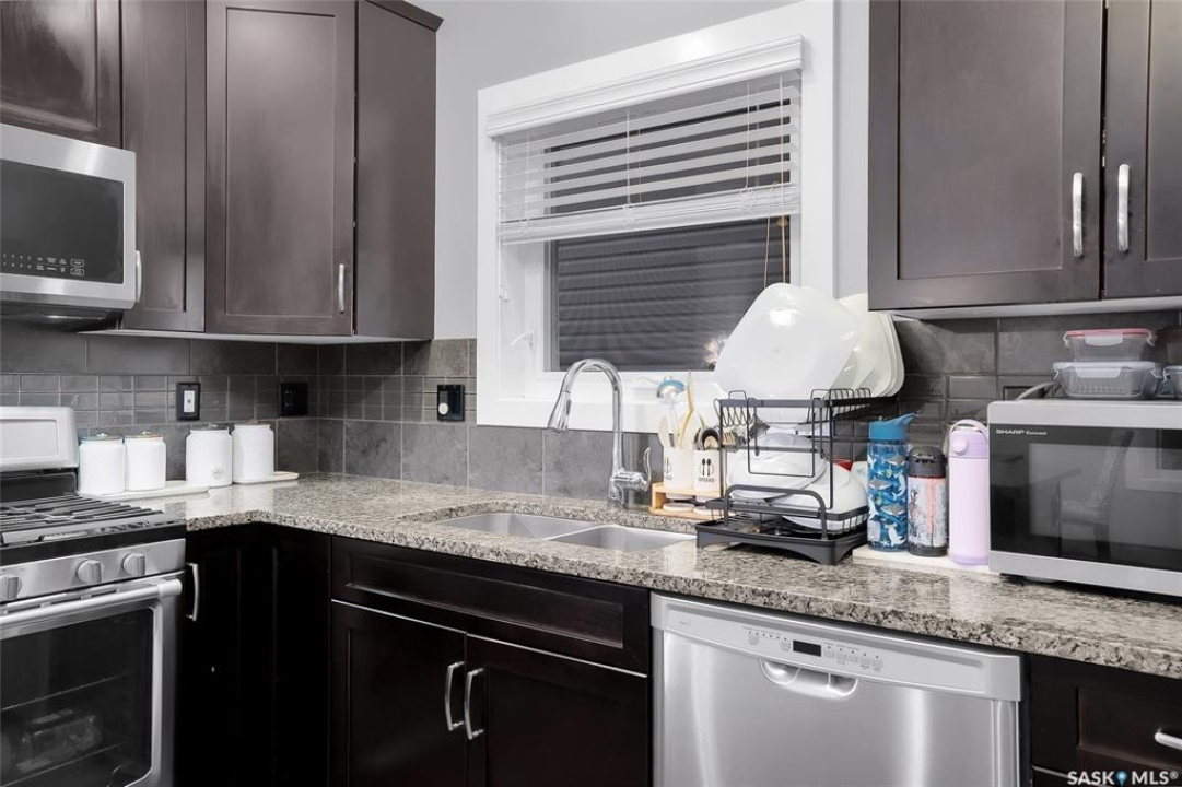 Step into Kensington living at its best with this fully developed two storey that delivers way more than you expect. The upgraded exterior, stone accents, and inviting front porch set the tone immediately, while inside the bright west exposure fills the main floor with natural light. The kitchen hits the right notes with stainless appliances, a gas stove, and a casual breakfast bar that naturally becomes the gathering spot. This unique floor place has a main floor den adding flexibility for work or play, and upstairs keeps life simple with laundry right where you need it along with 3 well planned bedrooms and 2 bathrooms. With a total of 4 bedrooms and 4 baths, everyone gets their own space. The basement is a standout, offering a large L-shaped family room anchored by a cozy gas fireplace, plus a full bath and an extra bedroom. Summer stays comfortable with central air, and the backyard is ready to enjoy with stamped concrete patios and walkways. The 20x20 detached garage with 10-foot ceilings is a huge bonus for storage or projects. All of this is just steps from Ed Jordan Park and close to Father Vachon and Lester B. Pearson Elementary Schools and all of Kensington's amenities making it an easy home to fall into and an even easier one to love.