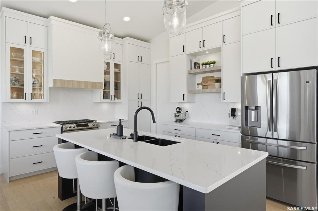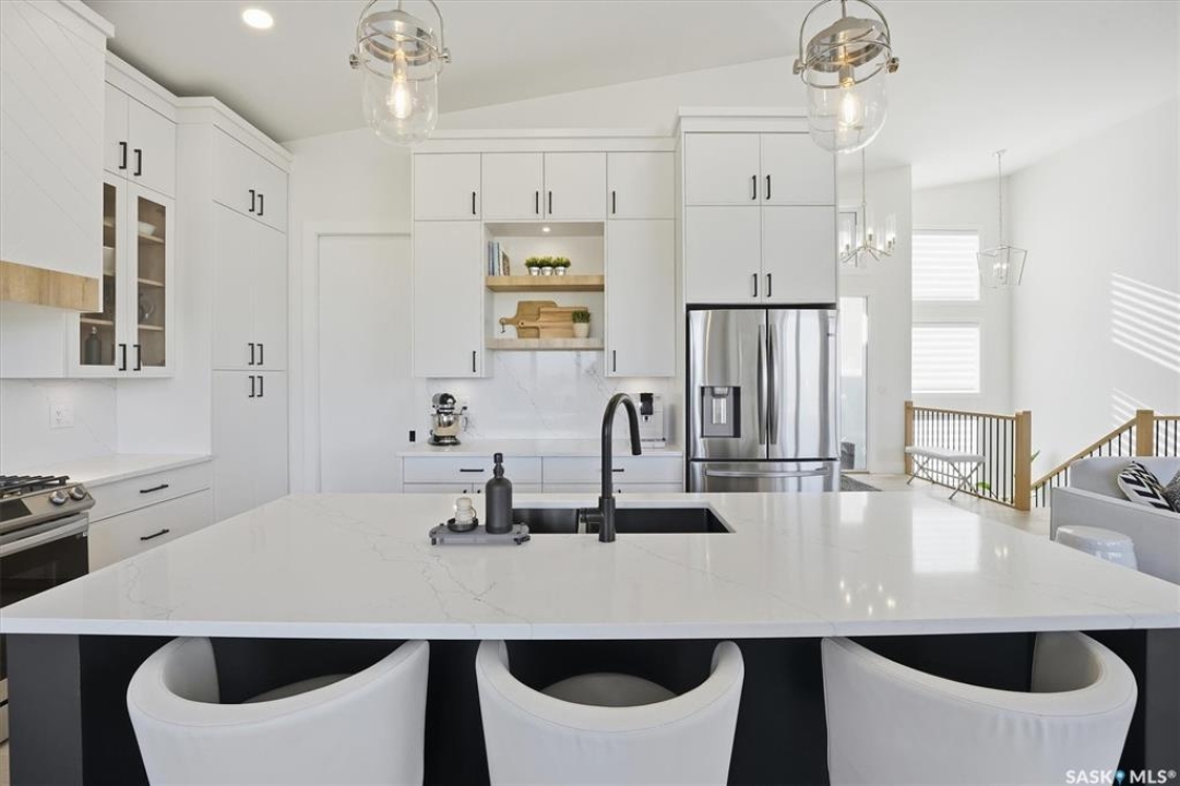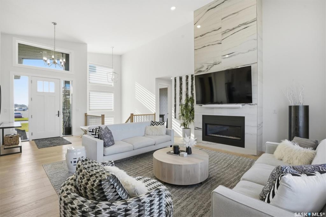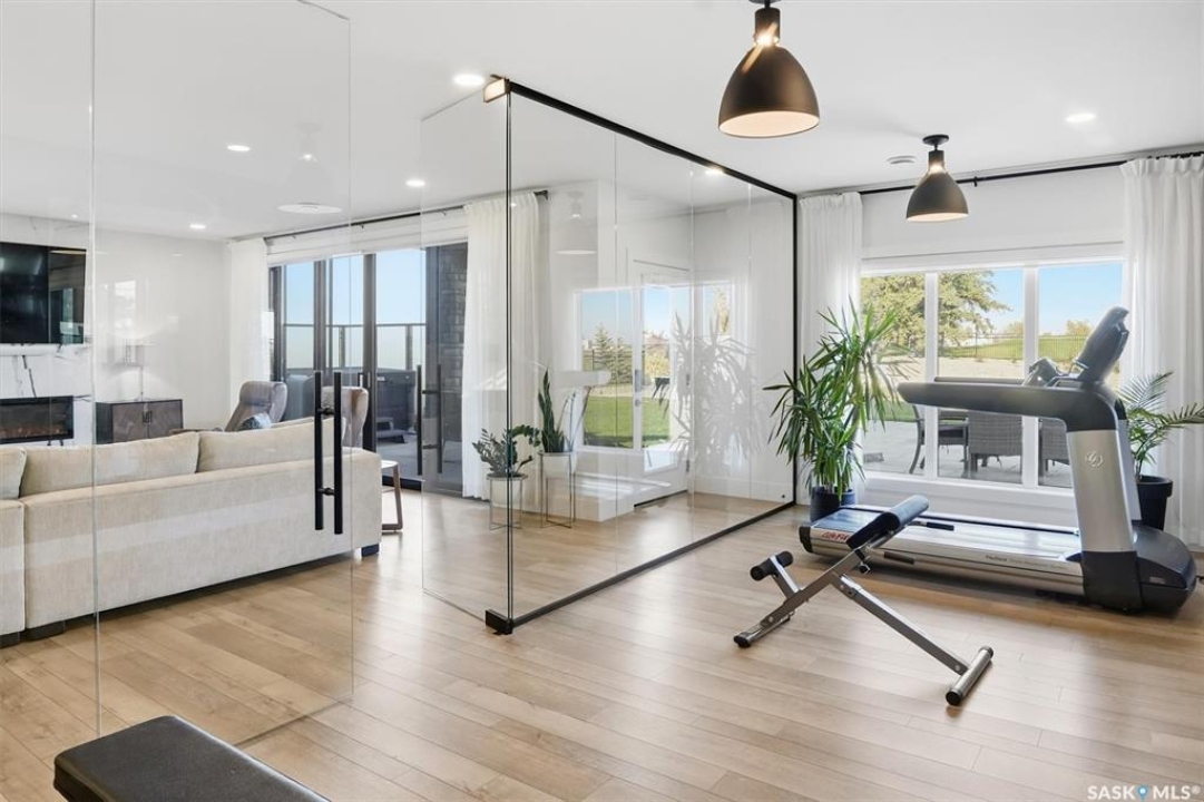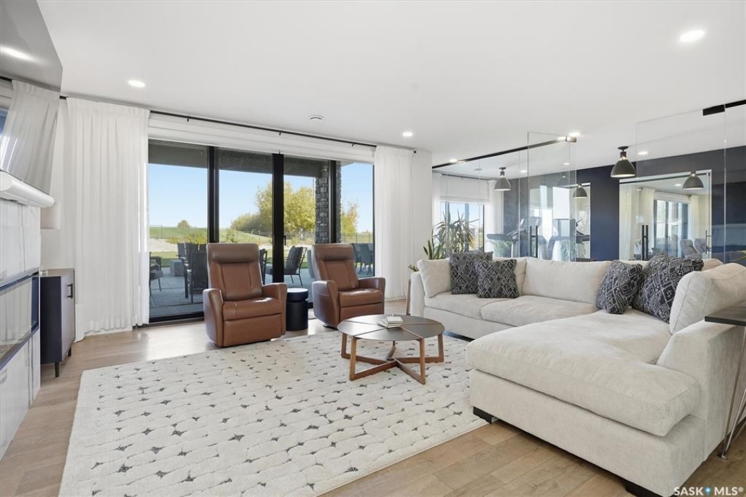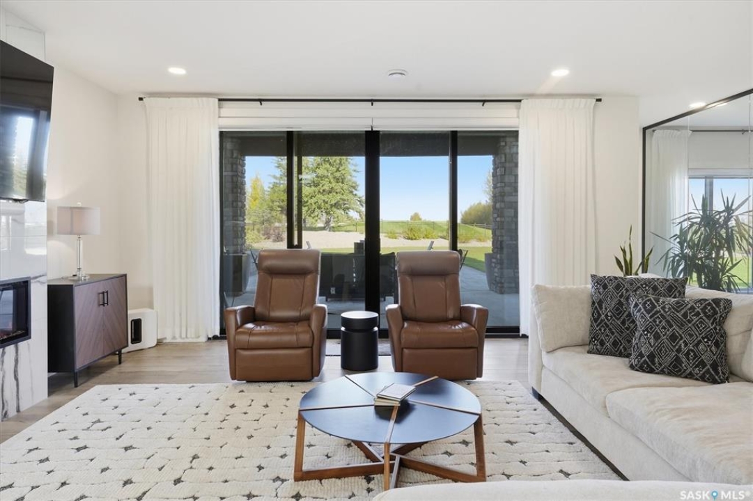 Absolute Stunner! Designer custom D&S Homes walkout bungalow, crafted with precision and showcasing an award-winning floor plan. Offering 1,694 sq ft on main plus a fully dev walkout basement, this 4-bed, 3 bath home is set on an expansive 17,000 sq ft lot backing the Greenbryre Golf Course — with no neighbouring homes in sight, only serene views of the course, a landscaped side buffer and open prairie fields. The entry opens into a breathtaking, light-filled great room with ultra-high soaring ceilings and a dramatic feature fireplace. The open-concept living, kitchen, and dining area is an entertainer's dream, wrapped in oversized windows overlooking the course. The chef's kitchen features soft-toned lacquer cabinetry with double-height uppers, quartz counters, full-height quartz backsplash, 5-burner gas range, walk thru pantry, a coffee bar, and a massive central island. The connected dining area is spacious enough for large gatherings and opens to a private covered deck for seamless indoor-outdoor entertaining.The main floor also includes a large boot room, a bright office, outfitted laundry room, and a luxurious primary suite complete with a fully tiled spa-style ensuite, walk-in shower, dual vanity, and walk-in. A striking custom staircase leads to the fully dev walkout level, which mirrors the quality of the main floor. This level offers a sprawling family room with a 2nd fireplace, floor to ceiling windows overlooking the show-stopping backyard, a wet bar with wine storage and seating area, and a dramatic full height glass-walled gym. 2 large bedrooms and a full bathroom complete this level. Additional highlights: • Professionally landscaped grounds • Heated double garage • Zoned in-floor boiler plus forced-air furnace • Instant hot water • Central air • Wired for a hot tub • Underground sprinklers, oversized concrete drive A tasteful masterpiece in design and function — this Greenbryre walkout is spectacular in every detail.