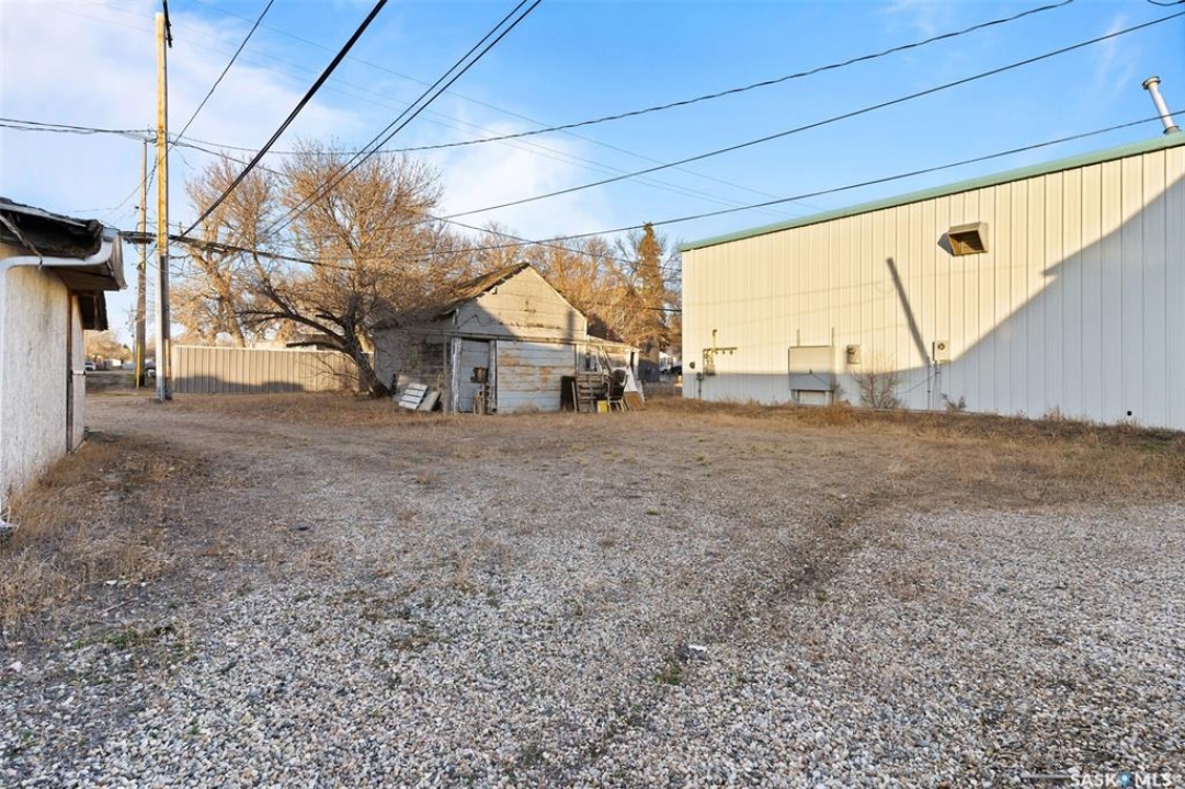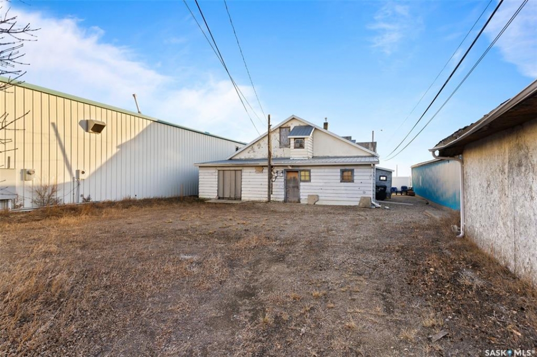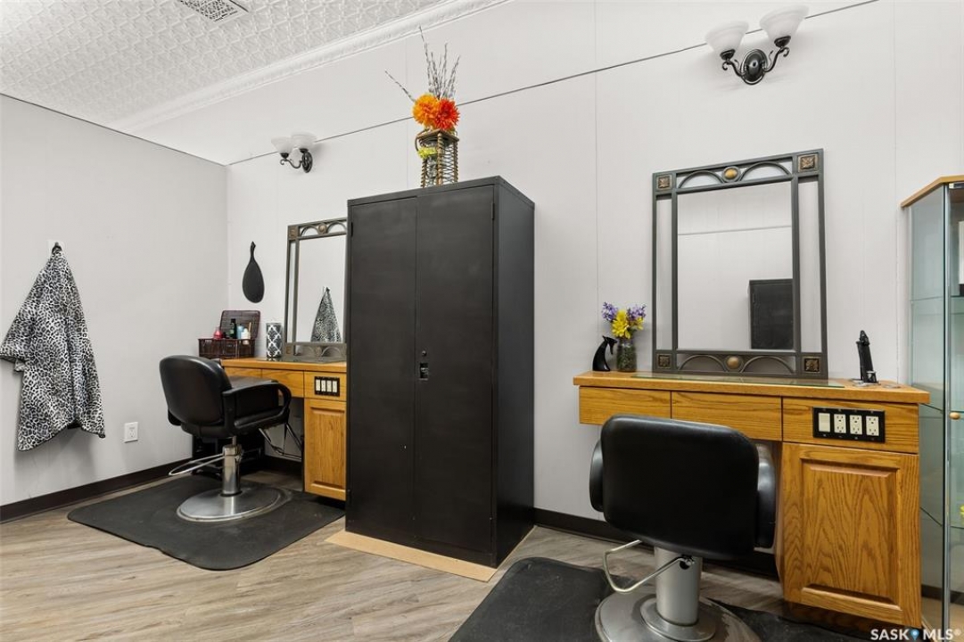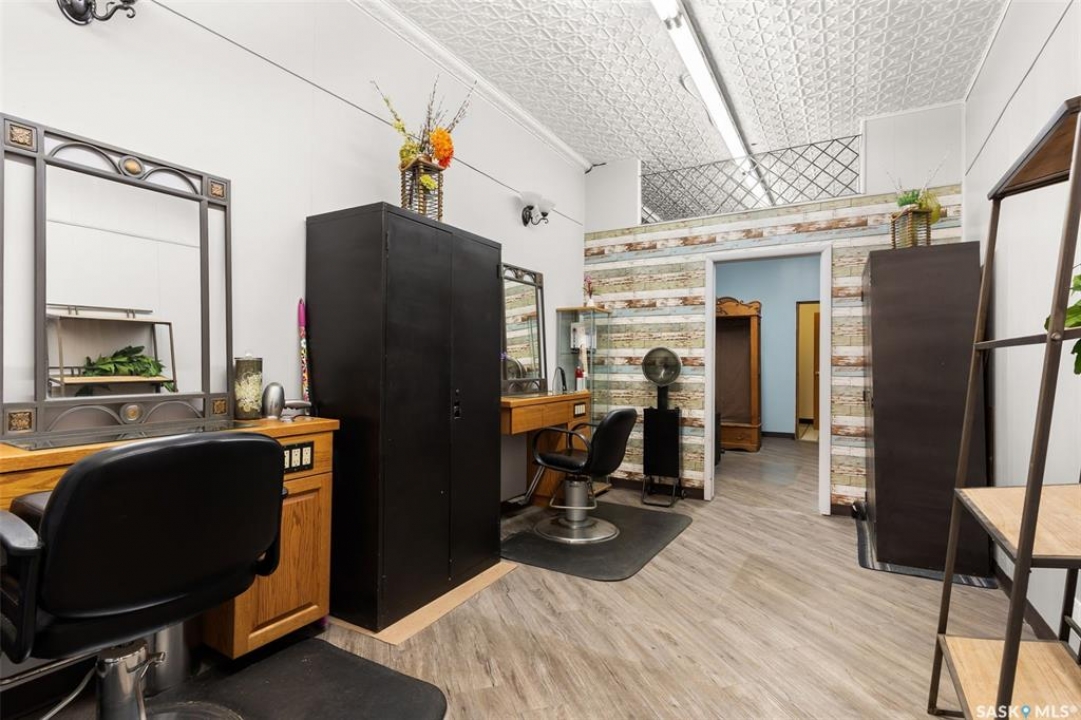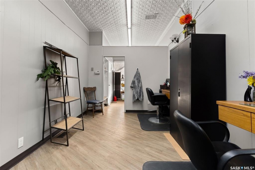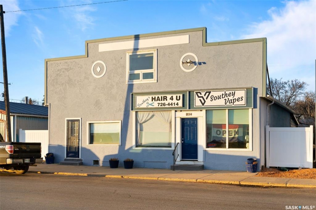 Located in Southey, SK on Railway Avenue with excellent site lines and visibility to Highway 6 is this 2,760 sqft mixed use commercial building. The building is comprised of 2 retail spaces and a 2 bedroom residential apartment. The end retail space is currently a tenant occupied vape shop. The tenant wishes to stay and is on a month to month lease. The vape shop was a former bakery and still has the commercial stainless steel sink and a gas line at the back that was used for the ovens. There is a dock door at the rear of the vape shop space. The centre retail space is a former hair salon that is in turn key condition with salon fixtures and plumbing in place. The salon has newer flooring, paint and a gorgeous tin ceiling. There is a laundry area at the rear of the hair salon plus a shared 2 piece bathroom for both retail areas to use. The salon space could be converted to other commercial uses. The residential quarters is spacious and filled with lots of light. It has been tastefully updated with newer flooring, paint, and updated 4-pce bathroom. The kitchen is fresh and bright with loads of cabinetry and kitchen appliances are included. The residence has one bedroom on the main floor and a second bedroom plus sitting room/den and a bonus room located on the second floor. There is a large storage area at the back of the building that can be shared. The building sits on 2 lots and there is ample parking in the rear for tenants accessed via the back alley. There is also an older garage at the rear that is currently being used for storage.