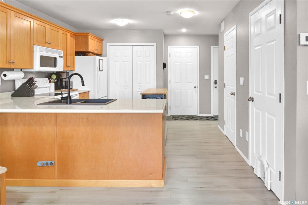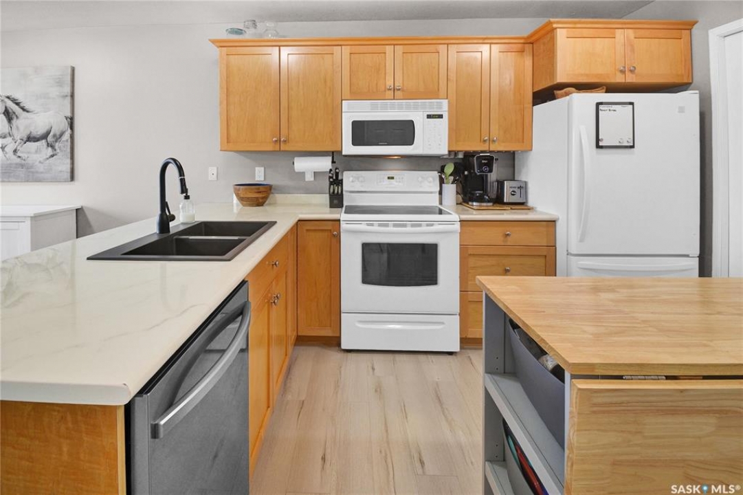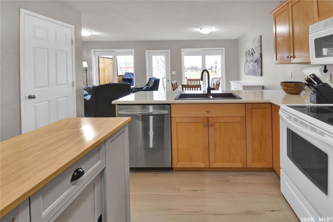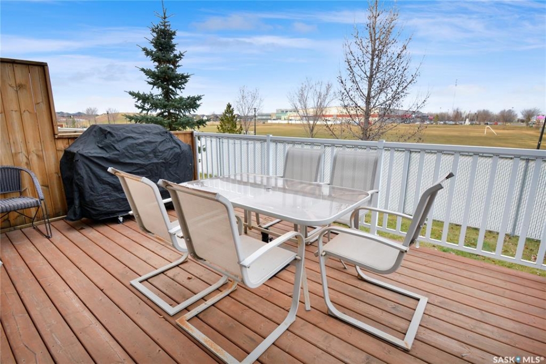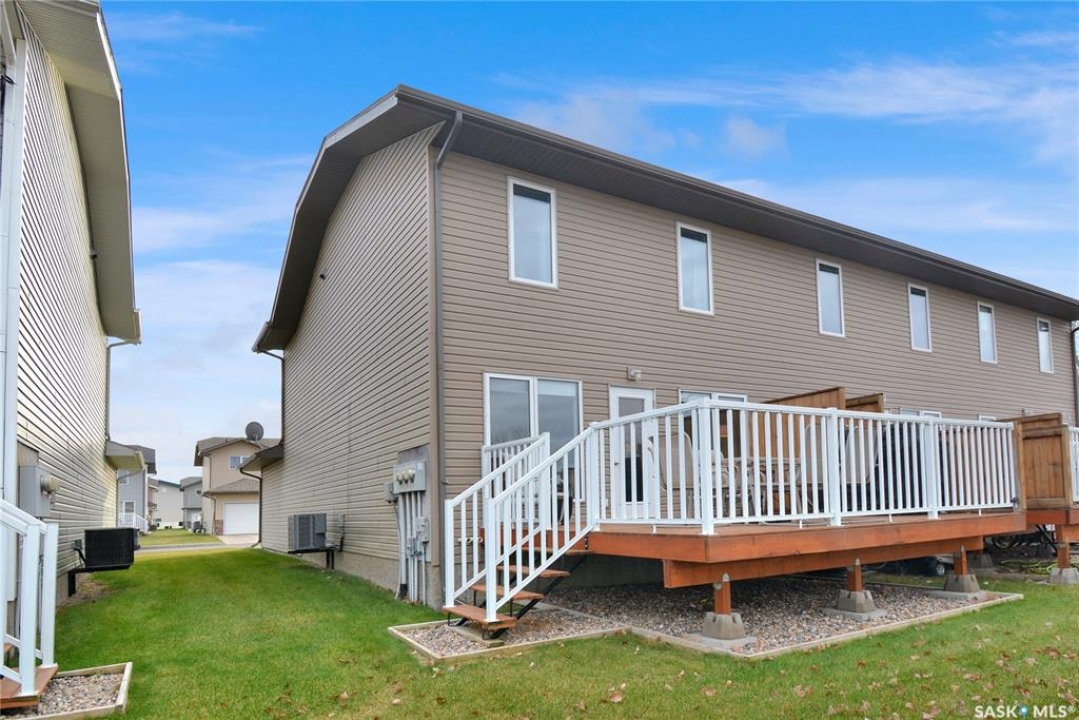 Welcome to this wonderful Warman 2 storey townhouse. Location of this unit can not be beat, facing south with a single attached garage, and back on to a public park, Communiplex, library and school. After entering this home, you walk into a bright open concept kitchen, dining, living room, powder room with light colored laminate flooring that was installed in 2025. With maple cabinets in the kitchen and an accent island for additional counter space and seating, large pantry, counter seating on the peninsula, epoxied countertop, newer sink and dishwasher, this kitchen gives you all you would need and more. The living space is lit up with large windows and space for ample seating. The deck is exceptionally large at 15'5” x 12' as this is an end unit, giving you more enjoyable entertainment space. The second floor had the carpet updated in 2022 and offers 3 good sized bedrooms and 4 piece bath that has newer flooring and countertops. The basement houses the laundry facilities and is unfinished ready to be developed with rough in plumbing for another bath. The furnace and water heater have been updated. Condo fees are $285.00/month. Rental of additional parking spot is possible. With this home being recently painted and most of the light fixtures updated, all that the new owner would have to do is move in