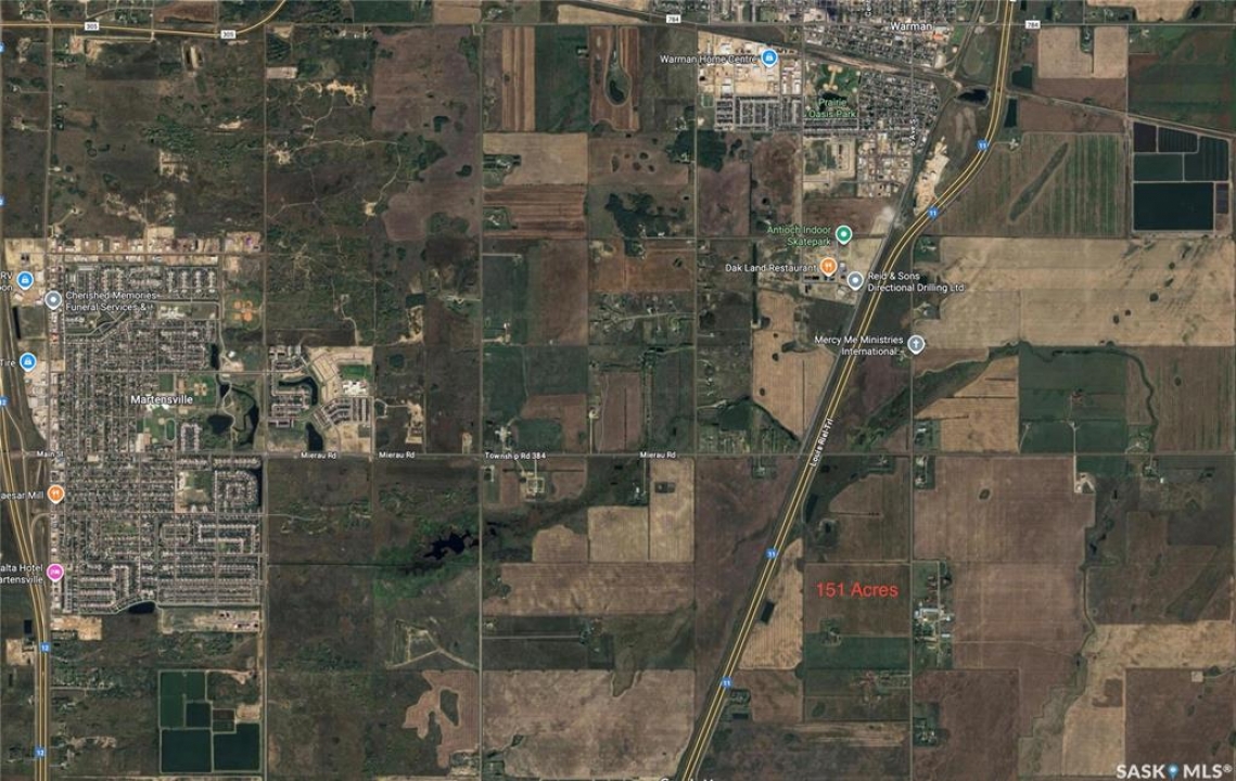 Prime Agricultural and Investment Opportunity – 151 Acres Near Warman Location: 2.5 miles south of Warman, 1 mile east of Highway 11 Presenting a rare opportunity to own 151 acres of flat, highly productive farmland, strategically located just south of Warman and easily accessible via Highway 11. This expansive parcel is ideal for agricultural use, investment purposes, or future development, offering significant potential in a growing region. The property is divided into 5 separate parcels, with zoning under DAG 1, which offers flexibility for a variety of uses, from farming to future residential or commercial development. With power and gas already on or close by this land is ready for immediate use or future planning. Notably, the land sits directly across the road from the well-known Twin Peaks Creamery, a local landmark that may offer additional exposure and opportunities for future business ventures. Whether you're looking to expand your agricultural operations, secure a long-term investment, or develop a piece of land in an area poised for growth, this property offers an exceptional foundation. With its flat topography, excellent soil, and close proximity to Warman, this is a rare find in a highly sought-after location . Buyer is responsible for all GST. Assessments and taxes were calculated on a per acre basis. This property is sure to appeal to a wide range of buyers. Don't miss out on this incredible opportunity.