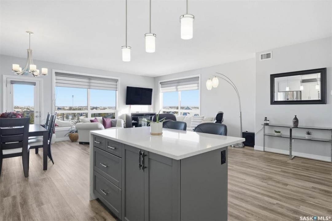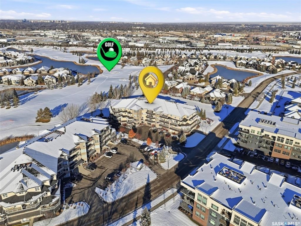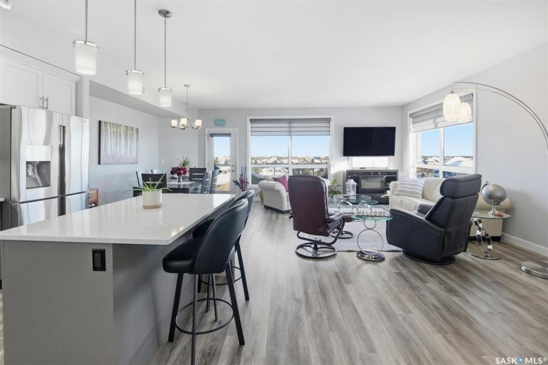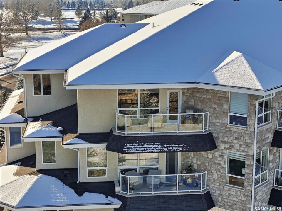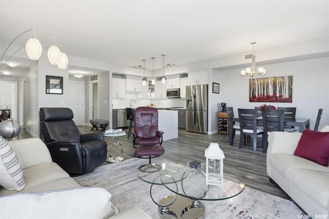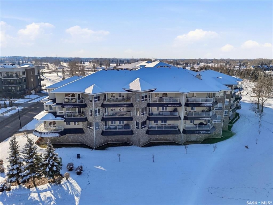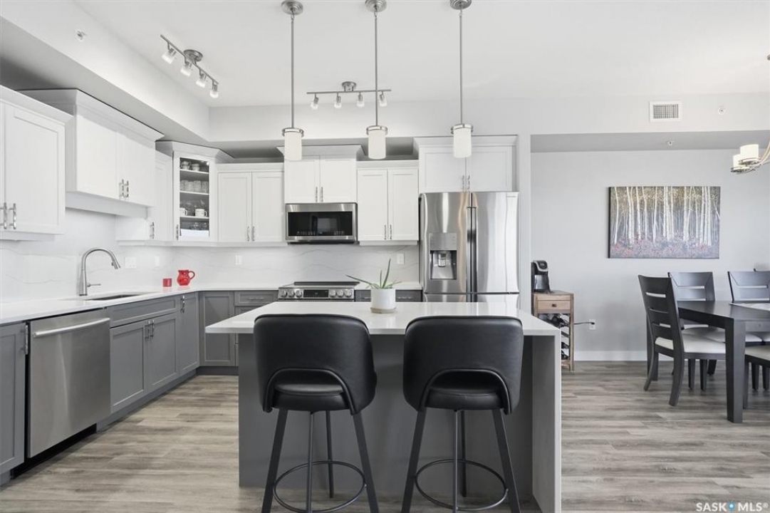 Discover this beautifully upgraded top-floor corner unit in Woodbridge II, a premier luxury condo building in The Willows by Valentino Homes. Enjoy spectacular views of The Willows Golf Course and the surrounding community, enhanced by abundant natural light from the south, east, and west exposures. With 1,565sqft �of living space, large windows, and 9-ft ceilings create a bright, open atmosphere throughout. The living room, dining area, kitchen, and den all feature upgraded luxury vinyl plank flooring and fresh paint. The stylish kitchen showcases refaced cabinets, quartz countertops and backsplash, a spacious island with a quartz waterfall feature, and stainless steel appliances—all seamlessly connected to the main living space. This unit includes two bedrooms plus a den, providing flexibility for work or guests. Both bathrooms are updated with ceramic tile flooring, new lighting, and quartz countertops. The primary suite stands out with upgraded built-in cabinetry, dual sinks with prep area, a full-sized shower, and a generous walk-in closet. Additional high-end upgrades include Hunter Douglas remote-controlled blinds—plus blackout blinds in the bedrooms—and a newer central air conditioning system. The laundry/storage room offers a newer washer and dryer and a custom cabinet with slide-out shelving. Step onto the deck to enjoy the views, complete with a natural gas BBQ hookup. Convenience continues with one underground parking stall, one surface stall, and an impressive two-level storage room offering nearly 100 sq. ft. of space. Pets are welcome with board approval. This exceptional unit delivers comfort, style, and an unbeatable location in one of Saskatoon's most desirable communities.