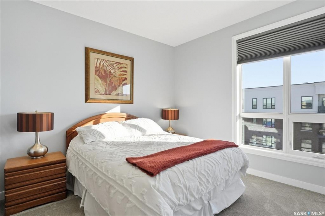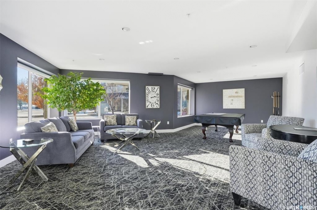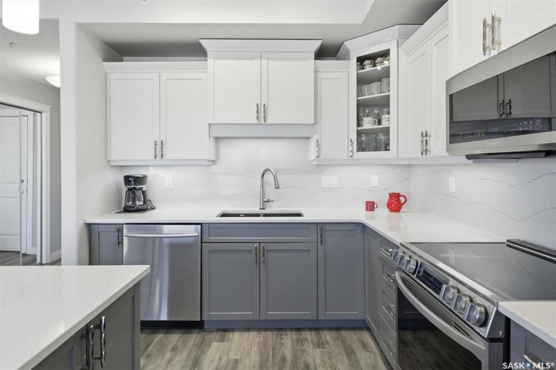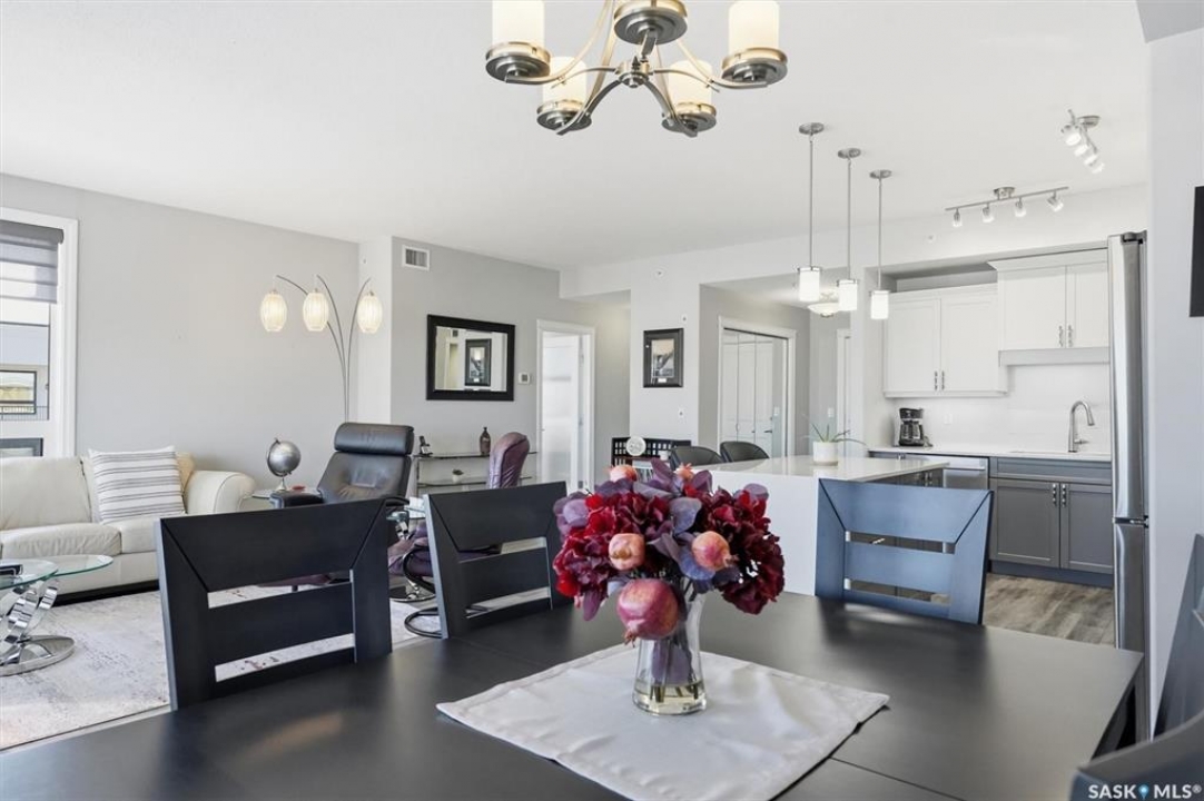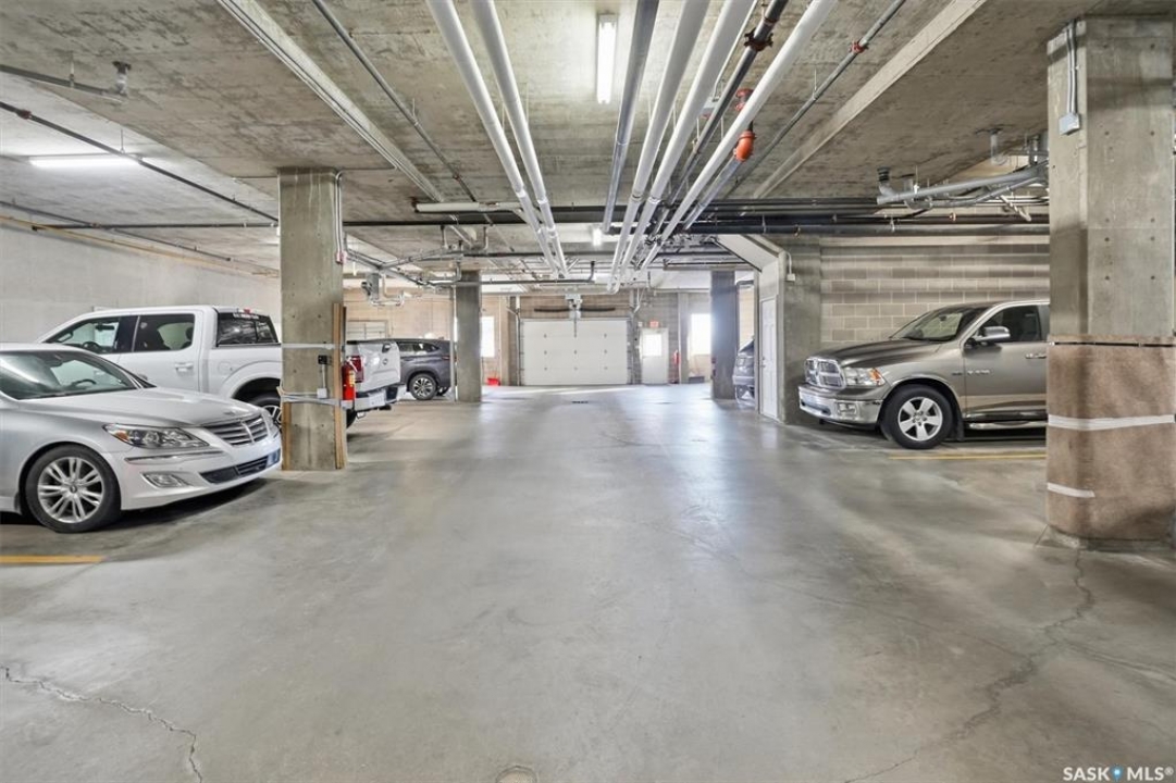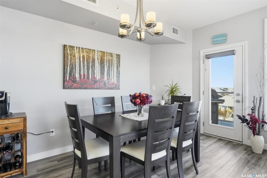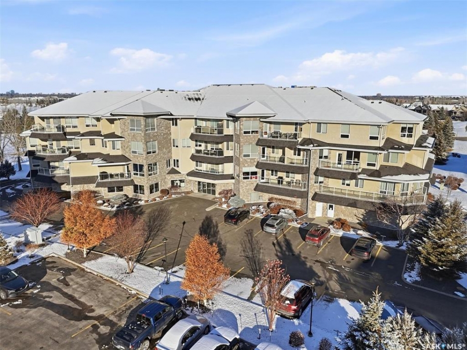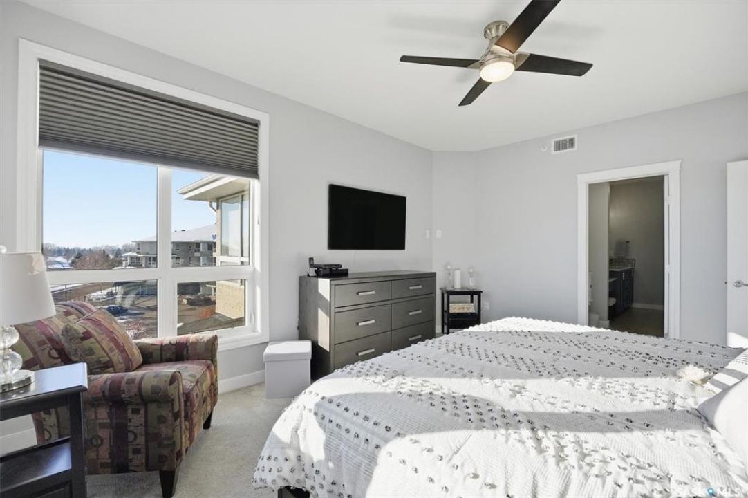 Discover this beautifully upgraded top-floor corner unit in Woodbridge II, a premier luxury condo building in The Willows by Valentino Homes. Enjoy spectacular views of The Willows Golf Course and the surrounding community, enhanced by abundant natural light from the south, east, and west exposures. With 1,565sqft �of living space, large windows, and 9-ft ceilings create a bright, open atmosphere throughout. The living room, dining area, kitchen, and den all feature upgraded luxury vinyl plank flooring and fresh paint. The stylish kitchen showcases refaced cabinets, quartz countertops and backsplash, a spacious island with a quartz waterfall feature, and stainless steel appliances—all seamlessly connected to the main living space. This unit includes two bedrooms plus a den, providing flexibility for work or guests. Both bathrooms are updated with ceramic tile flooring, new lighting, and quartz countertops. The primary suite stands out with upgraded built-in cabinetry, dual sinks with prep area, a full-sized shower, and a generous walk-in closet. Additional high-end upgrades include Hunter Douglas remote-controlled blinds—plus blackout blinds in the bedrooms—and a newer central air conditioning system. The laundry/storage room offers a newer washer and dryer and a custom cabinet with slide-out shelving. Step onto the deck to enjoy the views, complete with a natural gas BBQ hookup. Convenience continues with one underground parking stall, one surface stall, and an impressive two-level storage room offering nearly 100 sq. ft. of space. Pets are welcome with board approval. This exceptional unit delivers comfort, style, and an unbeatable location in one of Saskatoon's most desirable communities.