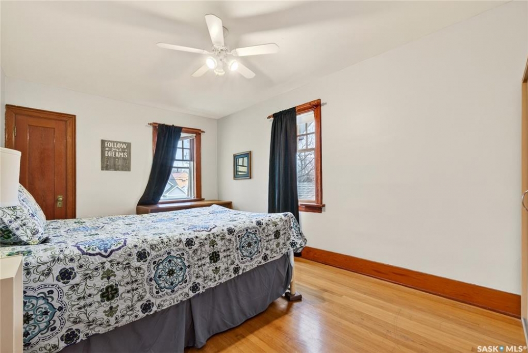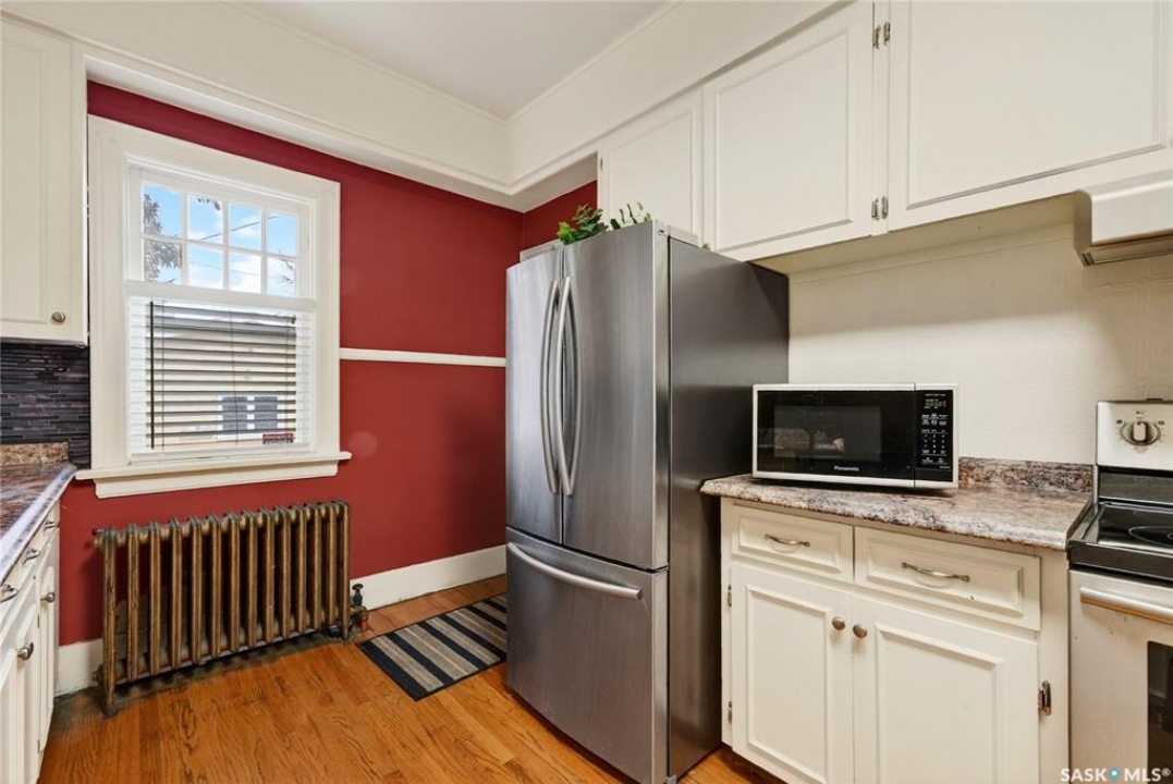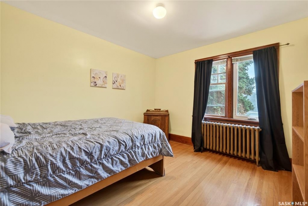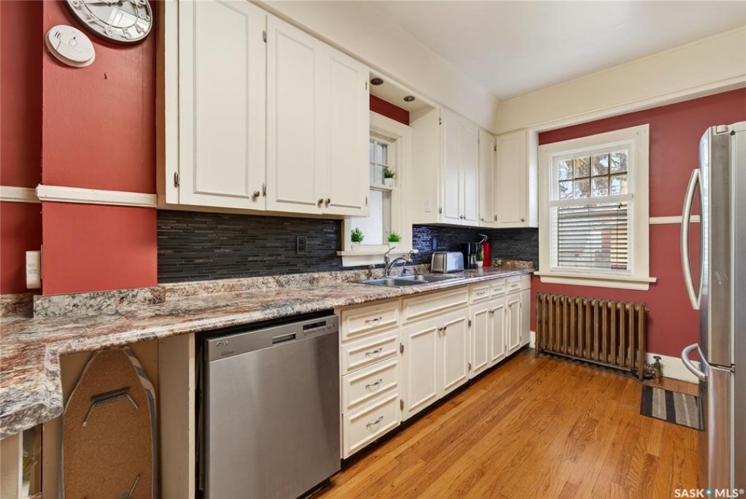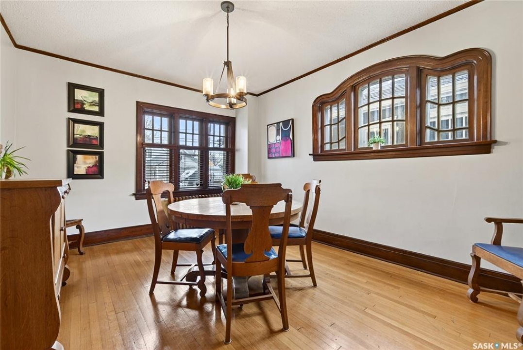 Welcome to this beautiful 1,675 sq. ft. well cared for character home, where charm and warmth meets thoughtful upgrades. Step into the generous entryway, a welcoming space for guests to shed coats and shoes before moving into the heart of this stunning residence. Original hardwood floors flow gracefully across both levels, complemented by bevelled glass doors, rich wood trim, and elegant archways that highlight the home's craftsmanship. The main living room is anchored by a unique gas fireplace, crafted with reclaimed wood from the historic Lumsden elevator—a great conversation piece for cozy nights. Just beyond, the bright south-facing office offers an inspiring workspace and the perfect haven for your indoor greenery. Gatherings are effortless in the spacious dining room, ideal for holiday feasts or casual weekly entertaining. The kitchen features white cabinetry, stainless steel appliances, a double oven, and ample counter space. An eat-up breakfast bar invites conversation and connection while meals are prepared. Upstairs, the expansive primary bedroom includes a walk-in closet, while two additional bedrooms and a 4-piece bath with cast iron tub and updated tiles complete the second floor. The fully finished basement is a true bonus, warmed with in-floor radiant heat. With a kitchen area, family room, fourth bedroom, 4-piece bath, and laundry, it offers excellent potential as a roommate suite or guest retreat. Notable updates to the home include a durable metal roof and a high-quality Viessmann boiler , electric panel. Outdoors, the private backyard is perfect for summer relaxation on the low-maintenance deck. An oversized single garage adds even more value to this rare find. If you're seeking a well-maintained character home close to downtown, this gem may be for you!