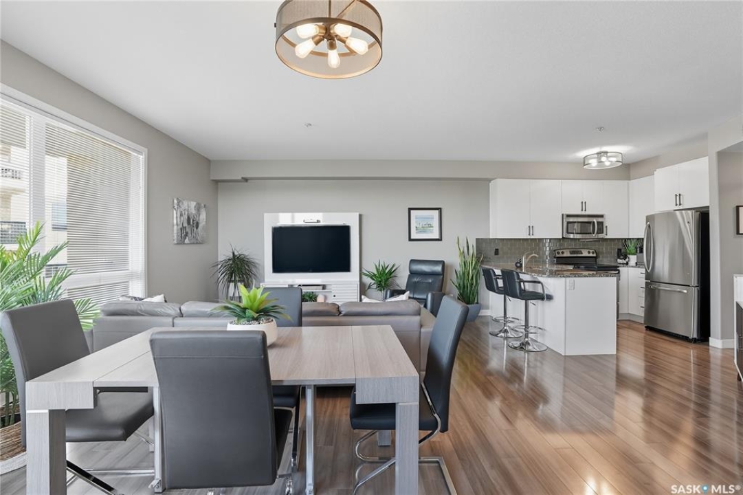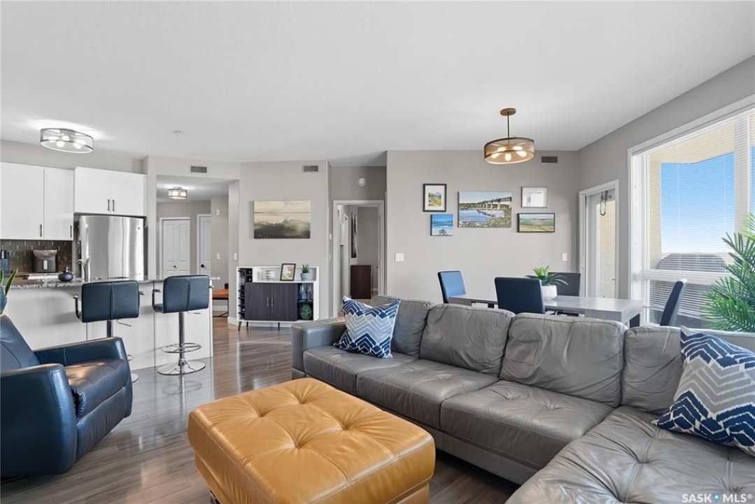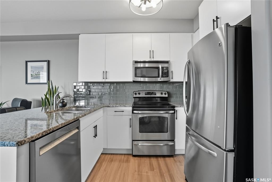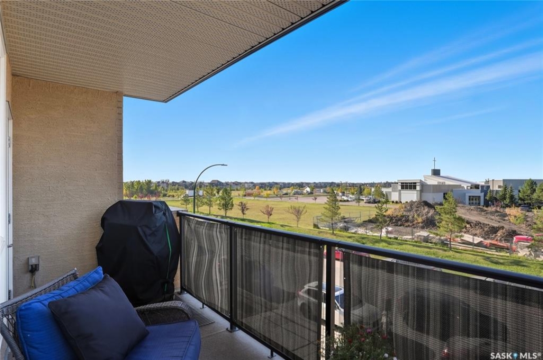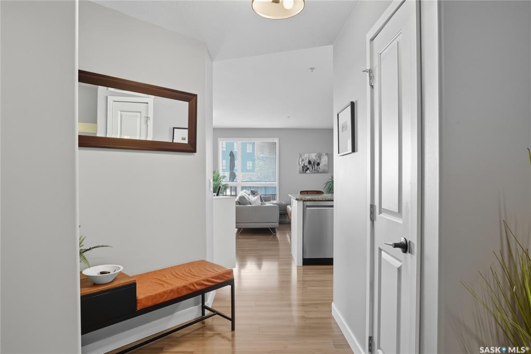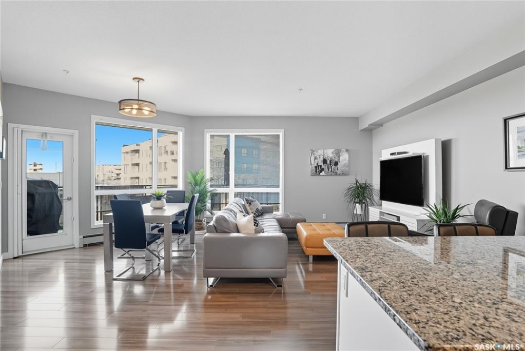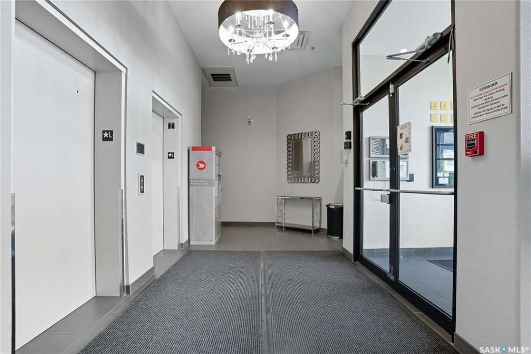 Don't miss out on this beautifully appointed condo located in the desirable east end of Saskatoon. This 2 bedroom, 2 bathroom corner unit features an open concept layout with beautiful modern finishes and plenty of natural light. As you step into the unit, you are greeted by a spacious foyer with a large coat closet and convenient in-suite laundry. The open-concept living and dining area is perfect for entertaining guests, with views overlooking the green space across the road and patio doors leading out to a private corner balcony (storage room on the balcony). The modern kitchen boasts a timeless appearance with stainless steel appliances, sleek but classy cabinetry, and a nicely sized island for casual dining. The primary bedroom features a walk-in closet and a 3-piece ensuite bathroom with a walk-in shower. The second bedroom is also a good size and is serviced by a 4-piece bathroom. Additional features of this unit include air conditioning, underground parking, and a bonus above-ground stall as well. Located just steps away from shopping, restaurants, and public transportation, this stunning condo offers a convenient, low-maintenance lifestyle for those looking to downsize or enter the property market. Don't miss out on this fantastic opportunity to own a beautiful condo in a sought-after location.