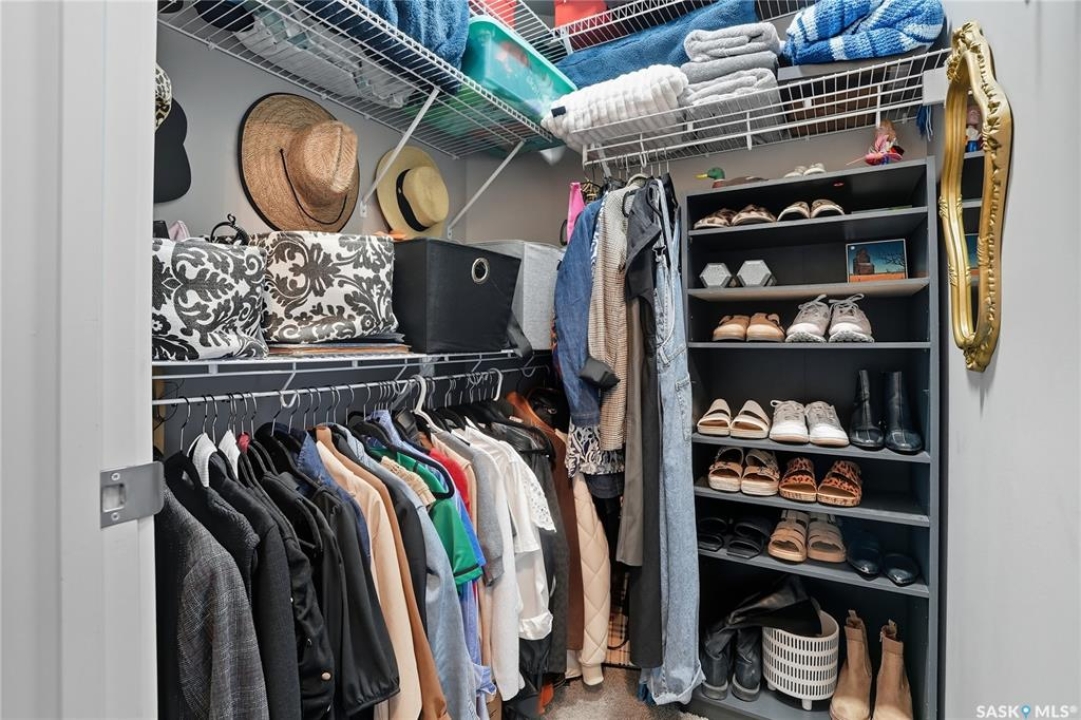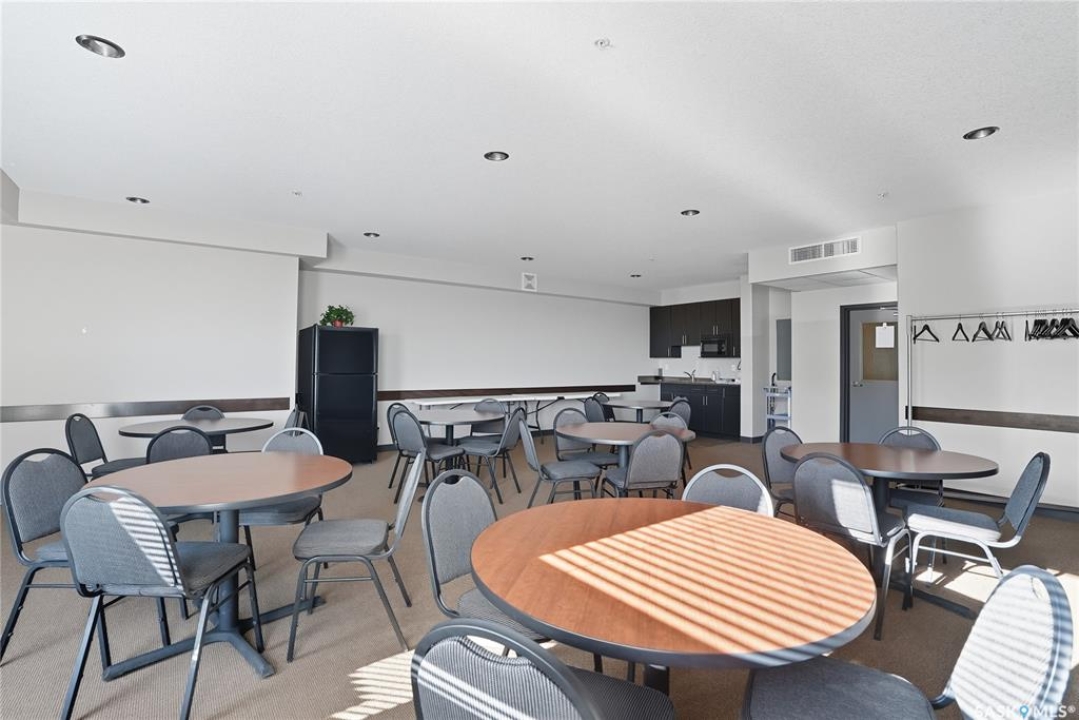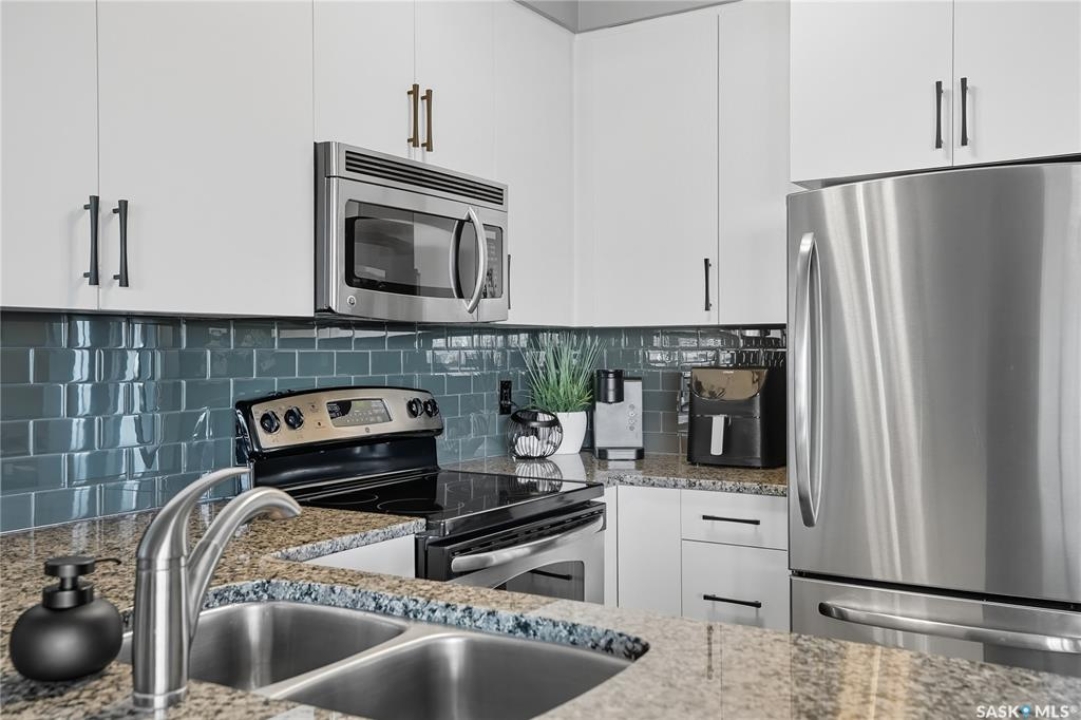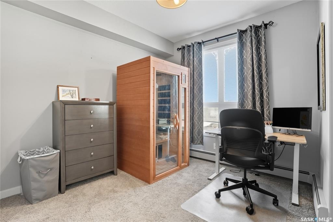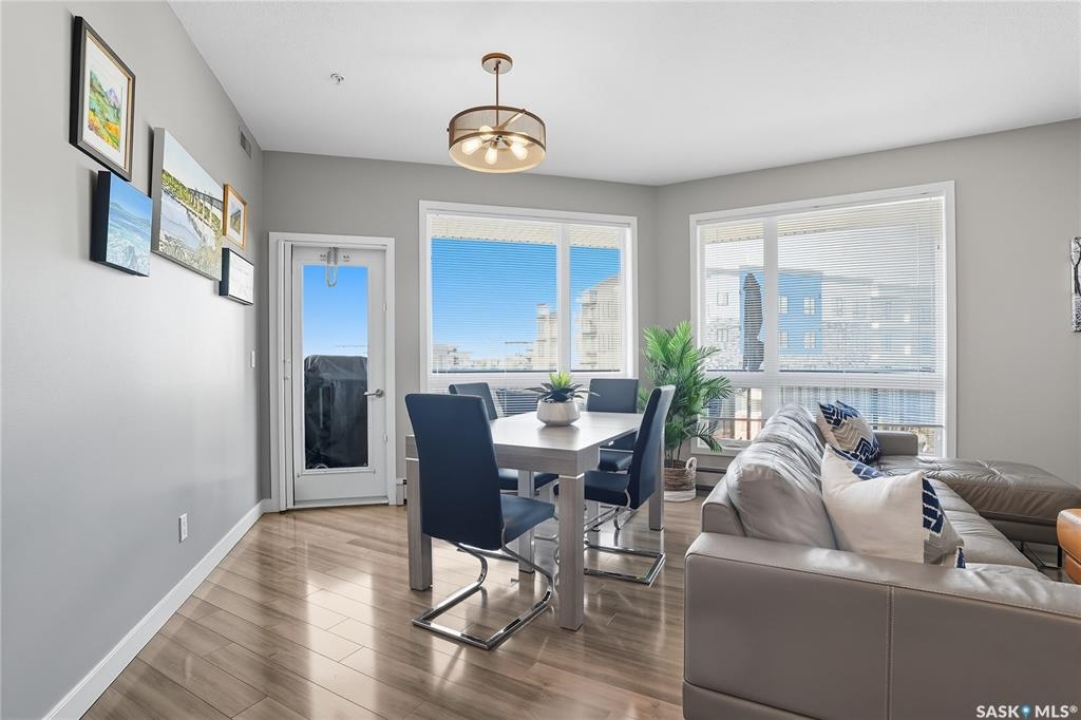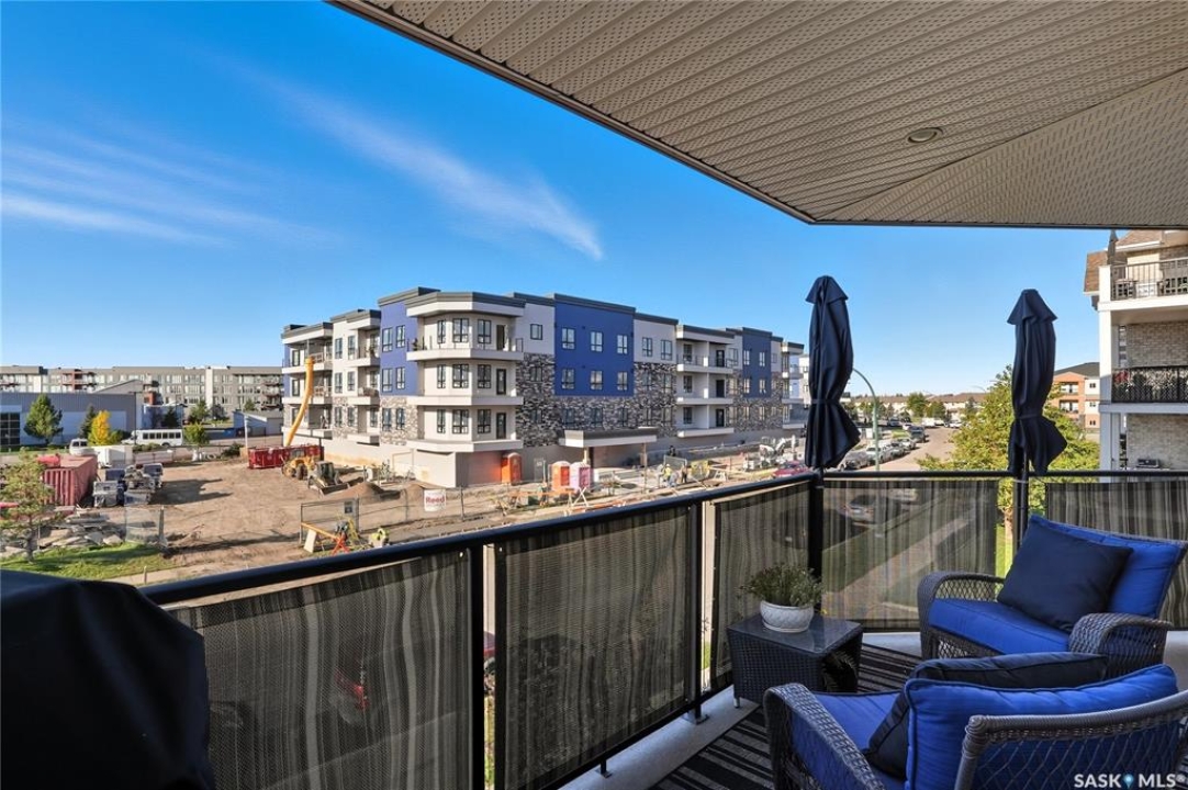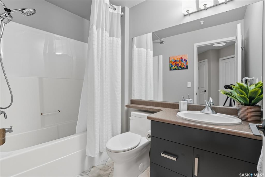 Don't miss out on this beautifully appointed condo located in the desirable east end of Saskatoon. This 2 bedroom, 2 bathroom corner unit features an open concept layout with beautiful modern finishes and plenty of natural light. As you step into the unit, you are greeted by a spacious foyer with a large coat closet and convenient in-suite laundry. The open-concept living and dining area is perfect for entertaining guests, with views overlooking the green space across the road and patio doors leading out to a private corner balcony (storage room on the balcony). The modern kitchen boasts a timeless appearance with stainless steel appliances, sleek but classy cabinetry, and a nicely sized island for casual dining. The primary bedroom features a walk-in closet and a 3-piece ensuite bathroom with a walk-in shower. The second bedroom is also a good size and is serviced by a 4-piece bathroom. Additional features of this unit include air conditioning, underground parking, and a bonus above-ground stall as well. Located just steps away from shopping, restaurants, and public transportation, this stunning condo offers a convenient, low-maintenance lifestyle for those looking to downsize or enter the property market. Don't miss out on this fantastic opportunity to own a beautiful condo in a sought-after location.