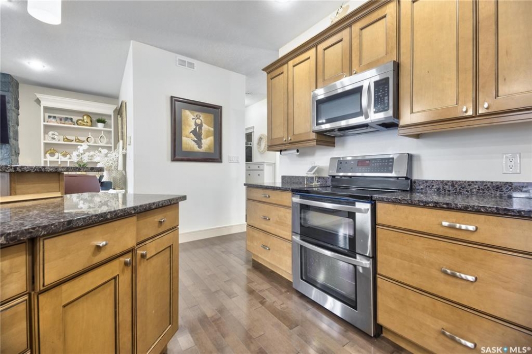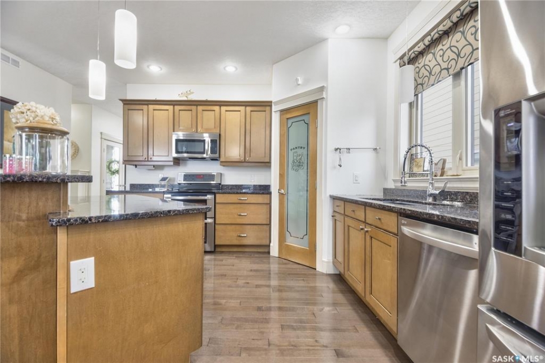 Discover a beautifully crafted South Hill bungalow offering 1,462 sq. ft. of refined living, built in 2013 with impressive attention to detail. Soaring 9-ft ceilings on both levels pair beautifully with rich maple hardwood flooring, while built-in cabinetry throughout the home adds both elegance and everyday functionality—including a thoughtfully designed laundry space on the main level that blends seamlessly with the home's custom millwork. The gourmet maple kitchen showcases sleek granite countertops, carried seamlessly through every bathroom and vanity. The sunlit main living area is anchored by a stunning natural gas fireplace featuring a full stone surround and custom built-in bookshelves, creating a warm and inviting focal point. The spacious primary suite offers a luxurious three-piece walk-in shower, and the fully finished basement expands the living space with a stylish electric fireplace. High-end casing and expert craftsmanship are evident throughout. Step outside to an east-facing, fully fenced, and professionally landscaped backyard with a natural gas hookup on the covered rear deck—perfect for morning sun and evening relaxation. The heated and insulated attached double garage adds comfort and practicality, while the stone and hardy board exterior provides timeless curb appeal. Located directly across from the Rotary Trail and steps from all South Hill amenities, this sought-after property blends upscale finishes with an unbeatable location—a standout offering in the community.