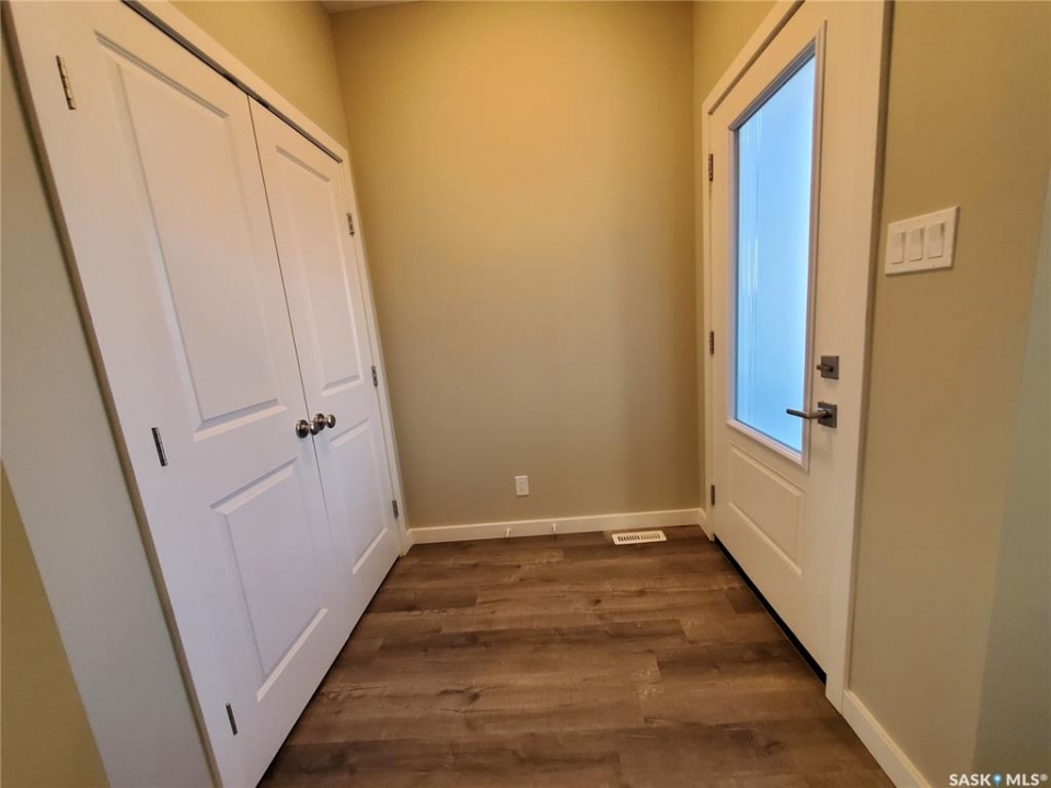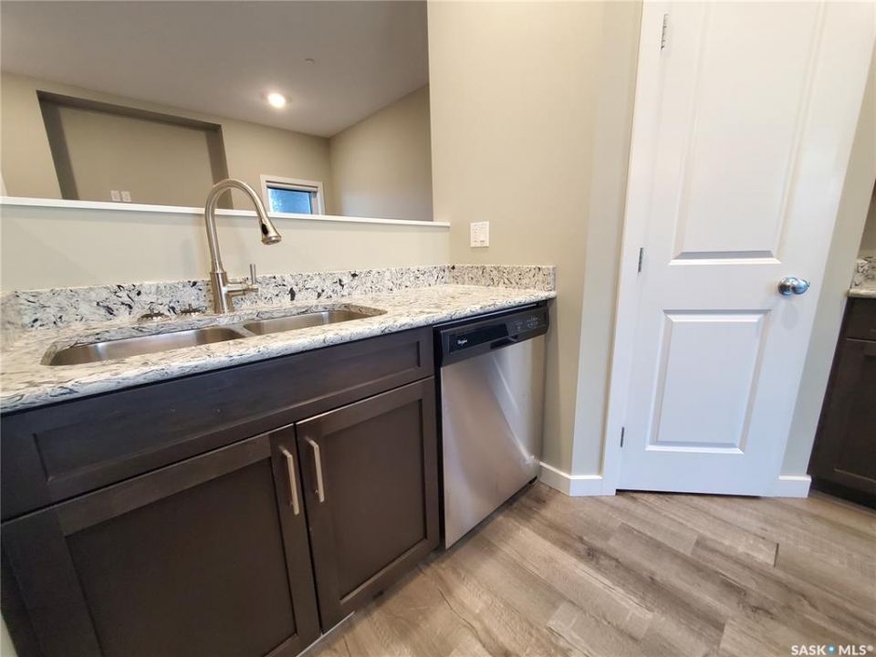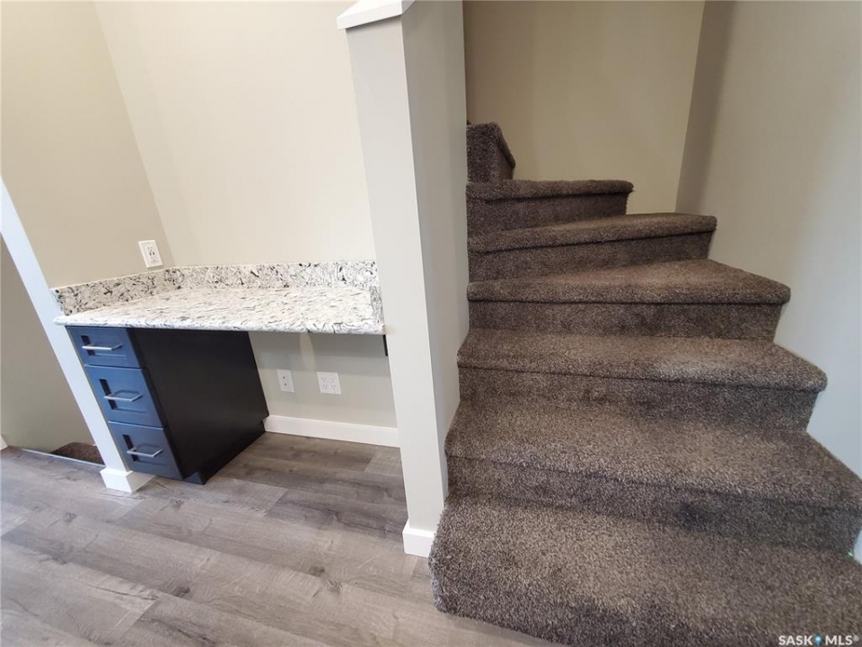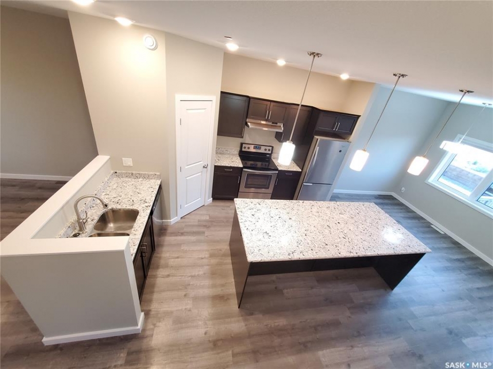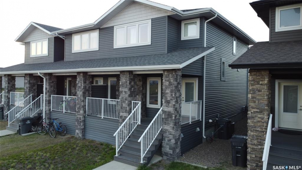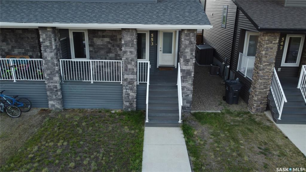 This standout end unit townhome at 553 Douglas Drive, Swift Current, combines quality craftsmanship, a prime Sask Valley location, and a layout designed for everyday ease. The elevated front deck looks out toward Ecole Centennial School, giving you a pleasant view before you even step inside. The main floor offers a smooth, open flow with a welcoming living room leading into a sharp-looking kitchen featuring dark, rich-looking cabinetry, stainless steel appliances, granite counters, a four-seat island, and a built-in desk for quick tasks. The bright dining area opens to a private back deck, fenced yard, and double gravel parking, while the rear entry brings extra storage, a plug-in for your deep freeze, and a handy half bath. Upstairs, you will find two comfortable secondary bedrooms, including one with a walk-in closet, the laundry area, and a full bathroom, followed by a generous primary suite with its own spacious walk-in. The finished basement rec room adds bonus living space with a bathroom already roughed in. The home's mechanicals include a heat recovery unit, a high-efficiency furnace, central air conditioning, underground sprinklers, a fire suppression system, and hard-wired smoke detectors to complete a package that is comfortable, convenient, and safe. If you want a home that performs as well as it looks, this is the one to move on before someone else does.