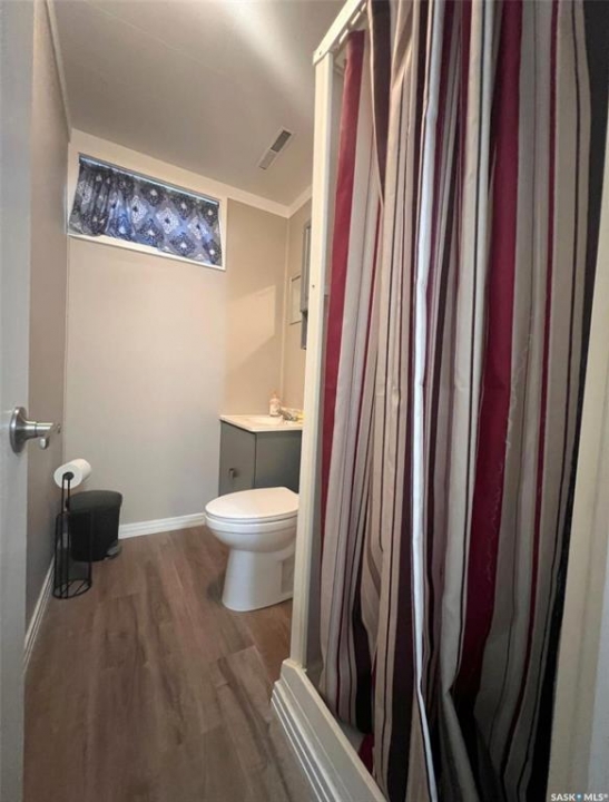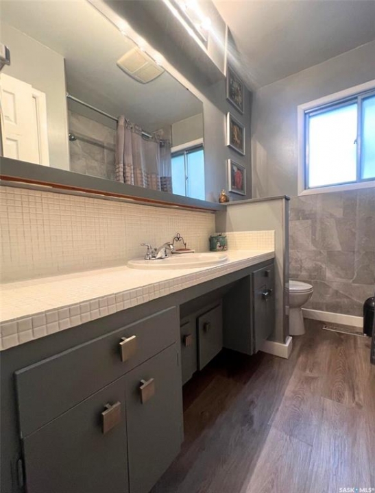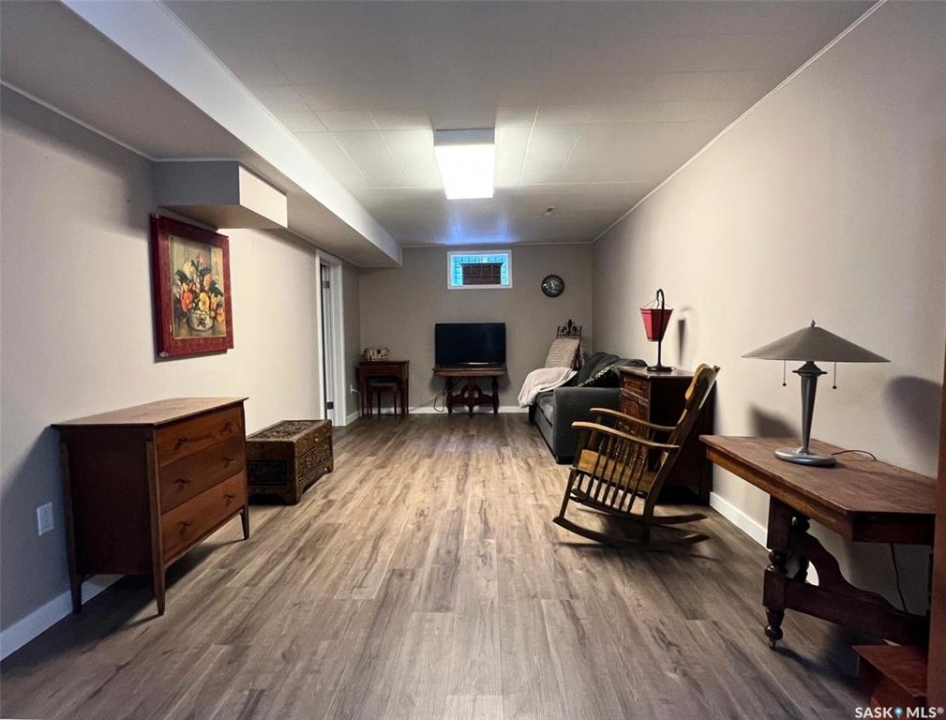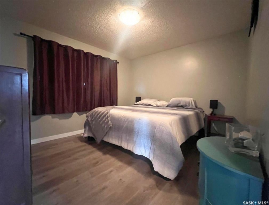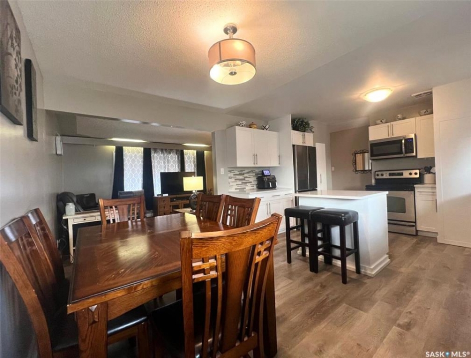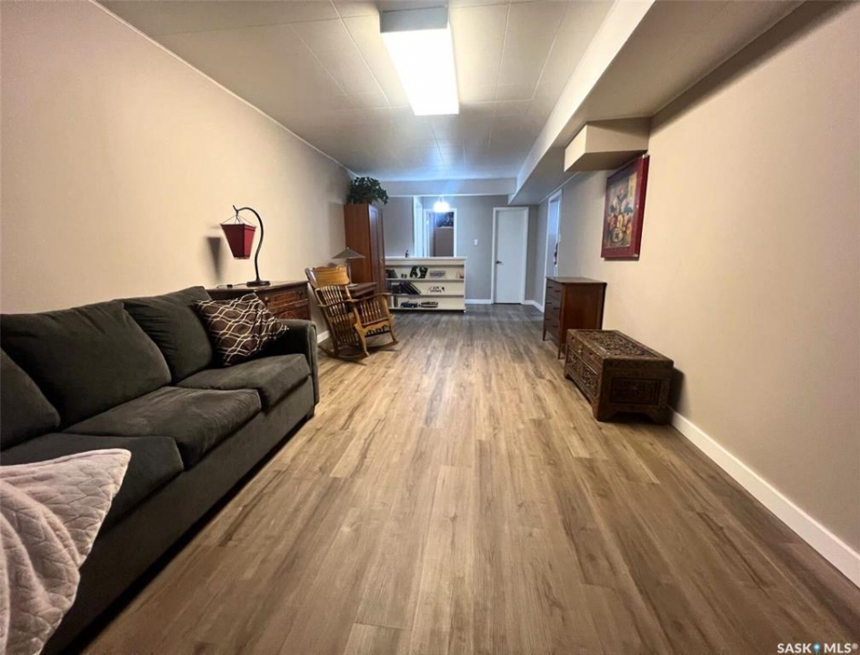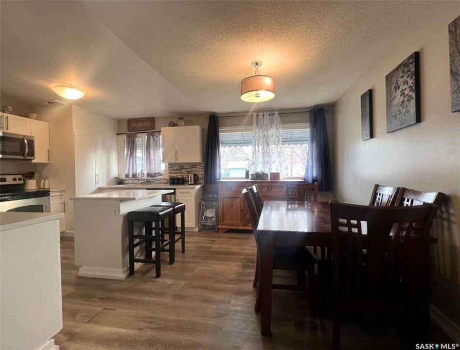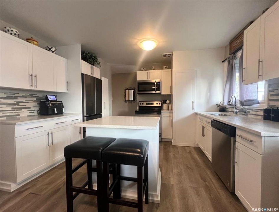 This updated and pleasant four-bedroom, two-bathroom bungalow features a comfortable layout and rests on a lot which hosts a single-car detached garage with a metal roof, a yard with brick patio and it is framed with maintenance-free fencing. Inside the front door the entry has a coat nook to the left, looking straight ahead you will see the back entrance, while to your right the living room features a bright west-facing picture window. Vinyl plank flooring wraps around to the dining room and to the lovely, updated kitchen which features new cabinetry with soft-close drawers, quartz countertops, stainless steel appliances, an island with an overhang for bar-height seating, and a large window looking outside to the backyard. Down the hallway there is a storage closet, and the spacious master bedroom rests across the hall from the other main-floor, comfortable-sized bedroom. The 4-piece bath showcases an elegant marble-like tiled shower and partially tiled walls. Downstairs, the laundry room sits to the left at the bottom of the stairs, and nearby is the family room which is suitable as a TV room or home gym space, there are two additional bedrooms, and a 3-piece bathroom. The basement also features updated vinyl-plank flooring throughout. Other features/updates include a water heater(2021), reverse osmosis water system, central vac. Call for more info or to book your own personal showing!