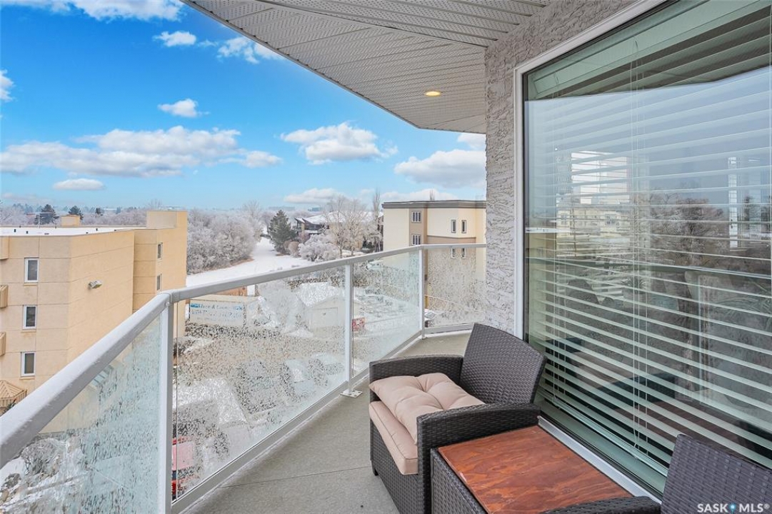 Top floor corner 2 bedroom & den with wrap-around covered balcony; ideal for those looking to simplify without sacrificing space or quality. Welcome to this beautifully bright and thoughtfully updated condo offering an open airy layout, with generous sized rooms, vaulted ceilings, and plenty of natural light with views overlooking the park. The modern kitchen is a standout feature, offering ample storage, updated 2-tone cabinetry, quartz counters, under cabinet lighting & textured subway tile backsplash. Whether you enjoy cooking or prefer easy, low-maintenance meals, this kitchen supports both with ease. The open dining and living areas flow seamlessly together, making it effortless to entertain family and friends or simply enjoy a quiet evening at home. Large windows brighten the space throughout the day, while the private 4'x22' wrap-around covered balcony provides a peaceful spot perfect for morning coffee, fresh air, or relaxing with a book. This home has been meticulously cared for and offers the comfort of hardwood flooring throughout for easy upkeep, a neutral and modern design, and a layout that's highly functional without feeling overwhelming. The building is well maintained, with convenient underground parking (#19 P1 Level with individual storage room), wheelchair accessible with elevator, garbage chute, private fitness room & Recreation room featuring a pool table, shuffle board, reading nook & kitchenette. Prime Saskatoon location in Nutana SC offering easy access to nearby shopping at Market Mall with all your desired amenities including medical services & grocery, parks, and transit—making everyday living simple and stress-free. If you're looking to transition into a more manageable lifestyle while still enjoying style, space, and serenity, this condo is the perfect fit.