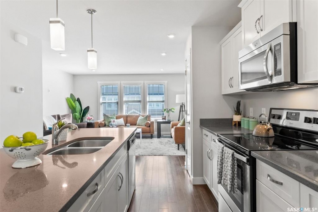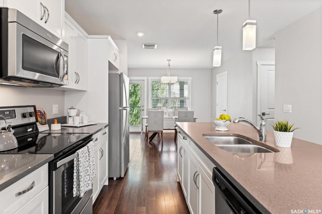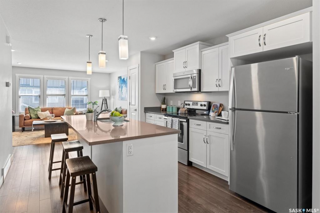 Stay out of the COLD! This unit has a 2 car tandem garage!!!! Open house Saturday November 29th 10am-12pm. Welcome to Unit 229 at 1220 Pringle Way — a beautifully maintained 3-storey townhome nestled in the desirable neighborhood of Stonebridge. With over 1,300 sq ft of thoughtfully designed living space, this multi-level condo offers both comfort and functionality. Featuring 2 spacious bedrooms and 2 bathrooms, the layout is perfect for professionals, first-time buyers, or those looking to downsize without compromising on style. The open-concept kitchen and dining area boast modern laminate flooring, generous cabinetry, and room to host, while the adjacent living room is bathed in natural light from east and west-facing windows. Upstairs, the primary bedroom includes a walk-in closet and a private 3-piece ensuite. Additional features include central air conditioning, second-floor laundry, a dedicated storage room, and a heated, fully insulated attached 2-car garage — a rare find at this price point. Step outside to enjoy your own balcony, deck, and patio — ideal for relaxing or entertaining. Residents benefit from low condo fees, which cover snow removal, water, common area maintenance, and more. The “Living Stone” complex is well-managed by North Prairie Developments and includes visitor parking and beautifully maintained grounds. Located minutes from schools, parks, shopping, restaurants, and all Stonebridge amenities, this home offers unbeatable convenience in a vibrant community. Don't miss your opportunity to own a move-in ready home in one of Saskatoon's most sought-after areas!