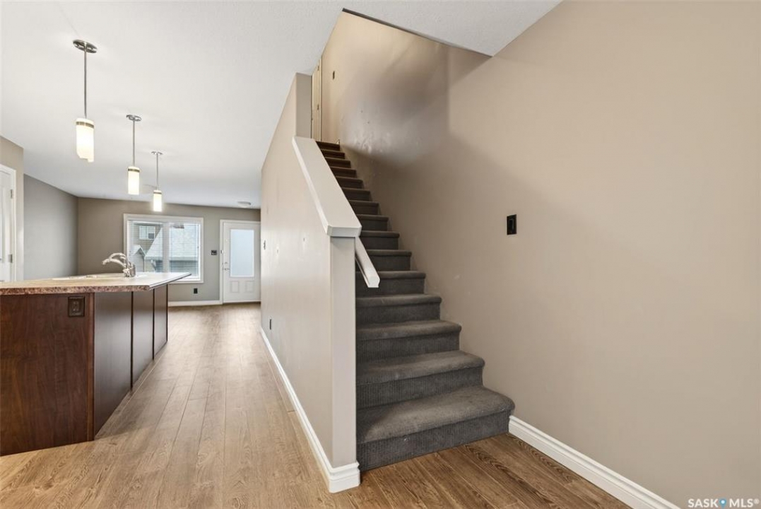 Welcome to 4348 Shaffer Street, located in Regina's highly sought-after Harbour Landing neighbourhood. This beautifully maintained freehold townhome offers exceptional value with NO condo fees and the added convenience of a single detached garage. Upon entering, you are greeted by a bright, inviting main floor featuring a modern open-concept layout that seamlessly connects the living room, dining space, and kitchen. The kitchen offers ample cabinetry, functional prep space, and a comfortable layout perfect for everyday living and entertaining. The upper floor includes 3 spacious bedrooms, including a well-appointed primary suite. The additional bedrooms are perfect for family members, guests, or a home office. A full bathroom and laundry area on this level ensure added convenience. The lower level is unfinished, offering excellent storage and the potential to customize the space to suit your needs — home gym, media room, or additional living area. Outside, enjoy a backyard space ideal for barbecues, play, or quiet mornings with a coffee. This is an end unit which provides a larger yard space, dedicated front sidewalk (other units share a sidewalk) and access between the front and back yard. Very close to walking paths, parks, schools, shopping, restaurants, and all the amenities Harbour Landing is known for, this location is unbeatable for busy families and professionals alike.