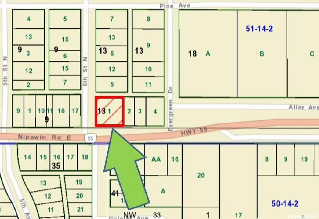 PRIME HIGHWAY COMMERCIAL vacant lot on Nipawin Road East / HWY 55 with 120 ft frontage on the East “gateway” to Nipawin! Lot size is approx. 120x127.8' (0.35 acres). Located near the road to the Evergreen center, hotel and the golf course, and is kitty-corner from the gas station. Zone C2 – (C2 – Highway Commercial – more in the Zoning Bylaw). Seller states GST doesn't apply to the sale price. Buyer is required to complete construction within 2 years of purchase. Building permit is required. Town of Nipawin incentives might be available, conditions apply. Property taxes to be assessed. Nipawin and area are known for great fishing, hunting and the great outdoors. Bring your business to Nipawin! Adjacent lot is also for sale - see listing SK004173.