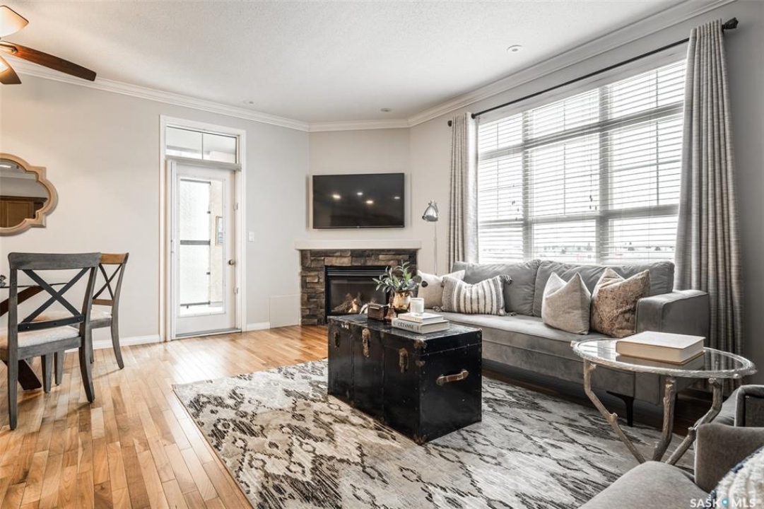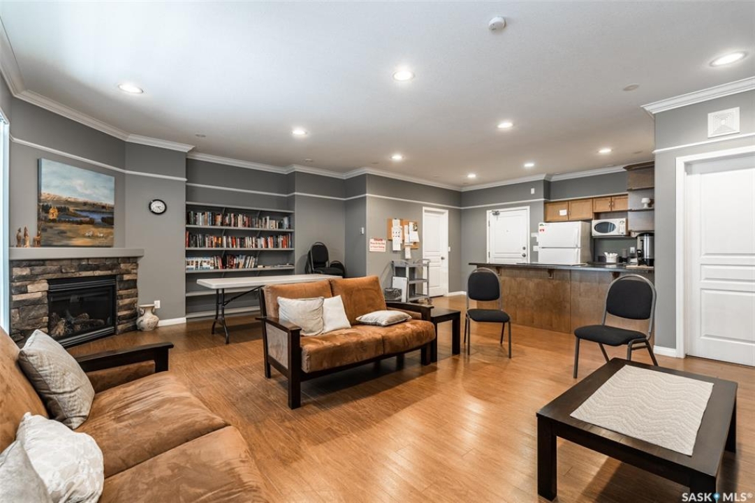 Welcome home to this bright and spacious 2-bedroom, 2-bath condo perfectly situated in highly desirable University Heights. Featuring an updated kitchen with an eat-up peninsula, stainless steel appliances, and tons of cabinetry, this unit delivers both style and function. The open-concept living and dining area is warmed by a gas-burning fireplace and highlighted by large south-facing windows that flood the space with natural light. Step outside to a covered balcony to enjoy the sunshine. Beautiful hardwood floors and freshly panted walls flow throughout the main living areas, adding warmth and continuity. The primary bedroom offers comfort and convenience with a large window, walk-in closet, and a 3-piece ensuite complete with a walk-in shower. The second bedroom is best suited for a twin bed and would make an excellent home office or creative space. Additional perks include in-suite laundry, a generous storage room, and access to an amenities room equipped with a kitchen and fireplace—perfect for hosting gatherings. Leave the car at home and enjoy a less-than-5-minute walk to groceries, restaurants, medical services, and more. Underground parking and visitor parking complete this exceptional package. A fantastic opportunity to own in a prime location with everything right at your doorstep!