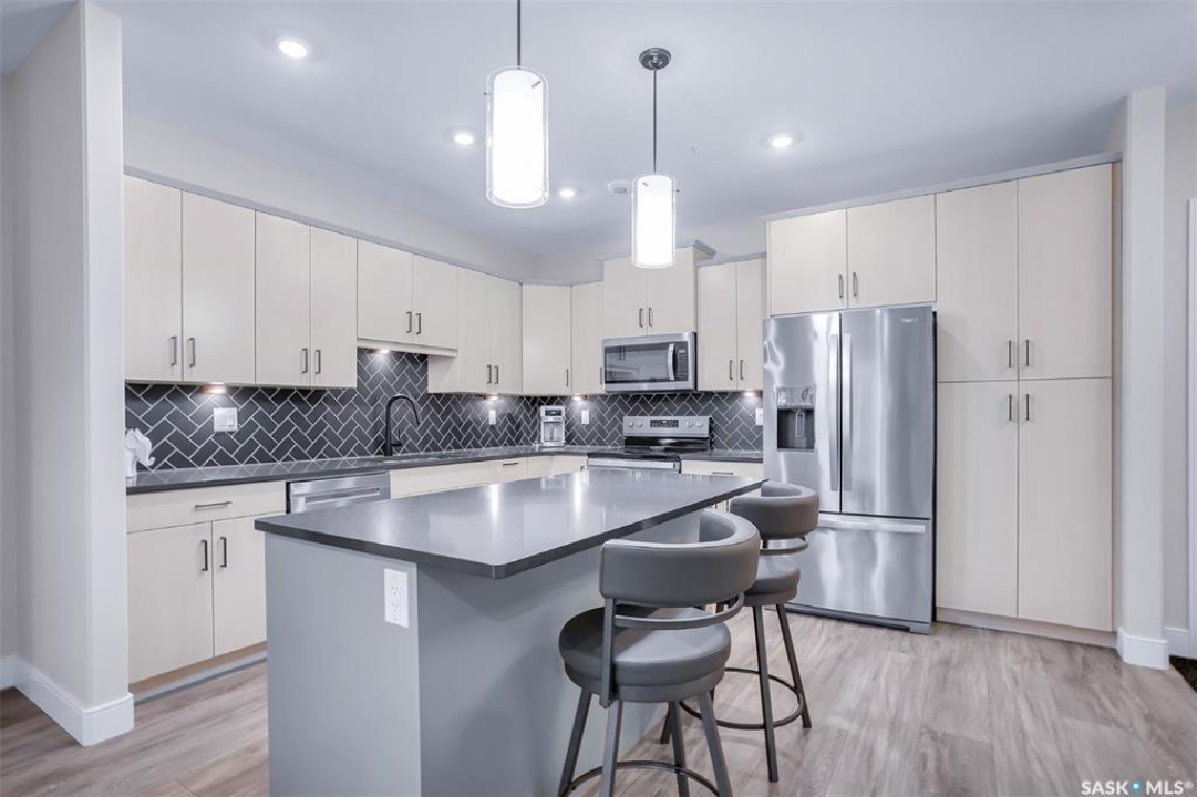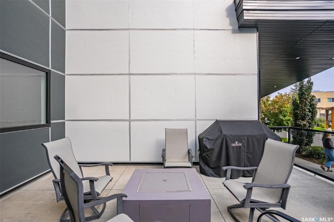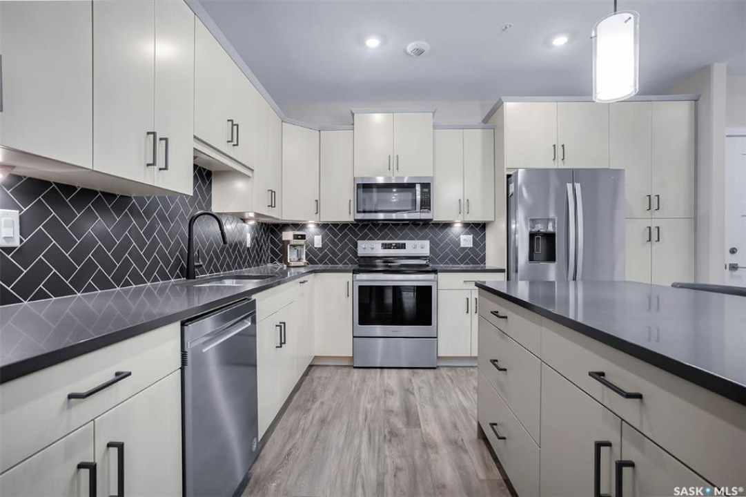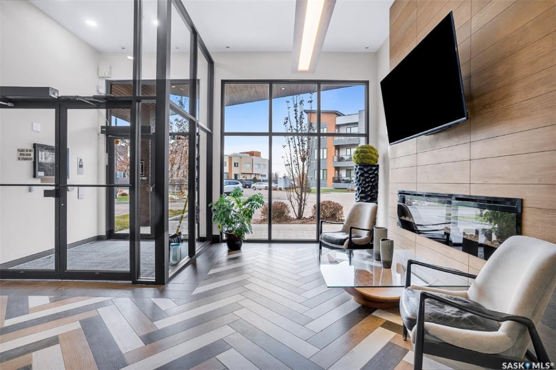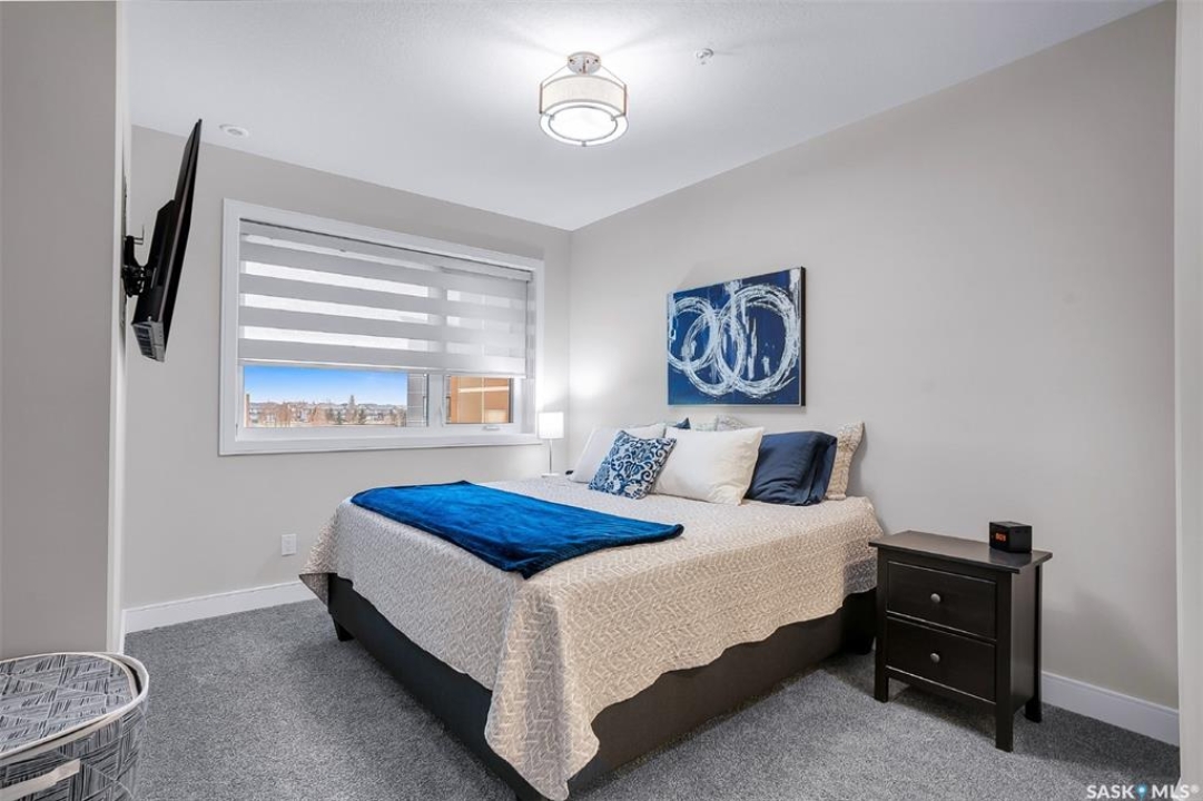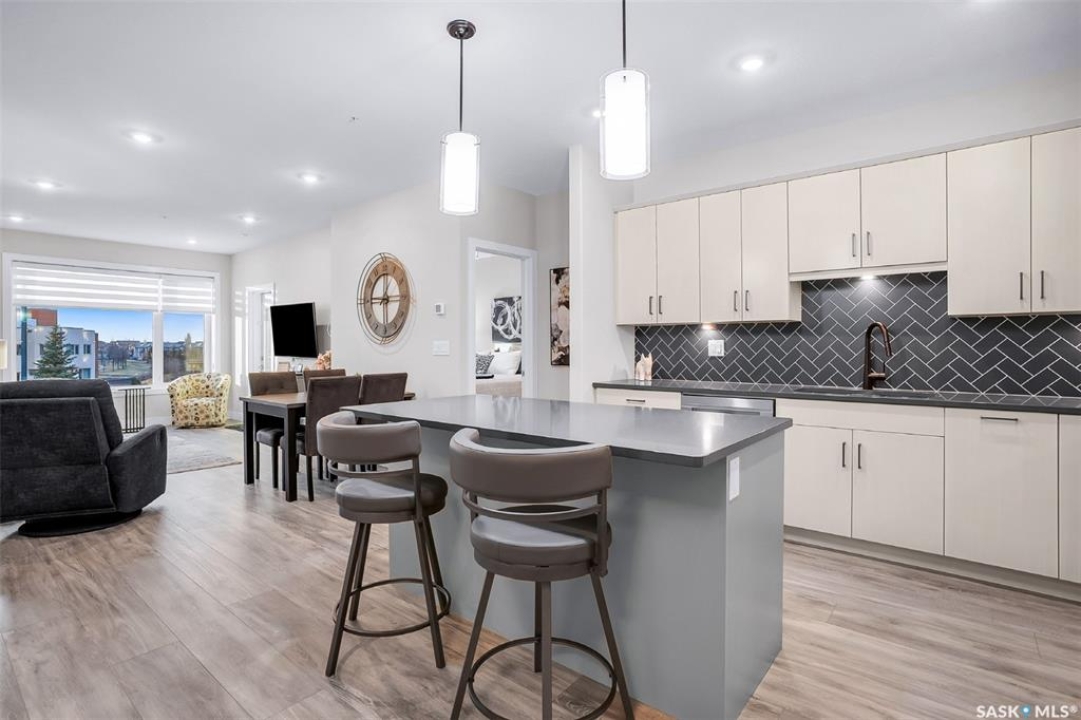 Welcome to modern living in the heart of Stonebridge — a home that feels calm, intentional, and beautifully finished from the moment you step inside. This 1,083 sq. ft. condo offers an airy, open layout with 9-foot ceilings, large windows, and a thoughtful blend of comfort and contemporary style. Barely lived in and showing like new, every inch feels fresh, refined, and move-in ready. The kitchen is the centrepiece of the home: an inviting, well-planned space with a large island (complete with pullout drawers), quartz countertops, tile backsplash, under-cabinet lighting, stainless steel appliances, and an abundance of cabinetry including a built-in pantry. The living area flows seamlessly from here, framed by expansive natural light and opening onto a private covered balcony — the perfect spot for a quiet moment or an evening to unwind. The primary suite is a retreat of its own, offering a generous bedroom, walk-through closet, and a spa-inspired ensuite featuring dual sinks, a walk-in shower, and thoughtful linen storage. On the opposite side of the condo, a second bedroom and full four-piece bathroom create ideal separation for guests, a home office, or a creative workspace. This home also includes central air conditioning, Hunter Douglas window coverings, in-suite laundry, and heated underground parking with a large storage unit. The building itself offers impressive amenities: a well-equipped gym with a wall of windows, a lounge with pool table and shuffleboard, outdoor fire tables, and a private guest suite for visiting family and friends. An added bonus: the stylish, modern furniture can be included — allowing you to move in effortlessly and enjoy the space immediately. Step outside to Peter Zakreski Park with its walking trails, lake, and greenspace, or stroll to nearby cafés, groceries, shops, and services. With quick access to Circle Drive, the rest of the city is only minutes away. Be sure to check out the virtual tour!