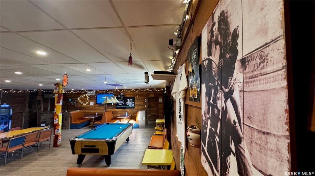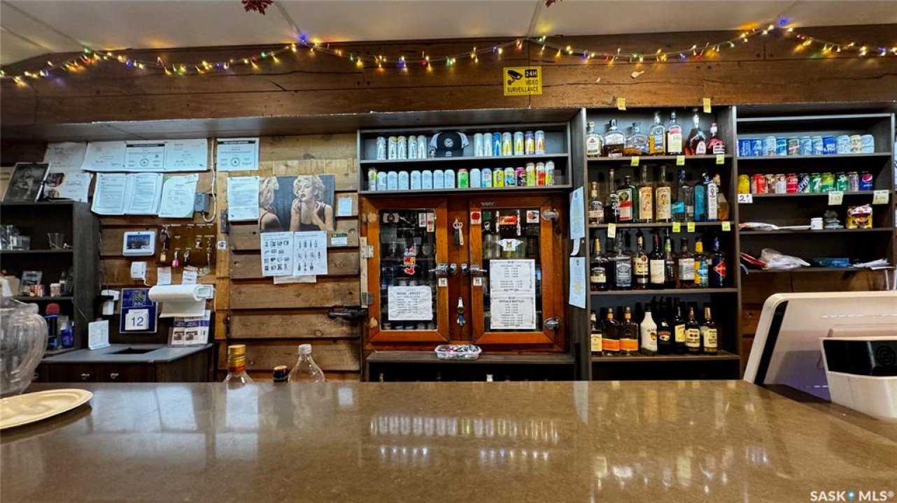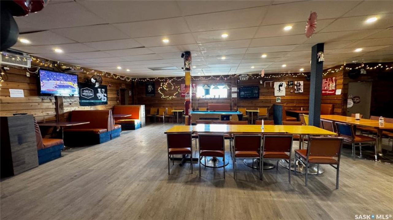 Just 45 minutes from Saskatoon, this exceptional 6000 sq ft, two-storey commercial property in the Town of Hanley offers a rare opportunity to acquire the building, land and a fully operational restaurant-bar business with diverse revenue streams and strong community roots. The main floor features the only Canadian-style restaurant bar in Hanley, equipped with a restaurant liquor permit (minors allowed 11 a.m.–10 p.m.), off-sale liquor permit, tobacco permit, 6 VLTs, 1 ATM, pool table, kickboxing machine, and jukebox, with seating capacity for 100 guests plus an inviting covered outdoor patio. A spacious 18' × 12' walk-in cooler, fully outfitted commercial kitchen, and a 20' × 24' single attached rear garage add to operational efficiency for the owner or manager. The second floor provides extensive accommodation, including one guest suite with kitchen and private bath, five guest rooms with individual sinks, two shared bathrooms with shower stalls, and a storage room. The opposite side of the upper level features an owner's suite, an office, and a versatile flex room suitable as an additional office, guest room, or manager's room. The building is heated by a natural-gas floor-model furnace with forced air and cooled by wall A/C units in select areas. Hanley draws steady traffic with amenities such as a hockey rink, golf course, nearby horse racing, and a regional high school, while the business benefits from loyal patrons, including local residents, sports fans, and families from provincial football and youth hockey leagues. The current owner actively supports local sports and is willing to stay for training, making this a smooth transition for the next operator of this thriving multifaceted establishment.