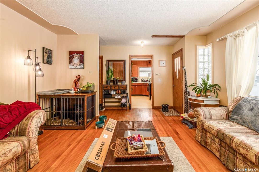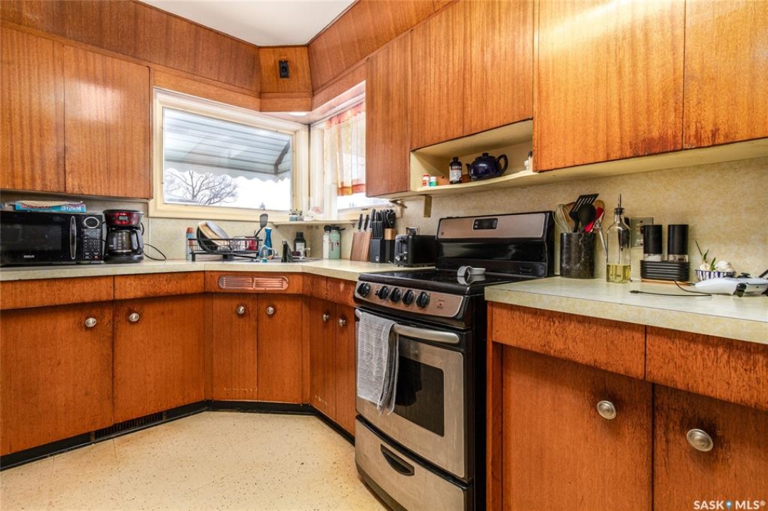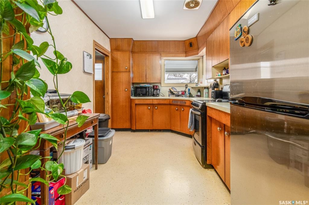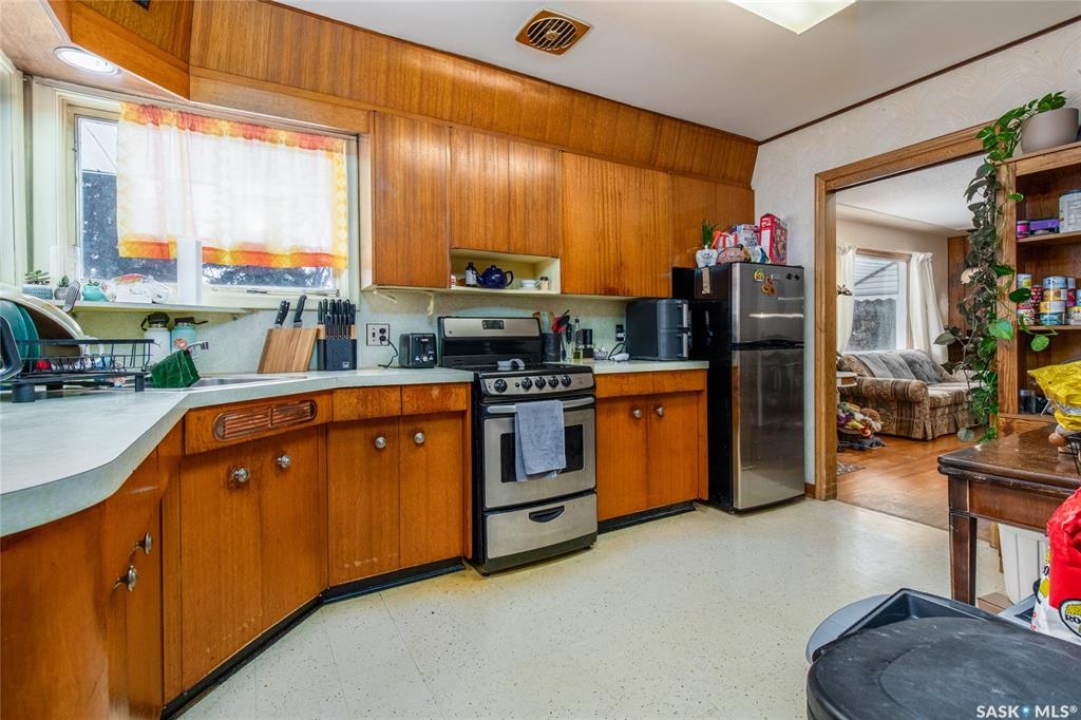 Attention first-time buyers and investors! This home offers a fantastic opportunity with a basement kitchen and separate access—perfect for added flexibility or potential income. Step in through the front door and you're welcomed by a bright, south-facing living room. Down the hall are two spacious bedrooms and a 4-piece bathroom. The main-floor kitchen is well maintained, featuring classic oak cabinetry and a functional layout ideal for everyday family meals. Downstairs, you'll find one additional bedroom, a bathroom, laundry and utility area, plus a comfortable living room and kitchen space, creating a versatile lower level with great potential. This one won't last long—call your agent to book a showing today!