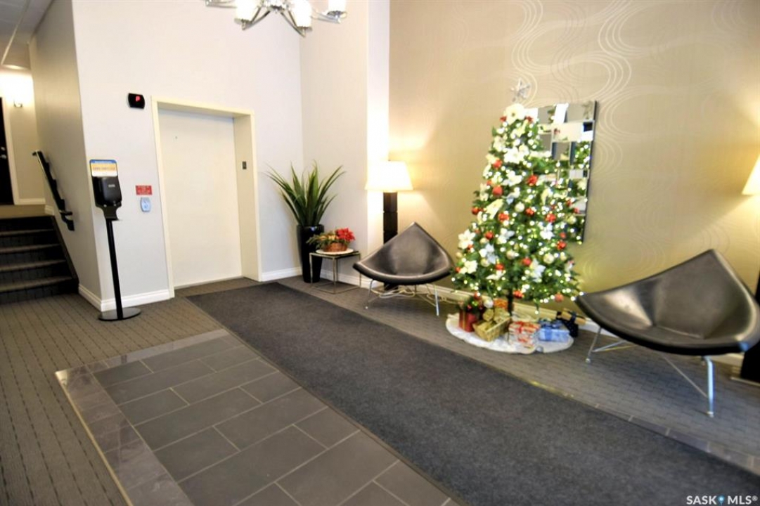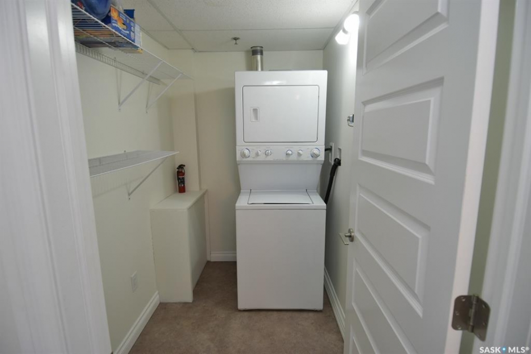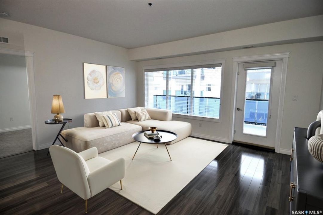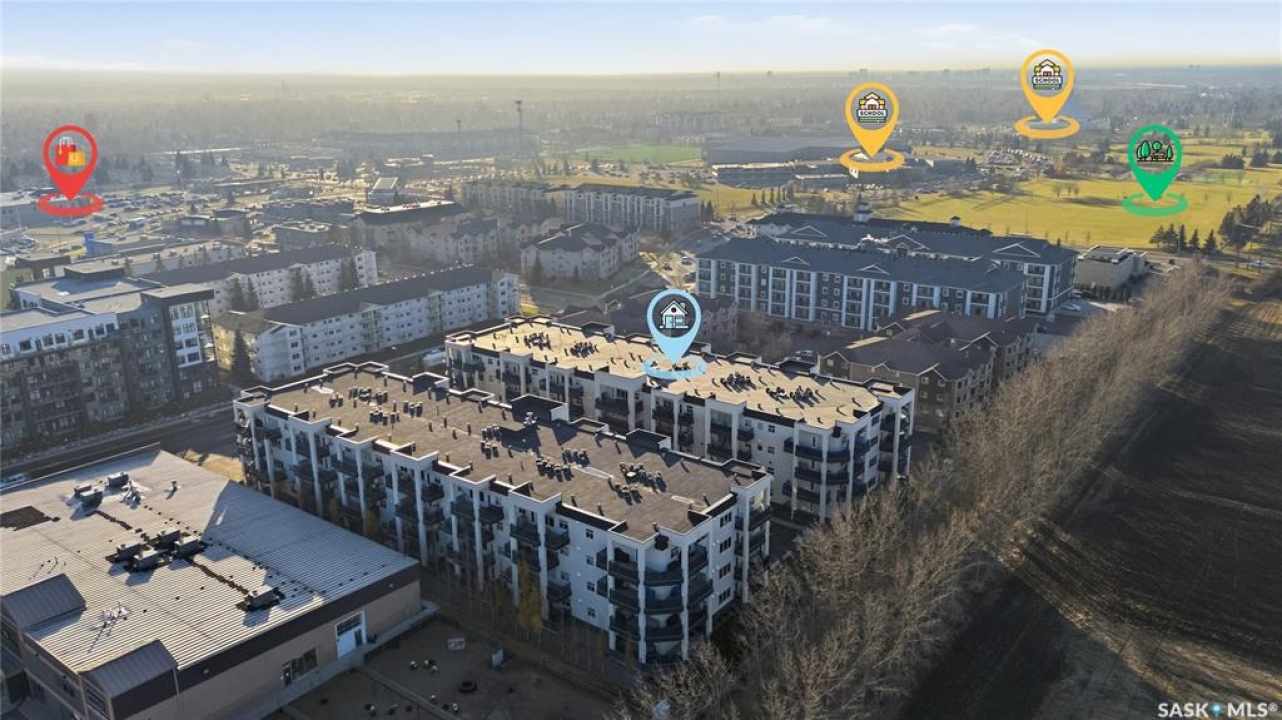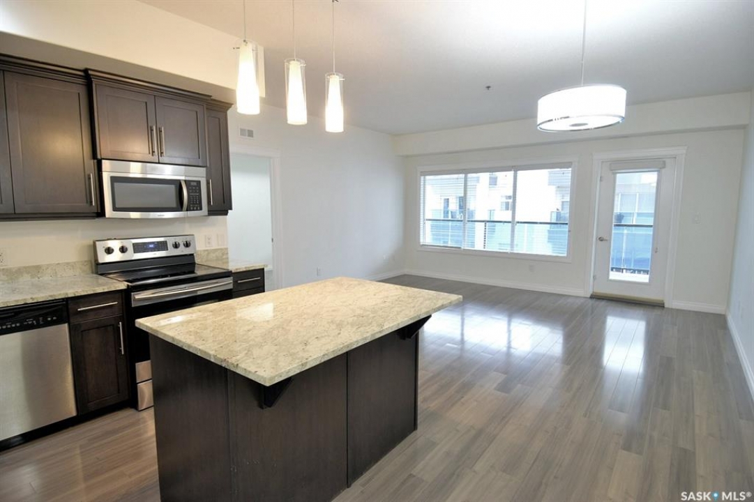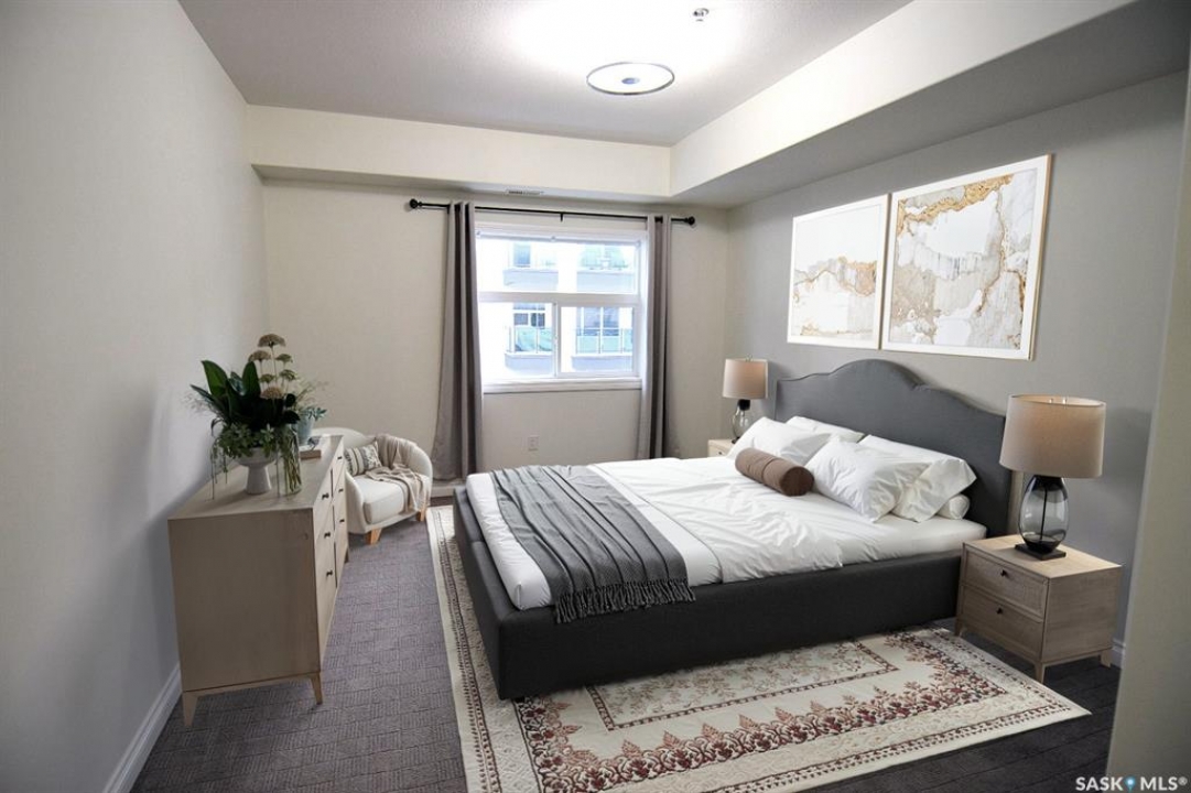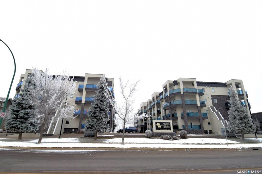 Welcome to sophisticated, hassle-free living in one of Saskatoon's most desirable locations. This super-clean third-floor suite offers an unparalleled combination of space, style, and essential convenience in the highly coveted University Heights area. Here you can embrace true walkability; leave the car behind as groceries, restaurants, coffee shops, banks, medical, library, & transit are all just a short stroll away. Experience urban convenience without sacrificing comfort. Step inside this elegant suite where soaring 9-foot ceilings & windows immediately create a bright, spacious atmosphere. The thoughtful, open-concept design allows the kitchen, dining, & living areas to flow seamlessly together, all enhanced by fresh, designer paint. The kitchen features a full suite of modern S/S appliances, a functional island with breakfast bar, & beautiful modern light-colored granite countertops here & in both baths. Easy to clean luxury is further provided by gleaming laminate floors through the main area. The spacious primary suite easily accommodates large furniture & boasts 3 closets leading to a private 3-piece ensuite, complete with 5ft walk-in shower & glass doors. A full main bath with a deep bathtub, services the 2nd bedroom & guests. One of the most impressive features is the expansive outdoor space: a French patio door opens to a private covered terrace; a truly massive 200 sq ft space ready to be furnished & enjoyed. This impressive building is designed for year-round comfort and convenience, featuring an exclusive, private heated parking stall to keep your vehicle safe & warm. Owners appreciate the dedicated car wash bay. Wash your car then let it dry in your heated parking spot. Aqua Terra includes a well-equipped exercise room, workshop, a community meeting space, private storage, & ample visitor and street parking. Combining premium features, amenities, & genuine value, this executive condo truly checks every box for comfort, convenience, and lifestyle.