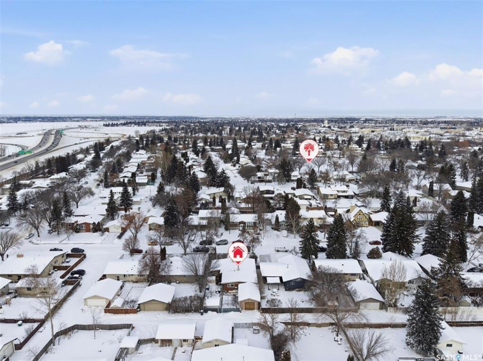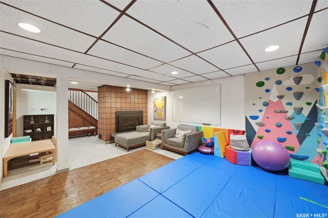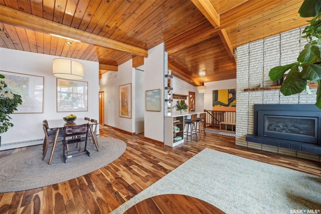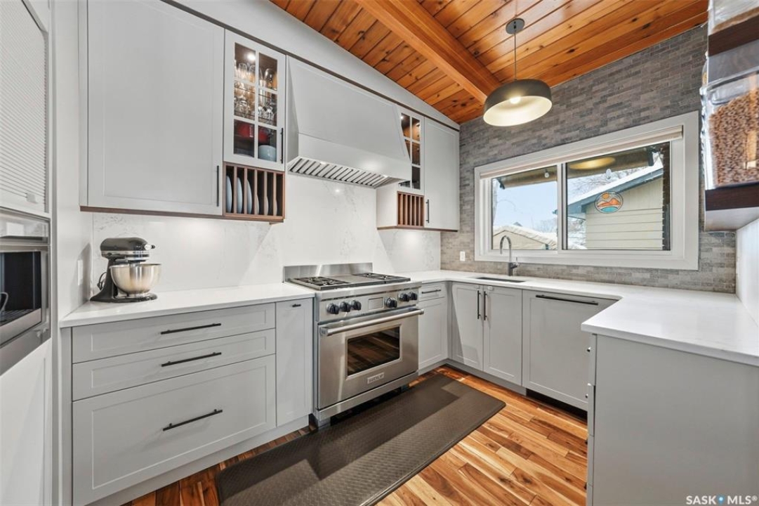 14 Yale Crescent - a thoughtfully updated home that highlights quality finishes and careful attention to detail. The fully renovated kitchen is the heart of the home, featuring top of the line stainless steel appliances including a Wolf dual fuel stove with charbroiler, built in Wolf range hood with remote blower, Subzero fridge, Cove dishwasher, built in Jenn Air coffee machine, and Sharp microwave. Custom cabinetry, quartz countertops and backsplash, a large island with a secondary sink, and smart lighting complete the space. Solid hardwood floors run throughout the main floor and staircase, and vaulted cedar ceilings add warmth and character. The primary bedroom includes a convenient two piece ensuite, and a split air conditioner unit keeps the main level comfortable. Designed for both relaxation and flexibility, the home offers two natural gas fireplaces, a private sauna, and a second kitchen in the basement, ideal for guests or extended family. The updated 200 amp electrical panel adds peace of mind. Outside, enjoy a low maintenance brick exterior with new metal roofing on the house, garages, and shed. There are two garages, one attached and heated and one detached, plus a shed with a built in natural gas smoker. The front yard features a new composite deck and underground sprinklers, while the mature yards are filled with apple and sour cherry trees, Saskatoon berry and raspberry bushes, asparagus, and perennial flowerbeds. This is a rare opportunity to own a well cared for home with exceptional indoor and outdoor features.