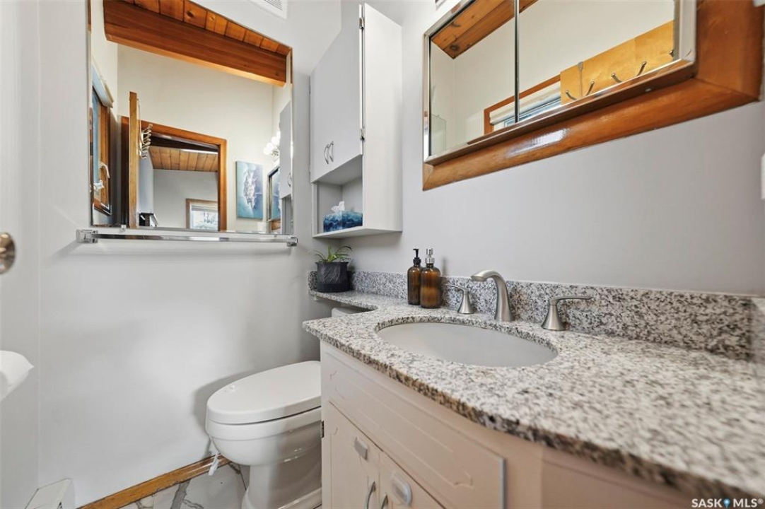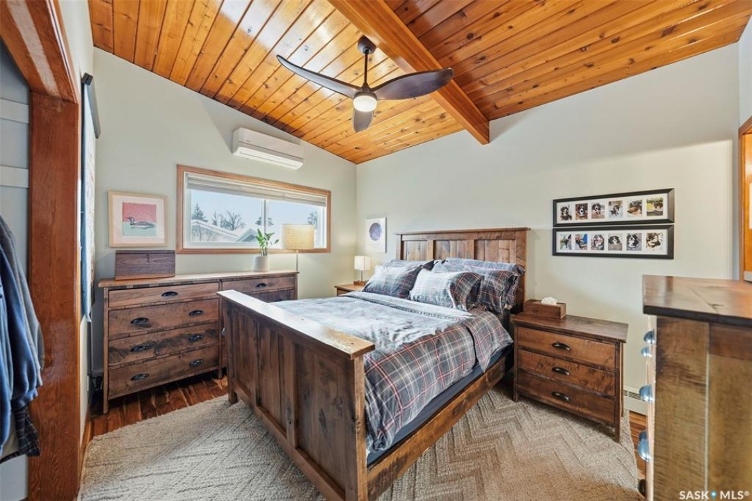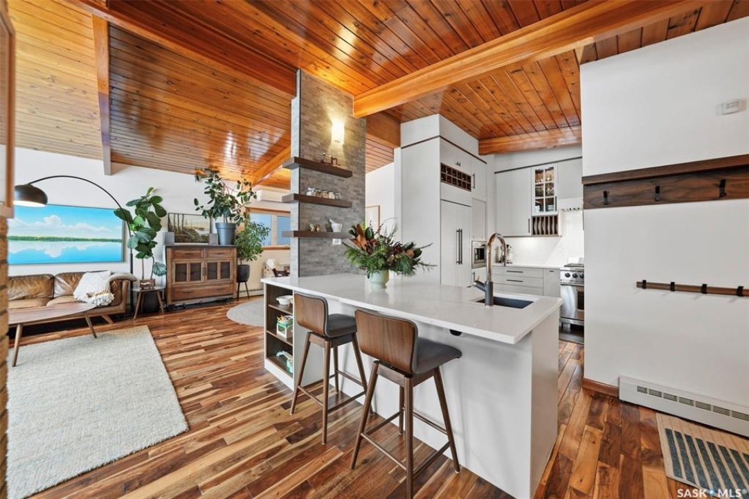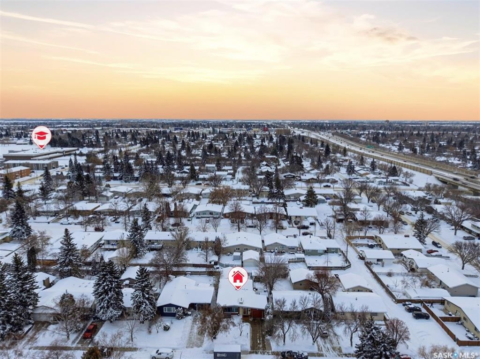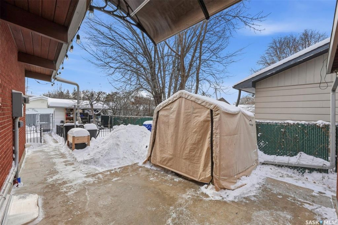 14 Yale Crescent - a thoughtfully updated home that highlights quality finishes and careful attention to detail. The fully renovated kitchen is the heart of the home, featuring top of the line stainless steel appliances including a Wolf dual fuel stove with charbroiler, built in Wolf range hood with remote blower, Subzero fridge, Cove dishwasher, built in Jenn Air coffee machine, and Sharp microwave. Custom cabinetry, quartz countertops and backsplash, a large island with a secondary sink, and smart lighting complete the space. Solid hardwood floors run throughout the main floor and staircase, and vaulted cedar ceilings add warmth and character. The primary bedroom includes a convenient two piece ensuite, and a split air conditioner unit keeps the main level comfortable. Designed for both relaxation and flexibility, the home offers two natural gas fireplaces, a private sauna, and a second kitchen in the basement, ideal for guests or extended family. The updated 200 amp electrical panel adds peace of mind. Outside, enjoy a low maintenance brick exterior with new metal roofing on the house, garages, and shed. There are two garages, one attached and heated and one detached, plus a shed with a built in natural gas smoker. The front yard features a new composite deck and underground sprinklers, while the mature yards are filled with apple and sour cherry trees, Saskatoon berry and raspberry bushes, asparagus, and perennial flowerbeds. This is a rare opportunity to own a well cared for home with exceptional indoor and outdoor features.