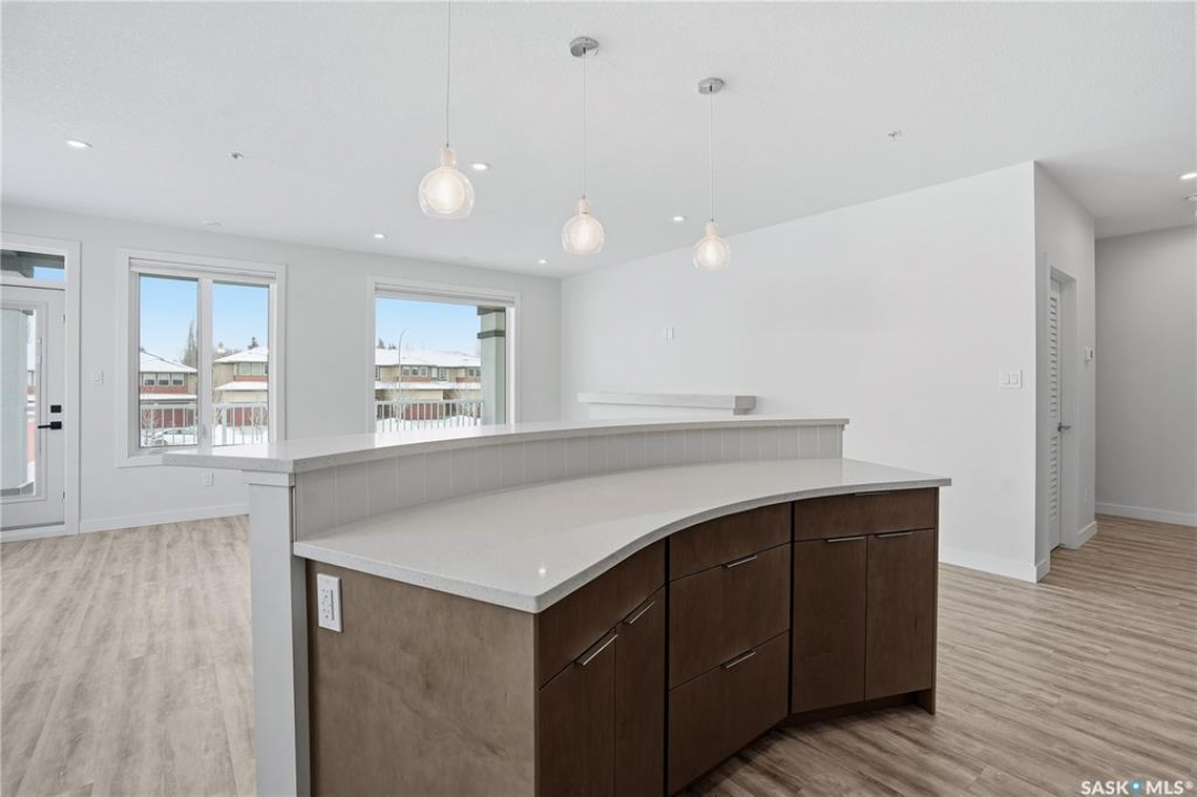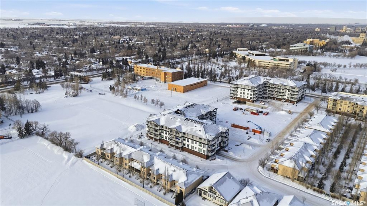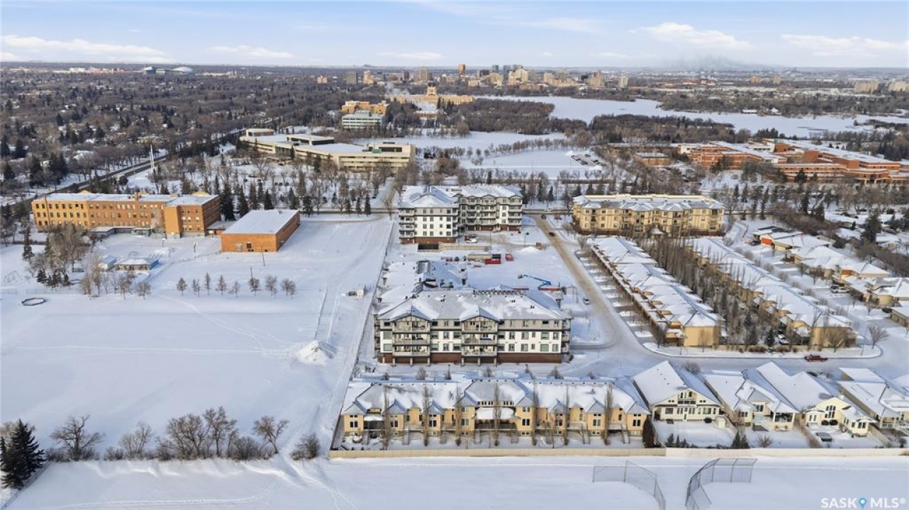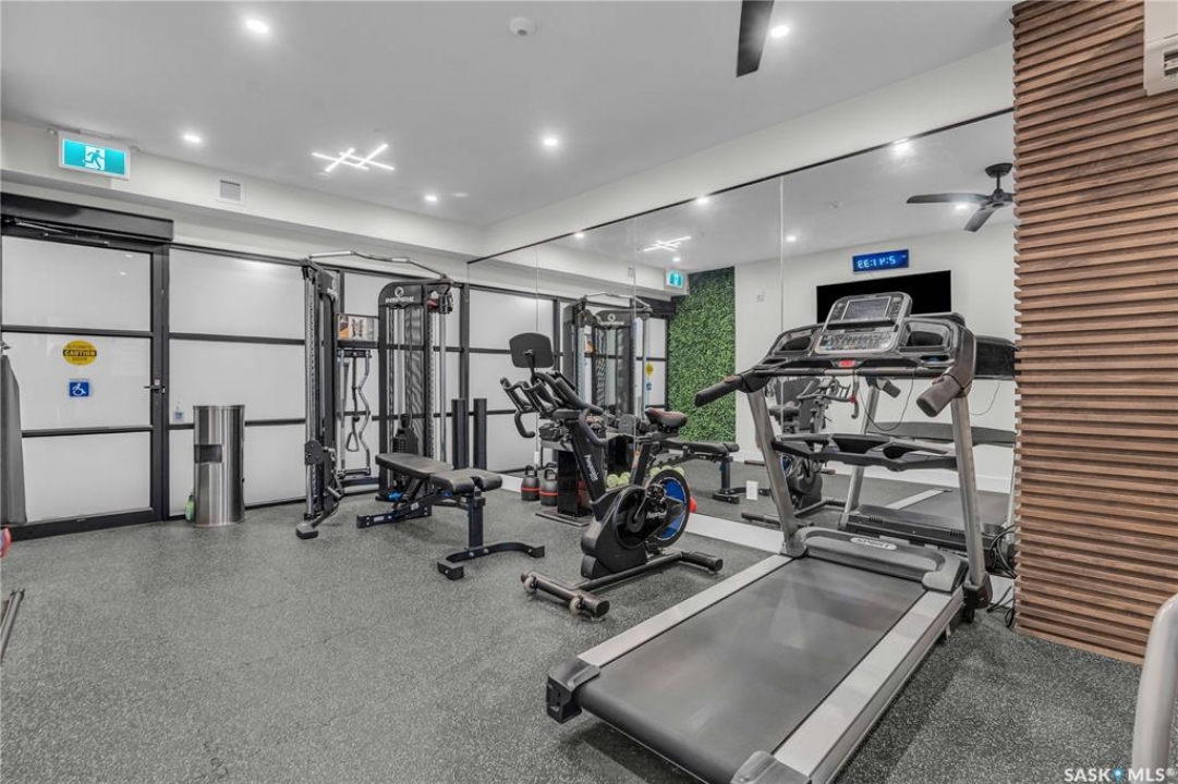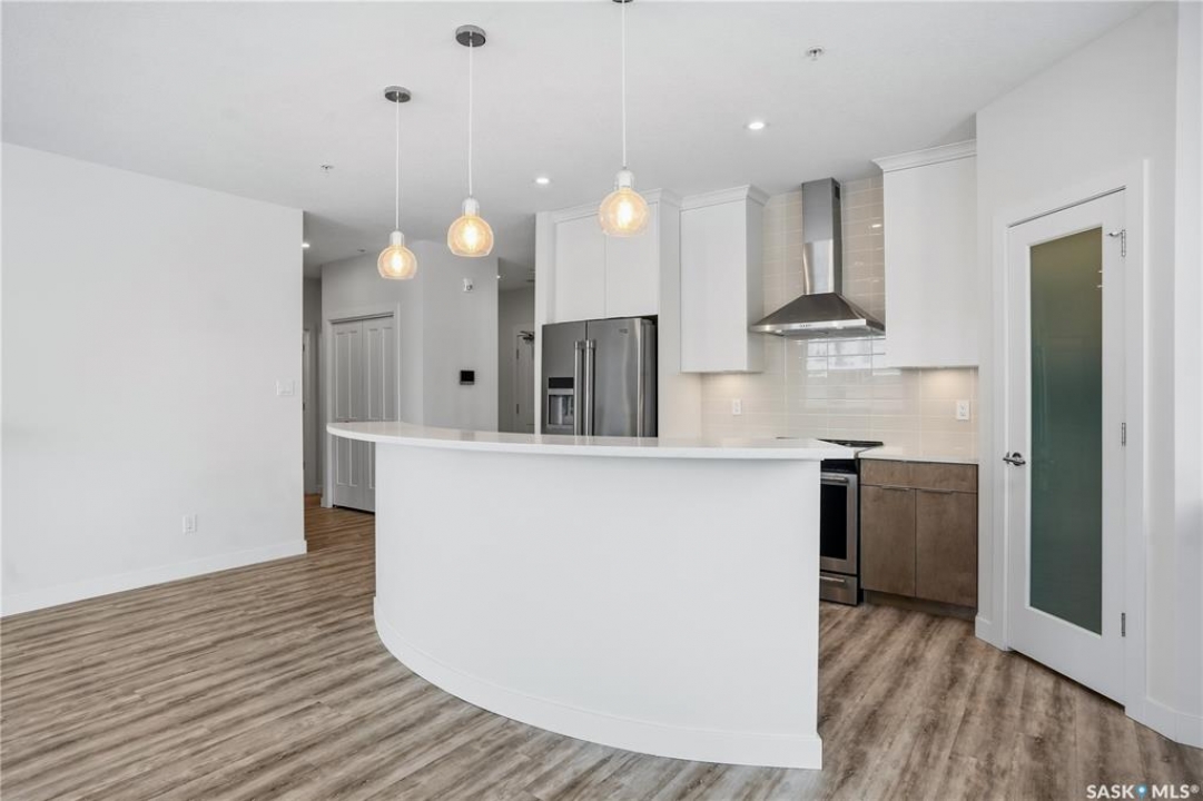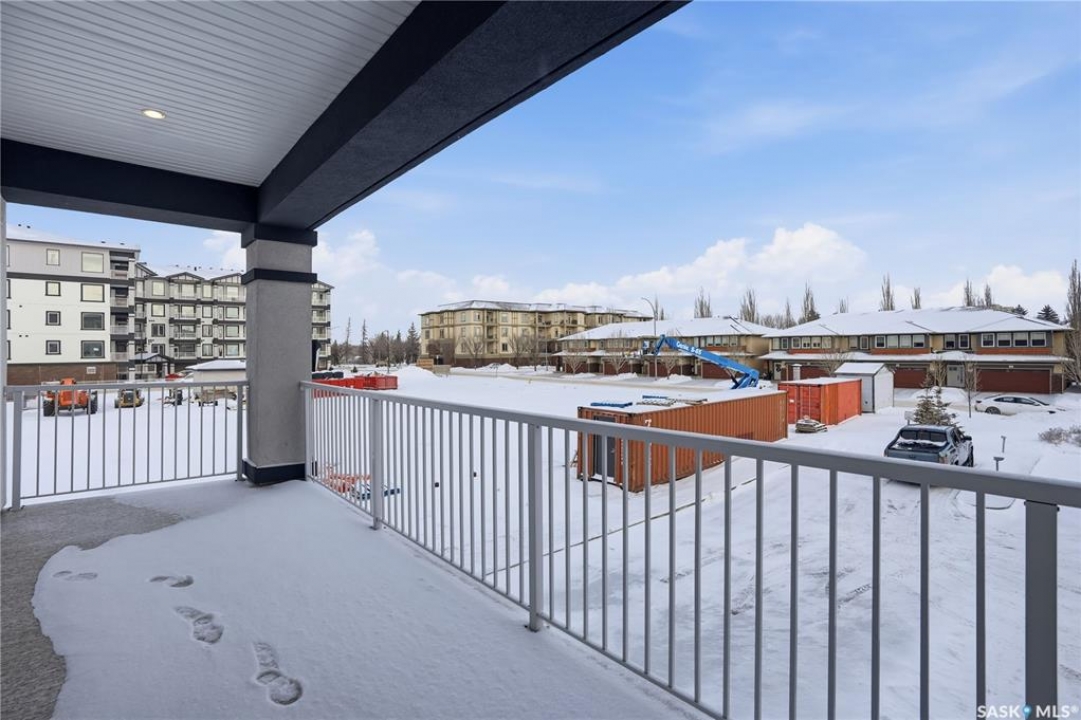 Where luxury meets convenience — welcome to Camden Hall, located in the prestigious Evans Court development just steps from Wascana Park. Offering a lifestyle designed for both young professionals and empty nesters, Camden Hall combines modern elegance with desirable amenities, including an owner's lounge, fitness facility, and heated underground parking. This next-to-new (completed in 2022) corner-unit condo spans 1,141 sq. ft. The inviting foyer leads to an open-concept living space featuring 9-foot ceilings, large windows, and a cozy fireplace — all accented by recessed pot lighting. An oversized, private, northeast-facing balcony with a natural gas BBQ hook-up extends the living area outdoors. The stunning kitchen boasts full-height cabinetry to the ceiling, two-tone finishes, under-cabinet lighting, quartz countertops, a tiled backsplash, stainless steel appliances, and a corner pantry complete with lighting, electrical, and a microwave. The primary suite offers a spacious walk-in closet with built-in shelving and a spa-inspired ensuite featuring dual sinks, quartz countertops, and a walk-in shower with a seat. The second bedroom provides ample closet space, while a full 4-pc main bath adds comfort and versatility. Additional highlights include elegant top-down, bottom-up window coverings, in-suite laundry, an on-demand water heater, hot water forced-air heating, an underground parking stall with locked storage, same-floor access to the owner's lounge (featuring TVs, a fireplace, a pool table, kitchen, and dining area), a private gym/fitness facility, and convenient garbage/recycling chutes. Camden Hall is known for its impeccable maintenance and prime location. Don't miss your chance to experience luxury living in this exceptional community — in one of Regina's most sought-after neighbourhoods. Contact your REALTOR � today to book your private showing.