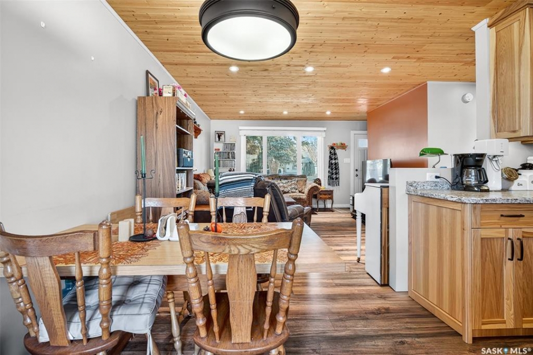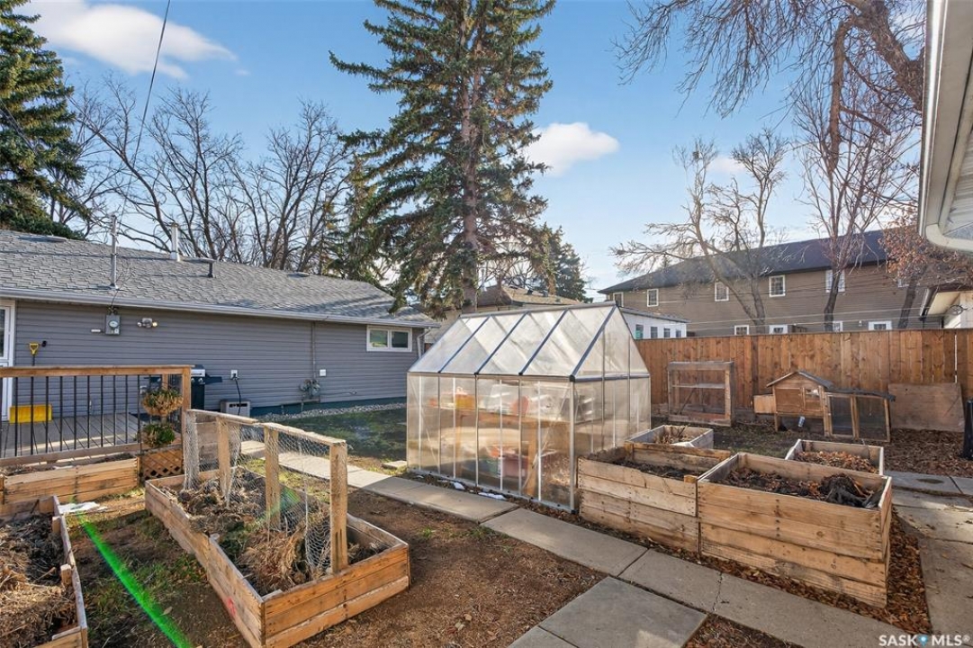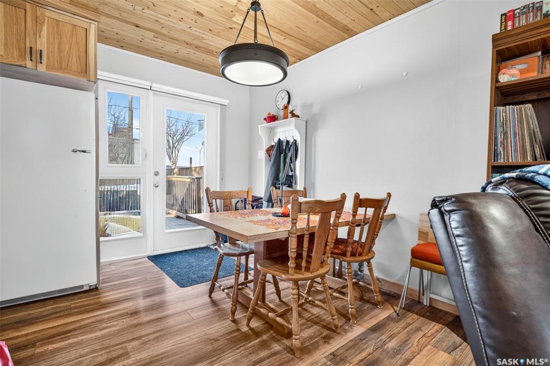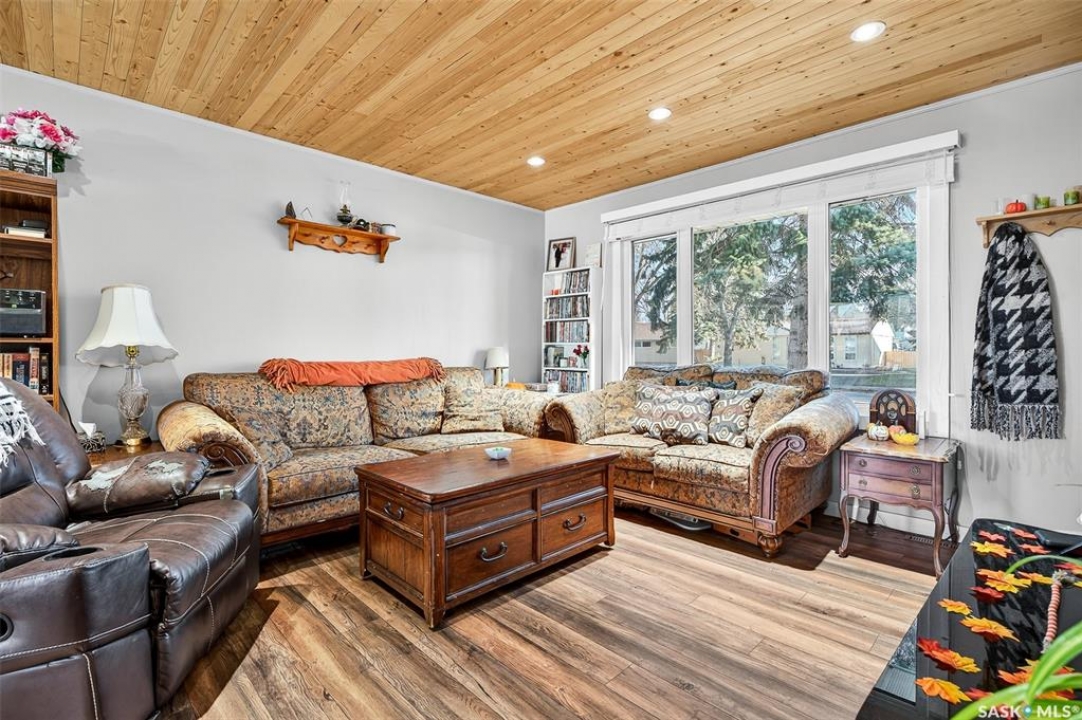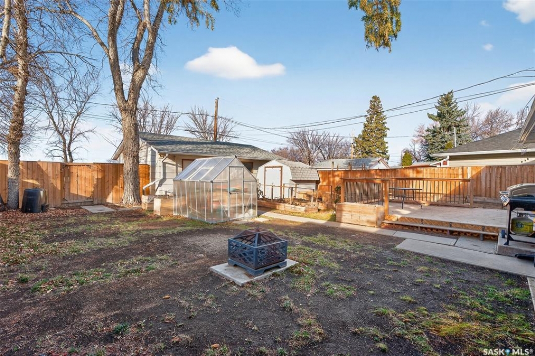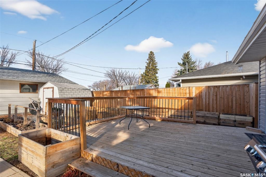 Are you looking for a beautifully updated 950 sq.ft. 3 bed / 1 bath slab home with a large garage near Saskpoly? You won't want to miss this one! Excellent curb appeal as you arrive with mature trees out front - just steps away from the college. Heading inside you are greeted by an open concept living area! The living and dining spaces flow together nicely - you are sure to love the pine ceilings. Off the dining space you have patio doors leading to a large deck - the perfect spot for your morning coffee! The updated U-shaped kitchen boasts lots of cabinets and counter space! Down the hall we find 3 bedrooms and a four piece bathroom as well as a separate laundry room. Outside we find a private backyard that is fully fenced! There is also an oversized heated double car garage (24'x28') as well as extra parking next to it! If you are looking for living all on one level - you won't want to miss this one! Reach out today to book your showing!