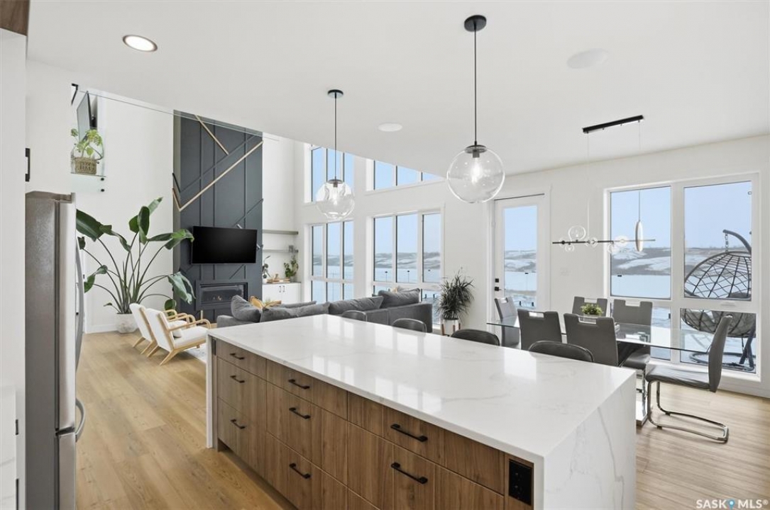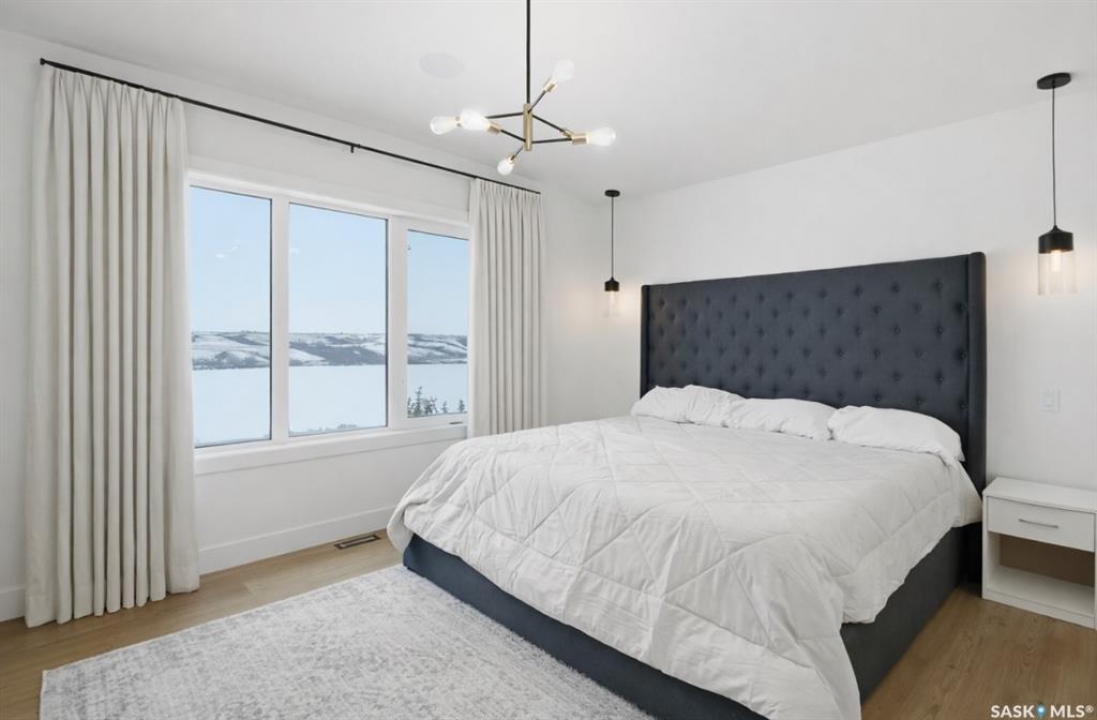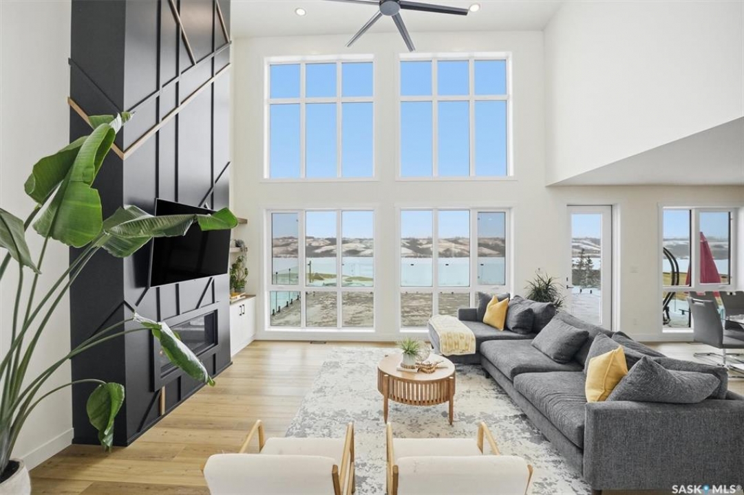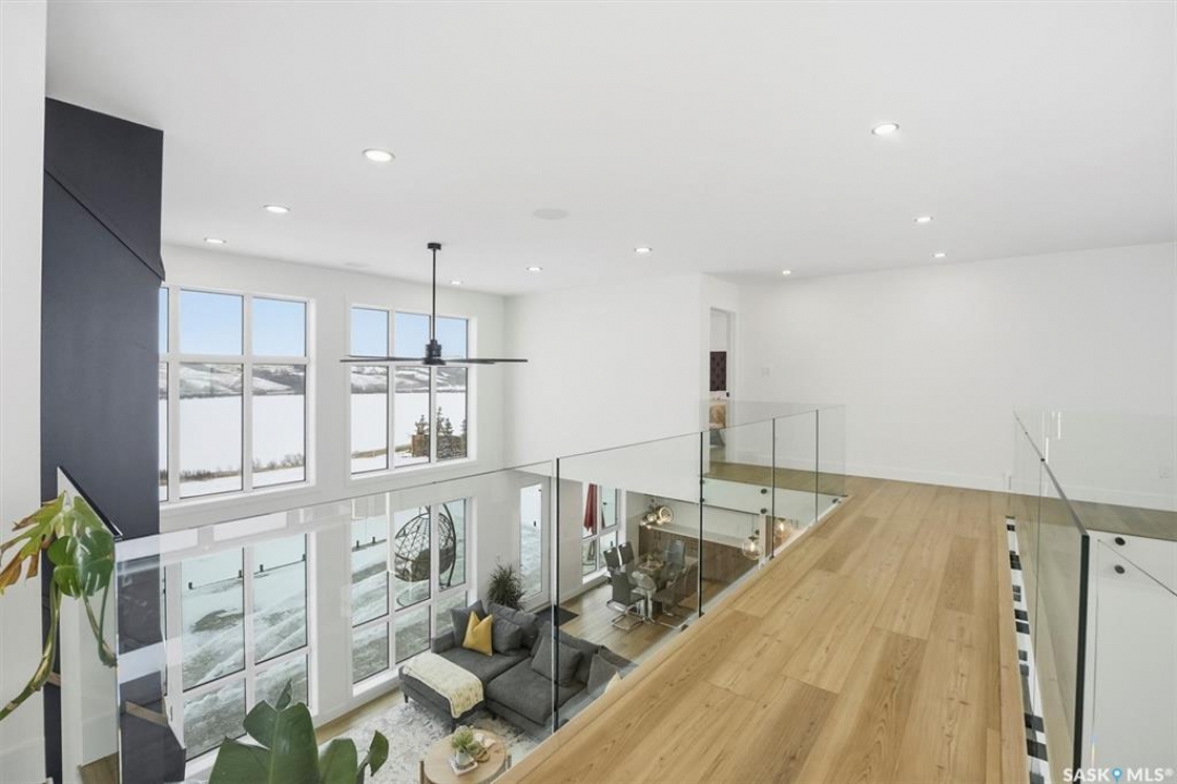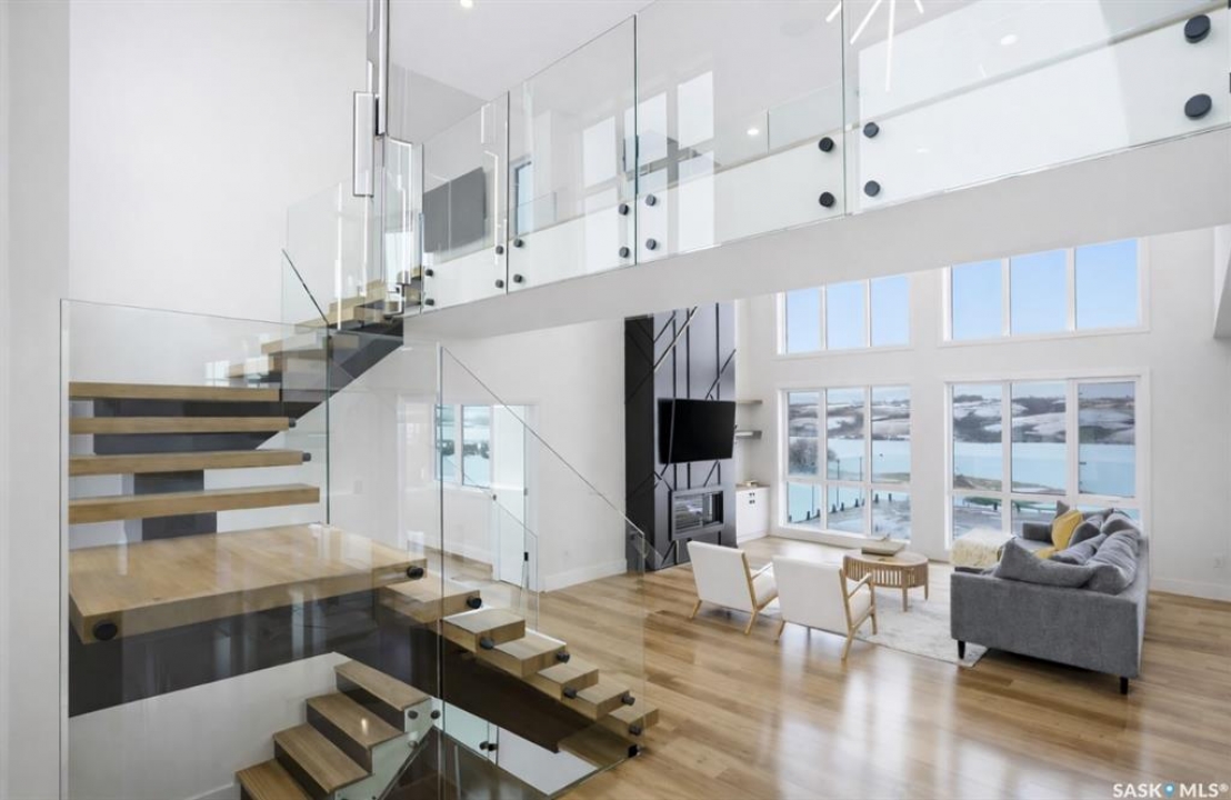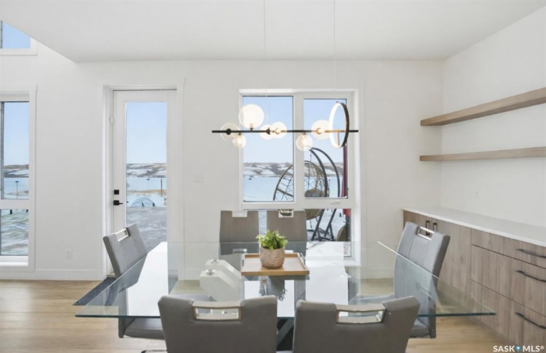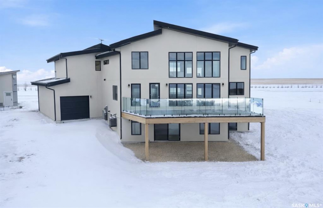 Lakefront modern luxury, just minutes south of Saskatoon — close to 4000 sq feet of living space, with all the bells and whistles! Offering 2,609 sq. ft., this stunning two-storey, fully developed walkout sits on an exceptional �-acre lot with panoramic lake views and direct lake access, creating a lifestyle truly dreams are made of. This custom-built masterpiece features 4 bedrooms and 4 bathrooms, a triple heated attached garage with drive-through bay, plus an additional double detached shop — a rare, sought-after combination. Inside, expansive full-height windows flood the home with natural light while showcasing breathtaking lake views. Professional, show-stopping design is evident throughout, with high-end finishes including a sleek white and walnut custom chef's kitchen, double-height ceilings on the main floor, soaring 2 story feature fireplace feature in living room, and extensive glass railings framing a dramatic staircase, second-floor overlook, and spacious bonus room. The main level includes very open and spacious living and dining areas, a walk-through butler's pantry, equipped boot room, 1/2 bath, and a large light-filled office/den. The upper level offers a luxurious primary suite with a second fireplace and spa-like 5 piece bath, two generously sized bedrooms, large main bath, and a spacious bonus room. The fully developed walkout lower level adds more luxurious space, featuring a wet bar, family room, games area, gym/den, fourth bedroom/guest suite, and a four-piece bathroom. Additional upgrades and features include an induction cooktop, pot filler, quartz countertops throughout, high-end flooring, tile work, and millwork, two fireplaces, sound system and security rough-ins, smart-home (roughed in), a zoned furnace system, grid-tied 8kW solar panels, in floor heat in 2 baths, detached double shop 30x26, a gravel front drive, more. An extraordinary lakefront home, just minutes from the city.