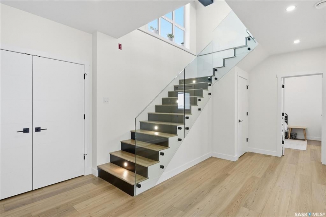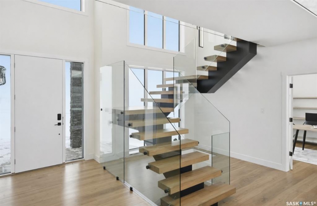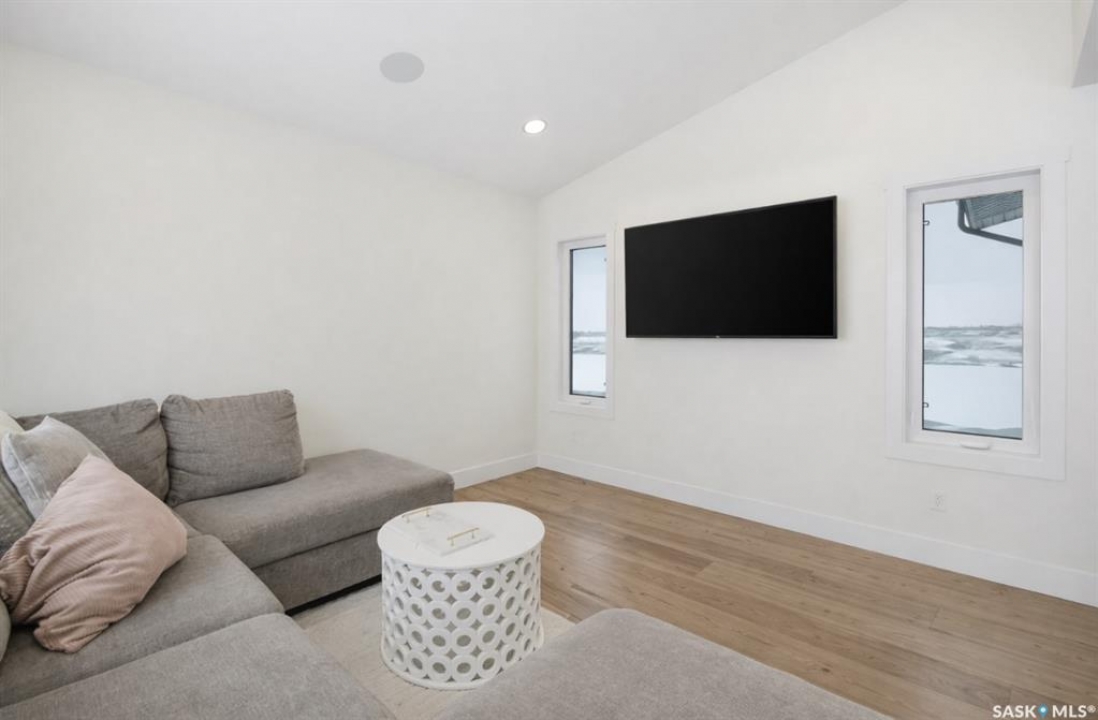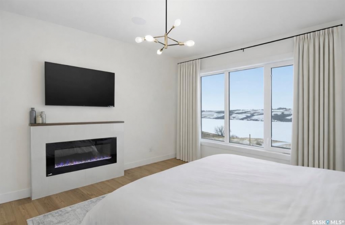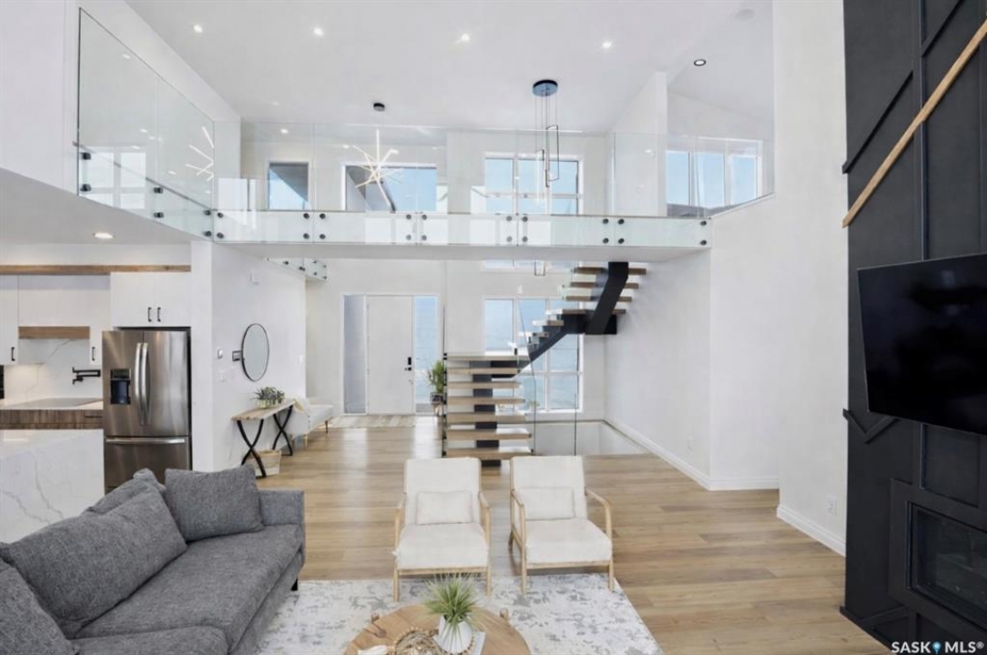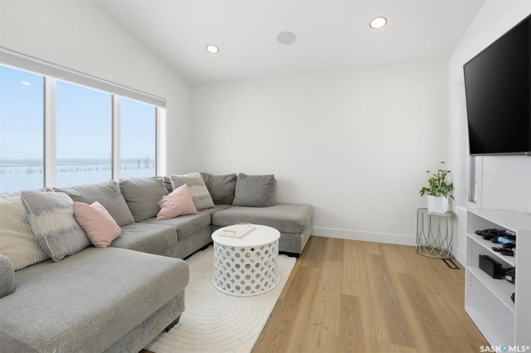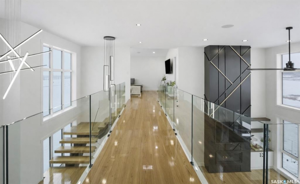 Lakefront modern luxury, just minutes south of Saskatoon — close to 4000 sq feet of living space, with all the bells and whistles! Offering 2,609 sq. ft., this stunning two-storey, fully developed walkout sits on an exceptional �-acre lot with panoramic lake views and direct lake access, creating a lifestyle truly dreams are made of. This custom-built masterpiece features 4 bedrooms and 4 bathrooms, a triple heated attached garage with drive-through bay, plus an additional double detached shop — a rare, sought-after combination. Inside, expansive full-height windows flood the home with natural light while showcasing breathtaking lake views. Professional, show-stopping design is evident throughout, with high-end finishes including a sleek white and walnut custom chef's kitchen, double-height ceilings on the main floor, soaring 2 story feature fireplace feature in living room, and extensive glass railings framing a dramatic staircase, second-floor overlook, and spacious bonus room. The main level includes very open and spacious living and dining areas, a walk-through butler's pantry, equipped boot room, 1/2 bath, and a large light-filled office/den. The upper level offers a luxurious primary suite with a second fireplace and spa-like 5 piece bath, two generously sized bedrooms, large main bath, and a spacious bonus room. The fully developed walkout lower level adds more luxurious space, featuring a wet bar, family room, games area, gym/den, fourth bedroom/guest suite, and a four-piece bathroom. Additional upgrades and features include an induction cooktop, pot filler, quartz countertops throughout, high-end flooring, tile work, and millwork, two fireplaces, sound system and security rough-ins, smart-home (roughed in), a zoned furnace system, grid-tied 8kW solar panels, in floor heat in 2 baths, detached double shop 30x26, a gravel front drive, more. An extraordinary lakefront home, just minutes from the city.