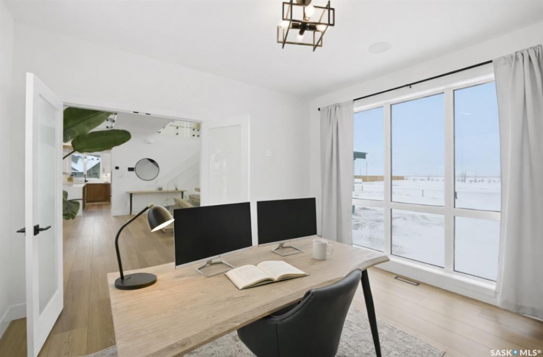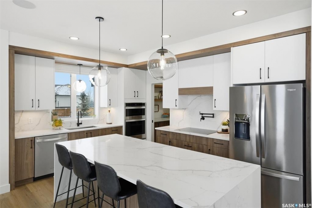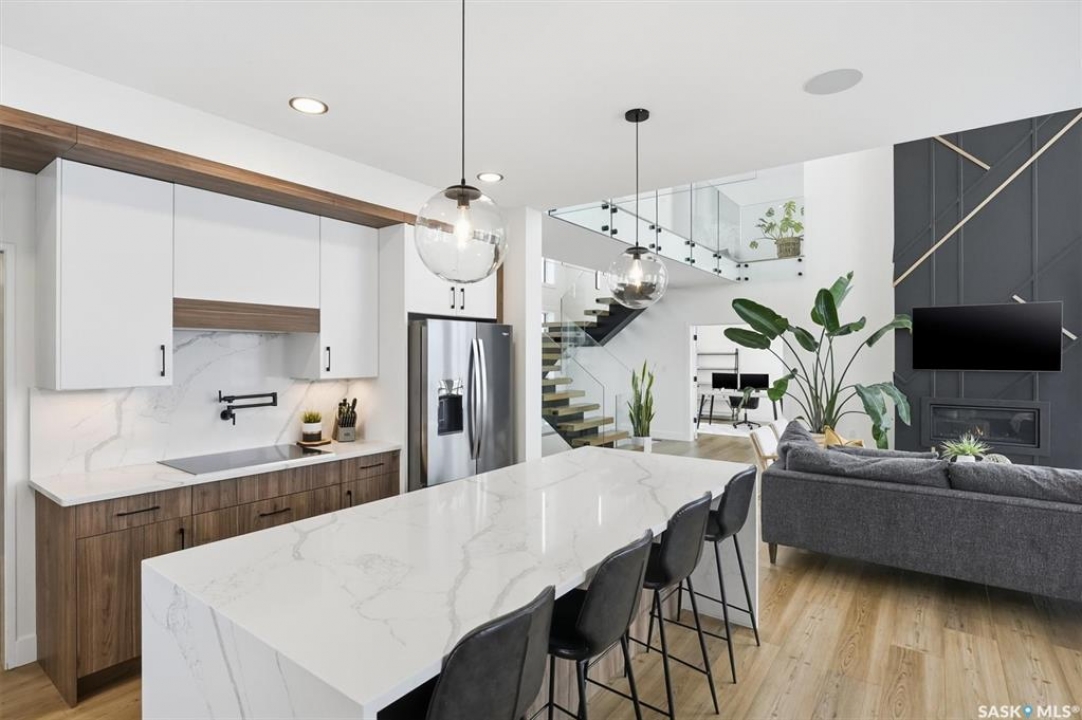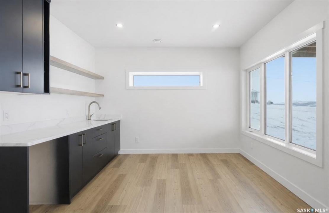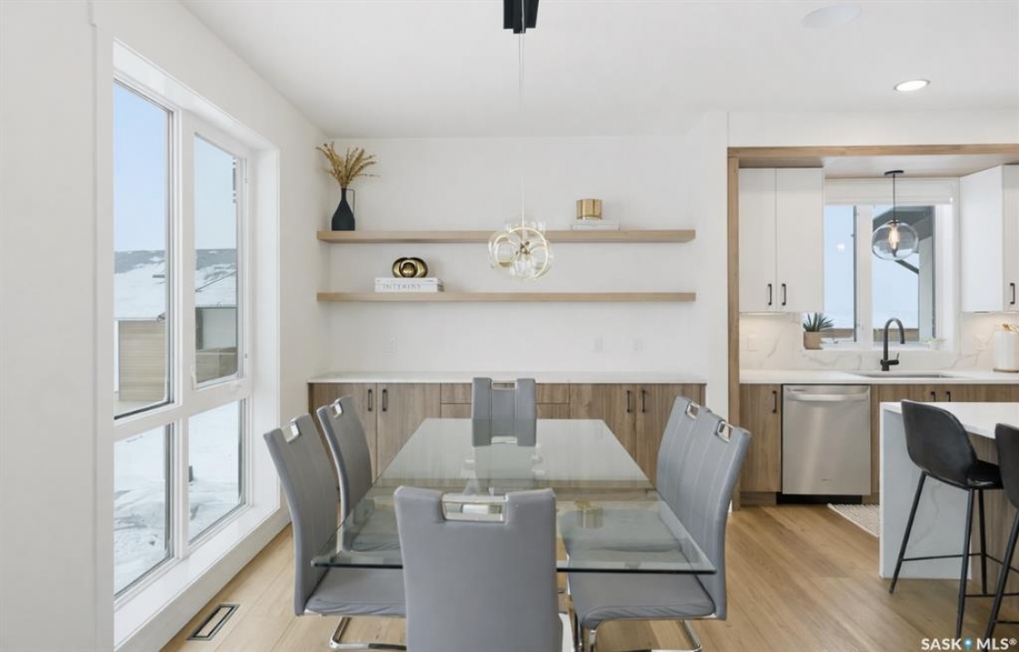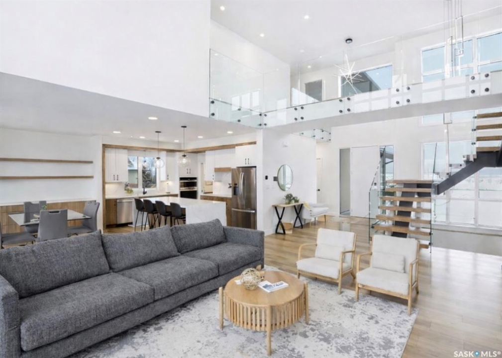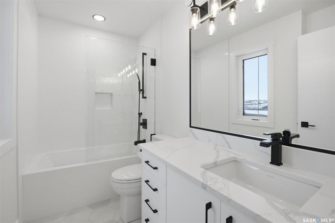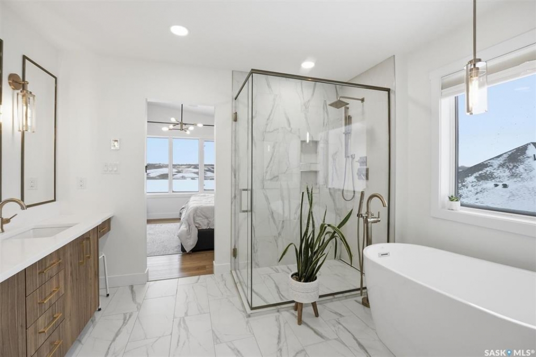 Lakefront modern luxury, just minutes south of Saskatoon — close to 4000 sq feet of living space, with all the bells and whistles! Offering 2,609 sq. ft., this stunning two-storey, fully developed walkout sits on an exceptional �-acre lot with panoramic lake views and direct lake access, creating a lifestyle truly dreams are made of. This custom-built masterpiece features 4 bedrooms and 4 bathrooms, a triple heated attached garage with drive-through bay, plus an additional double detached shop — a rare, sought-after combination. Inside, expansive full-height windows flood the home with natural light while showcasing breathtaking lake views. Professional, show-stopping design is evident throughout, with high-end finishes including a sleek white and walnut custom chef's kitchen, double-height ceilings on the main floor, soaring 2 story feature fireplace feature in living room, and extensive glass railings framing a dramatic staircase, second-floor overlook, and spacious bonus room. The main level includes very open and spacious living and dining areas, a walk-through butler's pantry, equipped boot room, 1/2 bath, and a large light-filled office/den. The upper level offers a luxurious primary suite with a second fireplace and spa-like 5 piece bath, two generously sized bedrooms, large main bath, and a spacious bonus room. The fully developed walkout lower level adds more luxurious space, featuring a wet bar, family room, games area, gym/den, fourth bedroom/guest suite, and a four-piece bathroom. Additional upgrades and features include an induction cooktop, pot filler, quartz countertops throughout, high-end flooring, tile work, and millwork, two fireplaces, sound system and security rough-ins, smart-home (roughed in), a zoned furnace system, grid-tied 8kW solar panels, in floor heat in 2 baths, detached double shop 30x26, a gravel front drive, more. An extraordinary lakefront home, just minutes from the city.