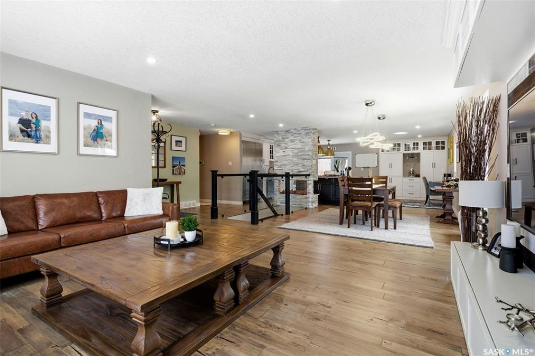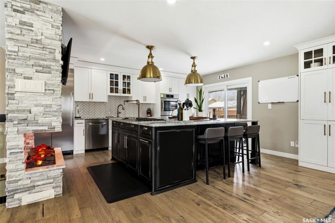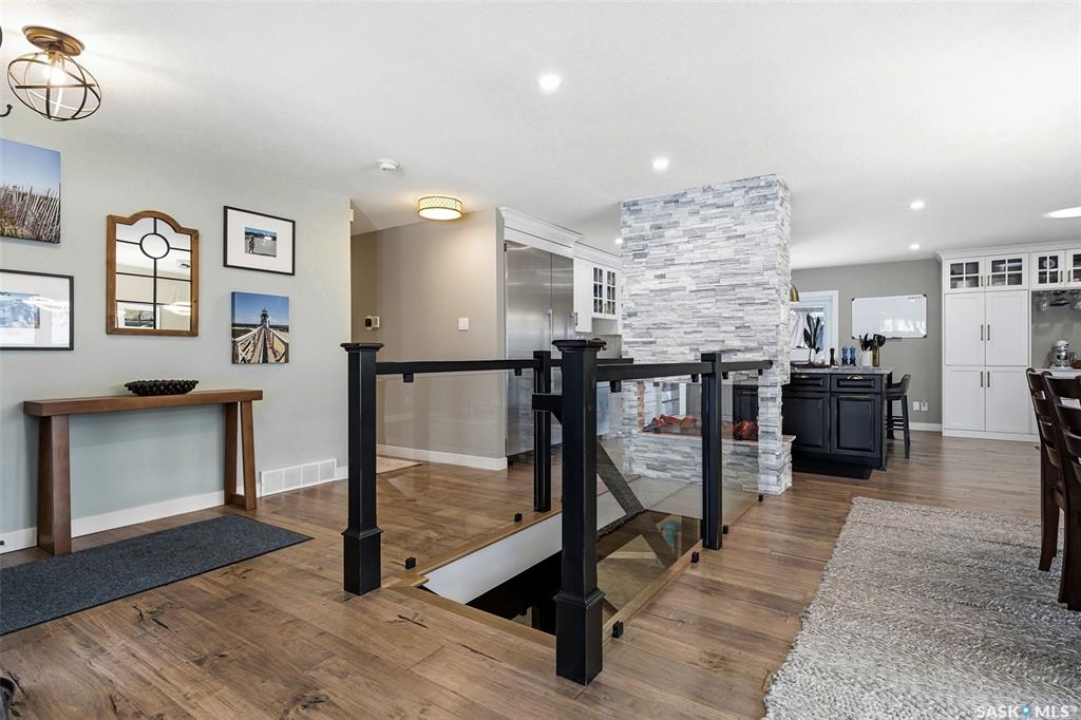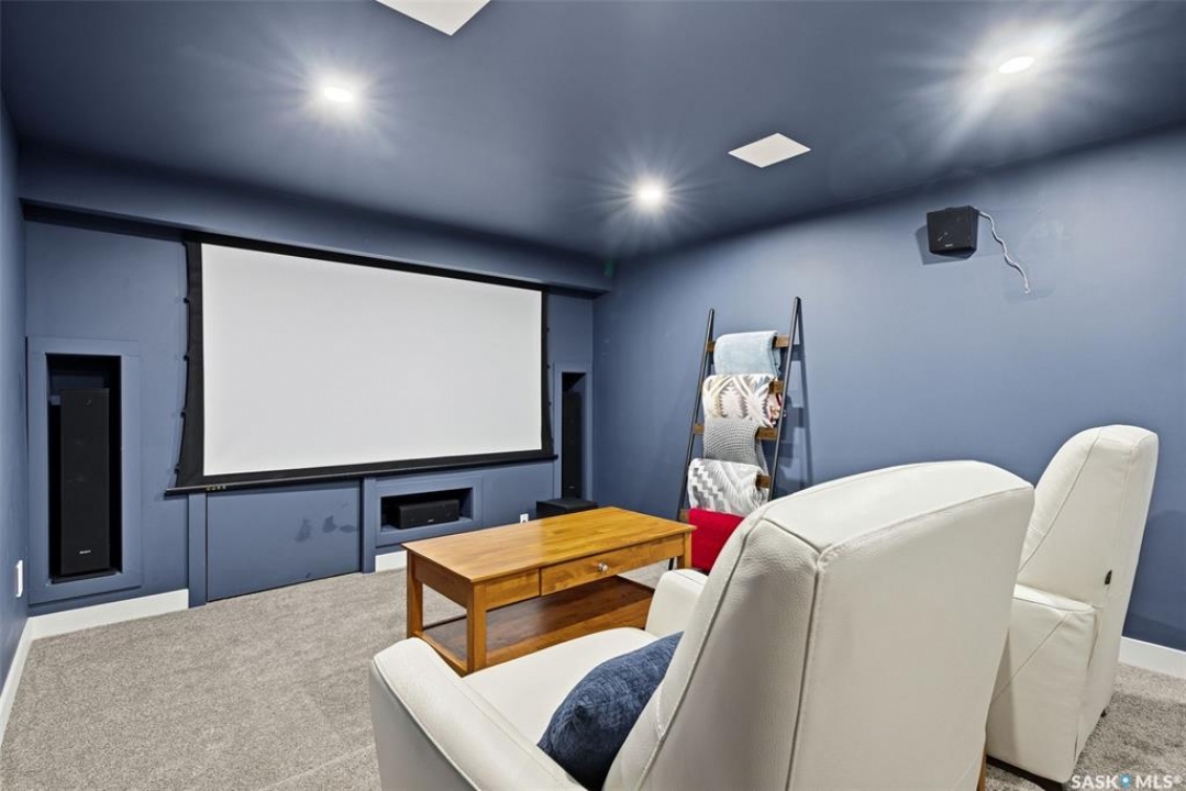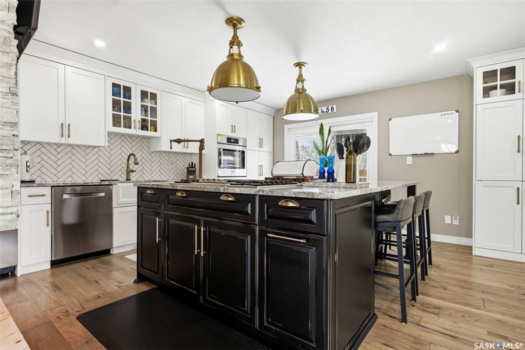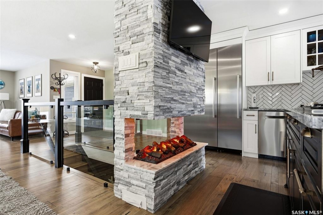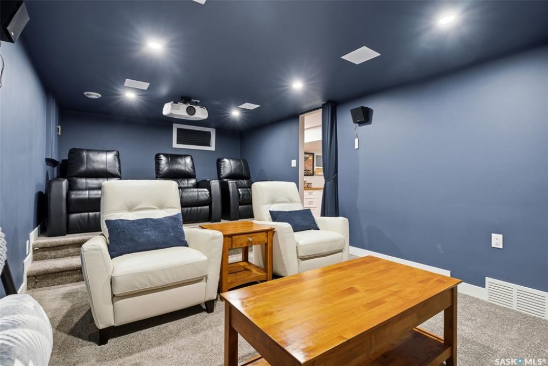 Welcome to this exceptional 1,719 sq. ft. luxury bungalow in Regina, where thoughtful design, premium materials, and refined craftsmanship meet valuable recent upgrades for peace of mind. The bright open-concept main floor features engineered hardwood and tile throughout, highlighted by a striking double-sided vapour fireplace that adds ambiance without maintenance. At the heart of the home is a chef-inspired gourmet kitchen designed for both everyday living and upscale entertaining. It boasts stone countertops, a Bosch commercial refrigerator/freezer, Bosch double convection ovens with warming drawer, motorized microwave, five-burner gas cooktop with pop-out ventilation, pot filler, apron sink, touch-activated faucet, soft-close cabinetry, and a large eat-up island with prep sink, pop-out outlet, and hidden storage. The inviting living room offers a custom feature wall, built-in shelving, and abundant natural light, while the dining area with bay window provides an elegant space for gatherings. Three well-appointed bedrooms and a beautifully finished four-piece bathroom complete the main floor. The primary suite is a true retreat, featuring custom closet organizers and a walk-through closet leading to a spa-inspired ensuite with soaker tub, double vanity with makeup station, rain shower with dual heads, towel warmer, and heated floors. The fully finished lower level includes a spacious recreation room, sound-proofed office, full bathroom, and private theatre room. The home is fully wired with coax and CAT5, offers discreet laundry cabinetry, and provides direct access to the garage from the basement mudroom. Recent upgrades include brand new architectural shingles, a new fence, underground sprinklers, and a professionally landscaped backyard with deck—perfect for relaxing or entertaining. This move-in-ready home is ideal for buyers seeking single-level luxury living with high-end finishes and modern upgrades already completed.