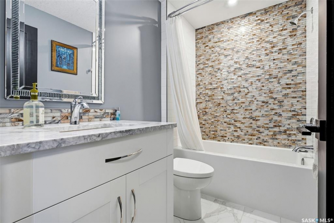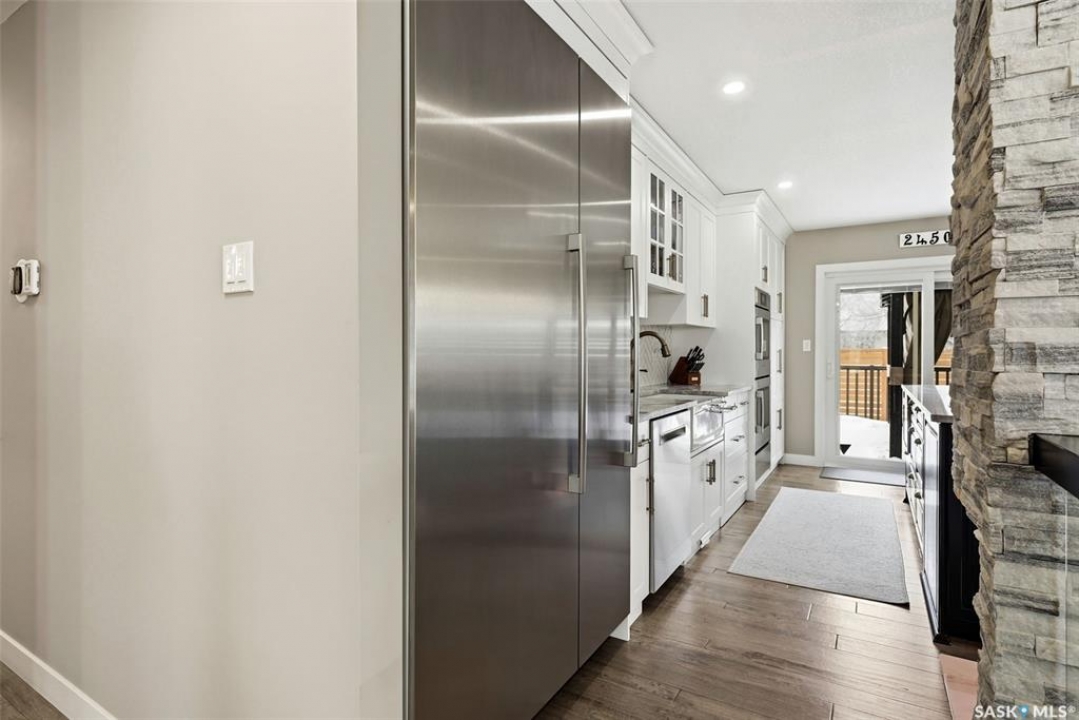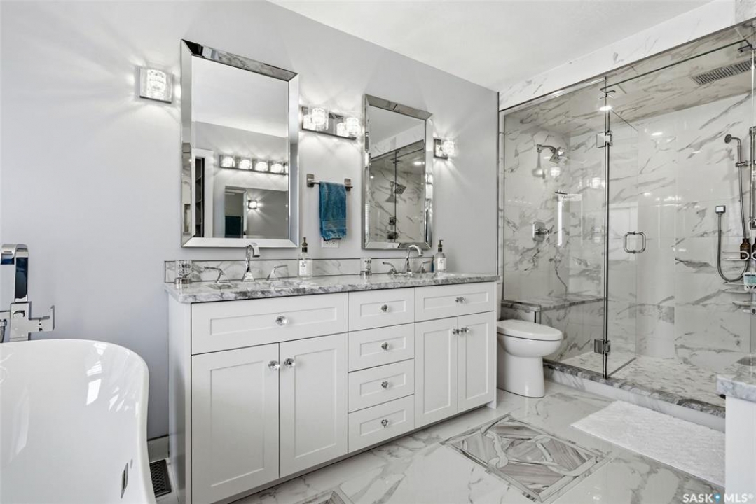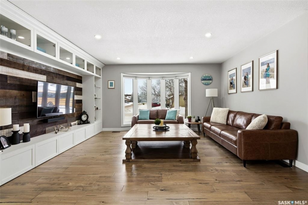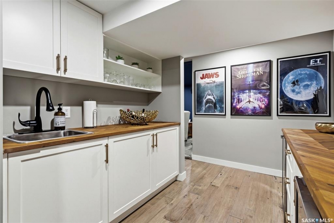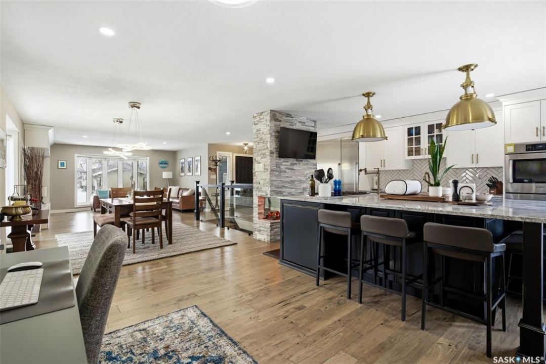 Welcome to this exceptional 1,719 sq. ft. luxury bungalow in Regina, where thoughtful design, premium materials, and refined craftsmanship meet valuable recent upgrades for peace of mind. The bright open-concept main floor features engineered hardwood and tile throughout, highlighted by a striking double-sided vapour fireplace that adds ambiance without maintenance. At the heart of the home is a chef-inspired gourmet kitchen designed for both everyday living and upscale entertaining. It boasts stone countertops, a Bosch commercial refrigerator/freezer, Bosch double convection ovens with warming drawer, motorized microwave, five-burner gas cooktop with pop-out ventilation, pot filler, apron sink, touch-activated faucet, soft-close cabinetry, and a large eat-up island with prep sink, pop-out outlet, and hidden storage. The inviting living room offers a custom feature wall, built-in shelving, and abundant natural light, while the dining area with bay window provides an elegant space for gatherings. Three well-appointed bedrooms and a beautifully finished four-piece bathroom complete the main floor. The primary suite is a true retreat, featuring custom closet organizers and a walk-through closet leading to a spa-inspired ensuite with soaker tub, double vanity with makeup station, rain shower with dual heads, towel warmer, and heated floors. The fully finished lower level includes a spacious recreation room, sound-proofed office, full bathroom, and private theatre room. The home is fully wired with coax and CAT5, offers discreet laundry cabinetry, and provides direct access to the garage from the basement mudroom. Recent upgrades include brand new architectural shingles, a new fence, underground sprinklers, and a professionally landscaped backyard with deck—perfect for relaxing or entertaining. This move-in-ready home is ideal for buyers seeking single-level luxury living with high-end finishes and modern upgrades already completed.