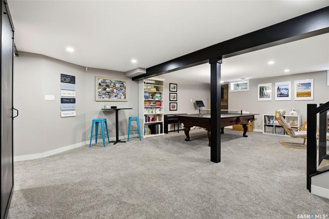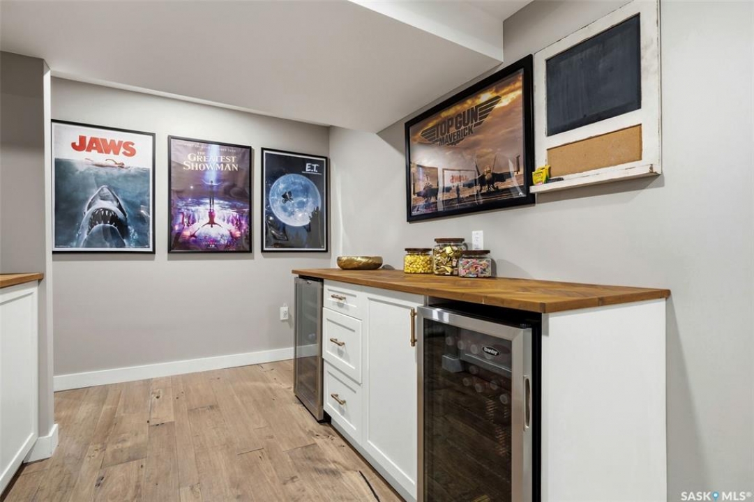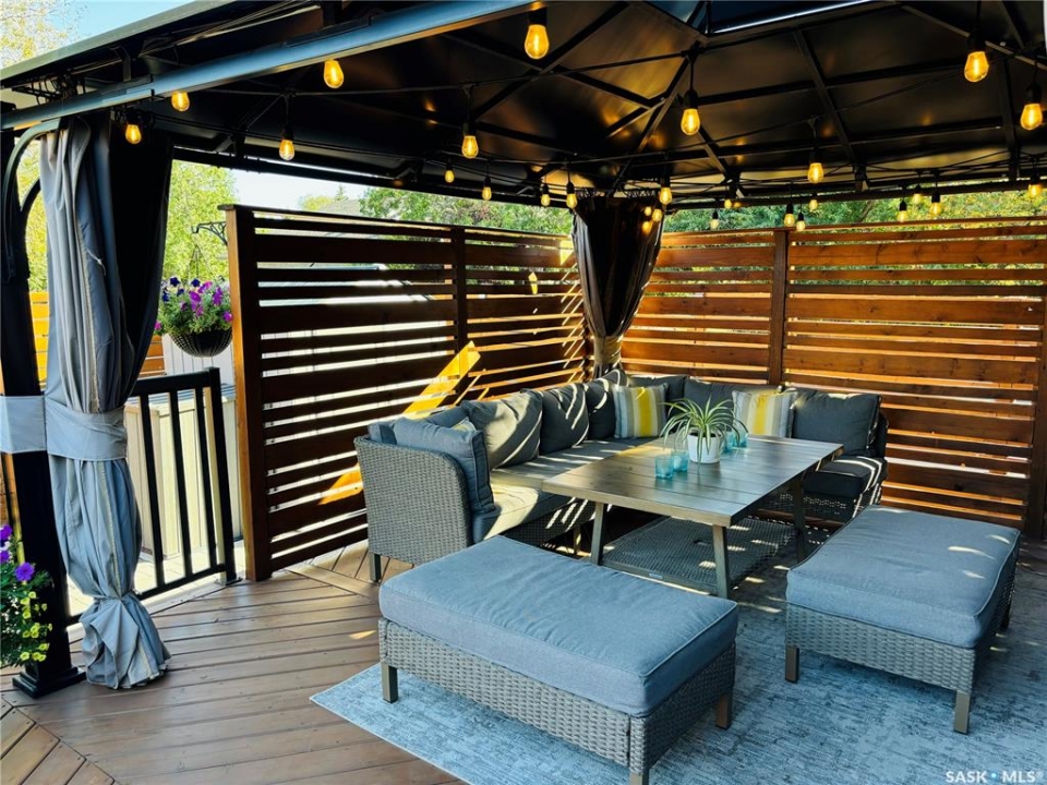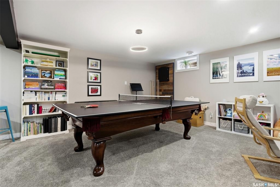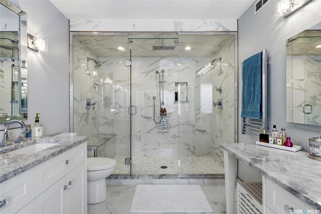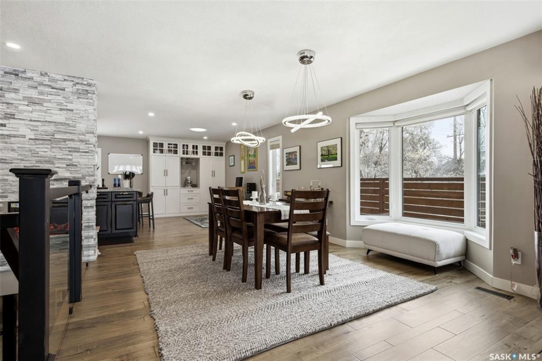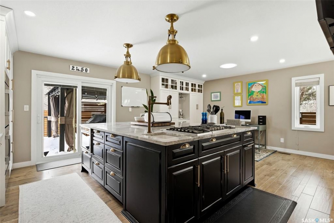 Welcome to this exceptional 1,719 sq. ft. luxury bungalow in Regina, where thoughtful design, premium materials, and refined craftsmanship meet valuable recent upgrades for peace of mind. The bright open-concept main floor features engineered hardwood and tile throughout, highlighted by a striking double-sided vapour fireplace that adds ambiance without maintenance. At the heart of the home is a chef-inspired gourmet kitchen designed for both everyday living and upscale entertaining. It boasts stone countertops, a Bosch commercial refrigerator/freezer, Bosch double convection ovens with warming drawer, motorized microwave, five-burner gas cooktop with pop-out ventilation, pot filler, apron sink, touch-activated faucet, soft-close cabinetry, and a large eat-up island with prep sink, pop-out outlet, and hidden storage. The inviting living room offers a custom feature wall, built-in shelving, and abundant natural light, while the dining area with bay window provides an elegant space for gatherings. Three well-appointed bedrooms and a beautifully finished four-piece bathroom complete the main floor. The primary suite is a true retreat, featuring custom closet organizers and a walk-through closet leading to a spa-inspired ensuite with soaker tub, double vanity with makeup station, rain shower with dual heads, towel warmer, and heated floors. The fully finished lower level includes a spacious recreation room, sound-proofed office, full bathroom, and private theatre room. The home is fully wired with coax and CAT5, offers discreet laundry cabinetry, and provides direct access to the garage from the basement mudroom. Recent upgrades include brand new architectural shingles, a new fence, underground sprinklers, and a professionally landscaped backyard with deck—perfect for relaxing or entertaining. This move-in-ready home is ideal for buyers seeking single-level luxury living with high-end finishes and modern upgrades already completed.