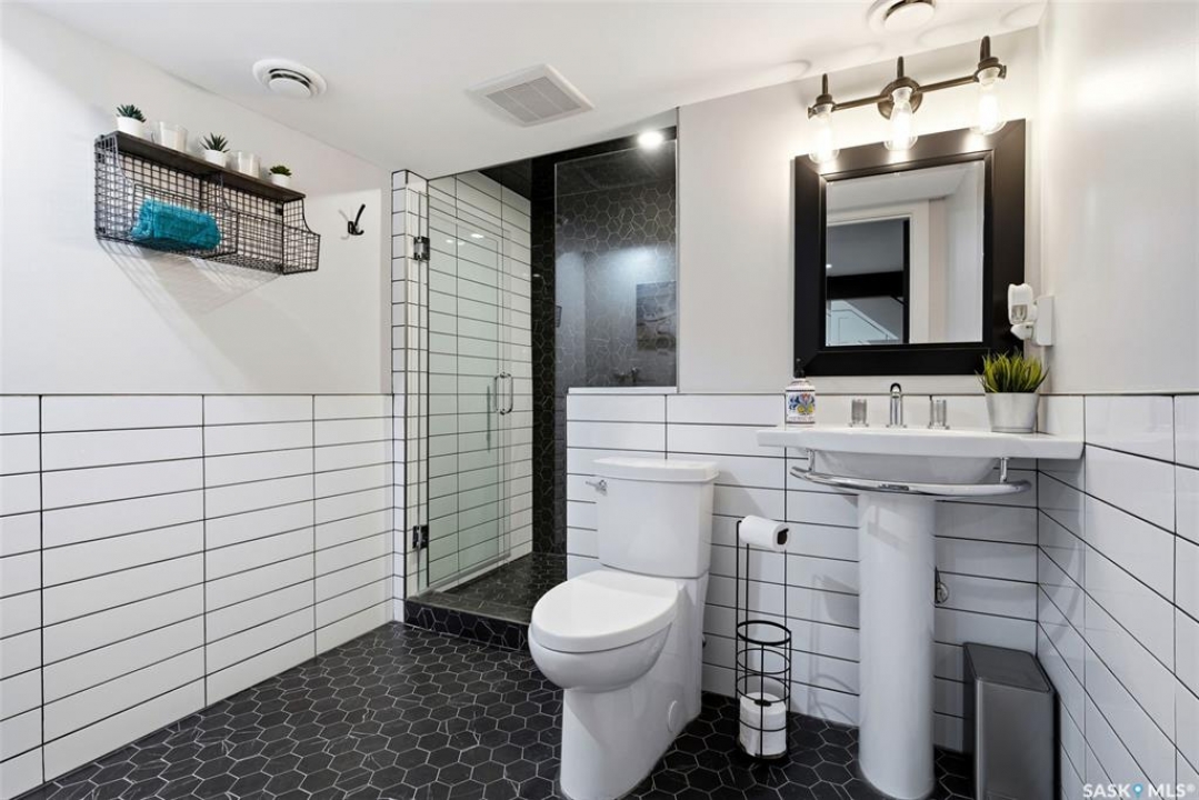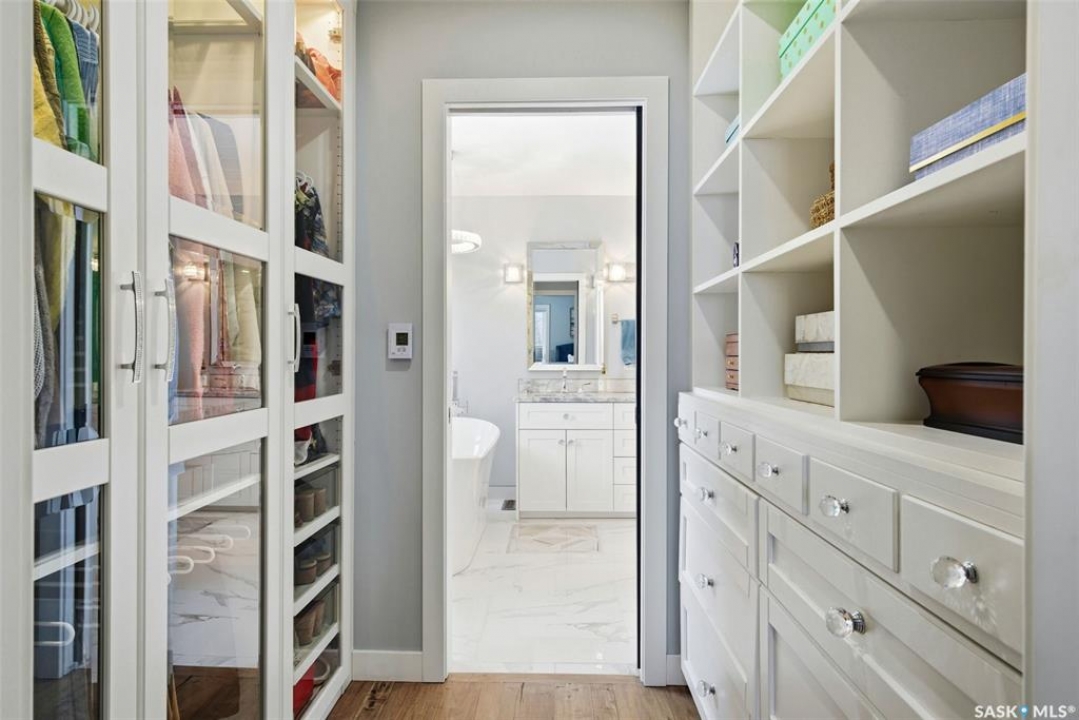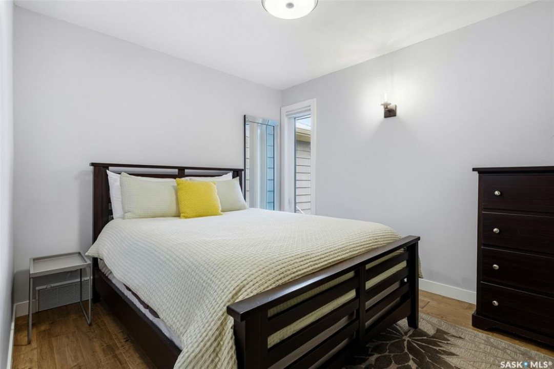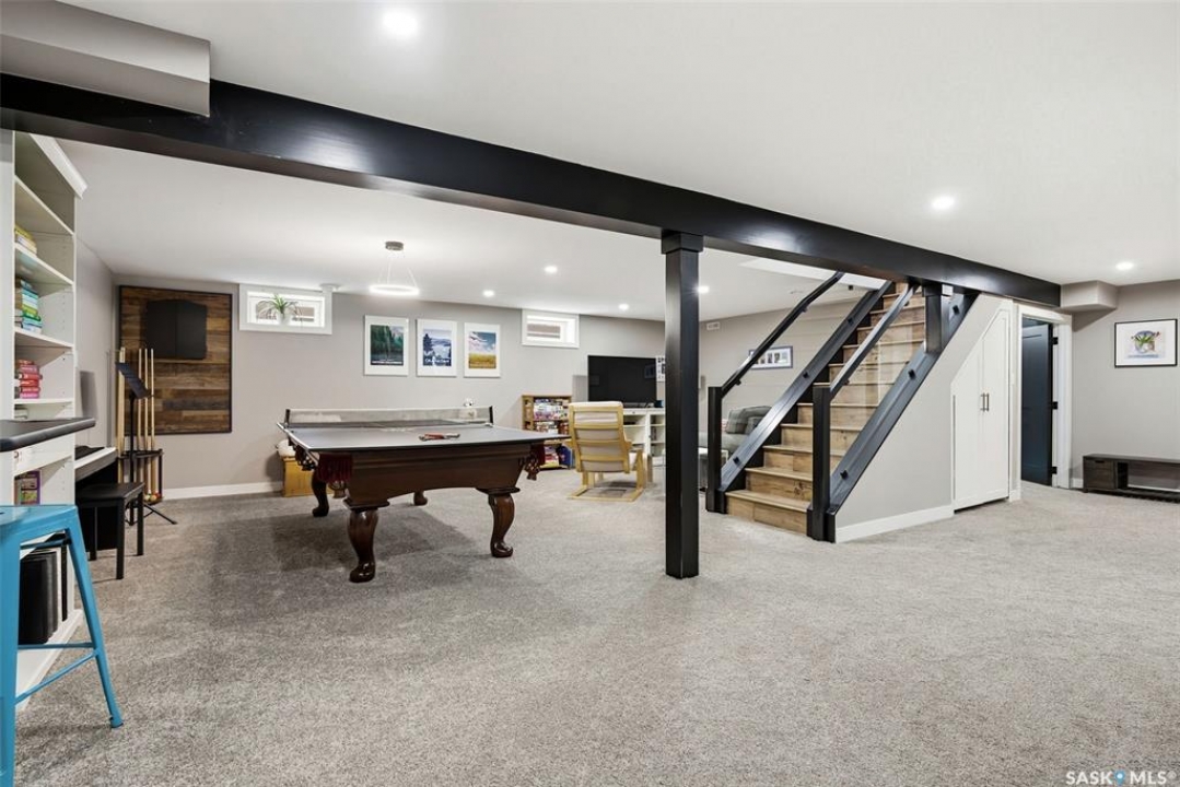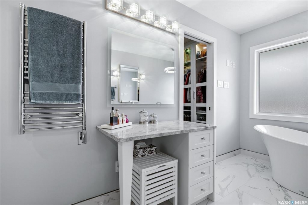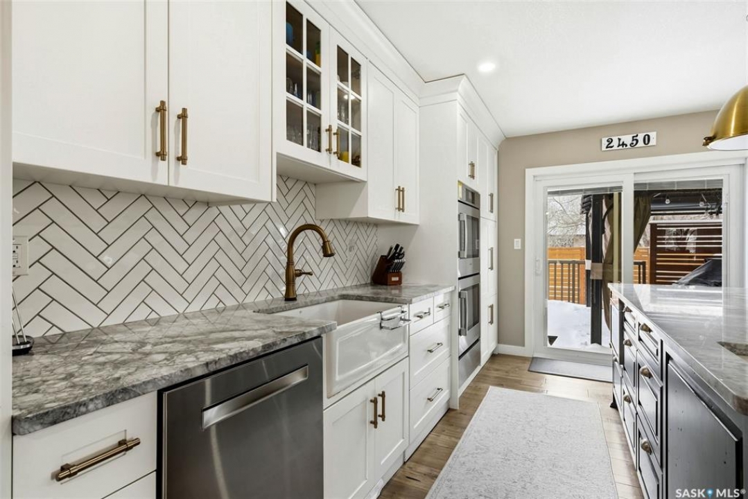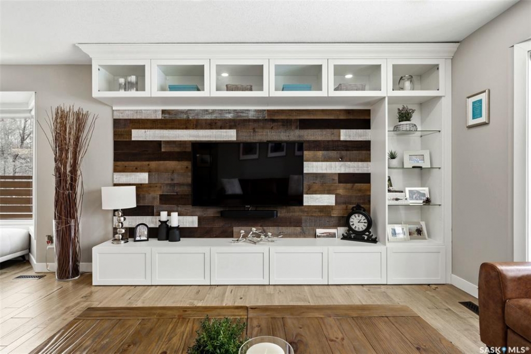 Welcome to this exceptional 1,719 sq. ft. luxury bungalow in Regina, where thoughtful design, premium materials, and refined craftsmanship meet valuable recent upgrades for peace of mind. The bright open-concept main floor features engineered hardwood and tile throughout, highlighted by a striking double-sided vapour fireplace that adds ambiance without maintenance. At the heart of the home is a chef-inspired gourmet kitchen designed for both everyday living and upscale entertaining. It boasts stone countertops, a Bosch commercial refrigerator/freezer, Bosch double convection ovens with warming drawer, motorized microwave, five-burner gas cooktop with pop-out ventilation, pot filler, apron sink, touch-activated faucet, soft-close cabinetry, and a large eat-up island with prep sink, pop-out outlet, and hidden storage. The inviting living room offers a custom feature wall, built-in shelving, and abundant natural light, while the dining area with bay window provides an elegant space for gatherings. Three well-appointed bedrooms and a beautifully finished four-piece bathroom complete the main floor. The primary suite is a true retreat, featuring custom closet organizers and a walk-through closet leading to a spa-inspired ensuite with soaker tub, double vanity with makeup station, rain shower with dual heads, towel warmer, and heated floors. The fully finished lower level includes a spacious recreation room, sound-proofed office, full bathroom, and private theatre room. The home is fully wired with coax and CAT5, offers discreet laundry cabinetry, and provides direct access to the garage from the basement mudroom. Recent upgrades include brand new architectural shingles, a new fence, underground sprinklers, and a professionally landscaped backyard with deck—perfect for relaxing or entertaining. This move-in-ready home is ideal for buyers seeking single-level luxury living with high-end finishes and modern upgrades already completed.