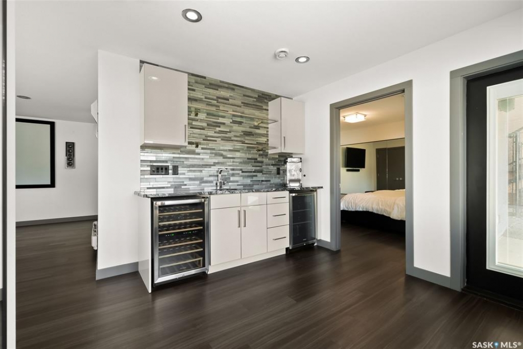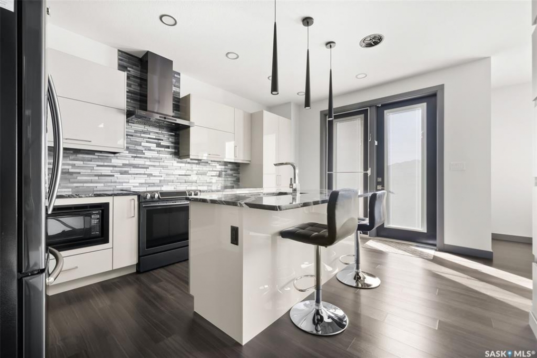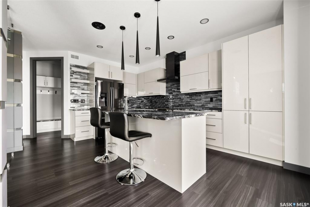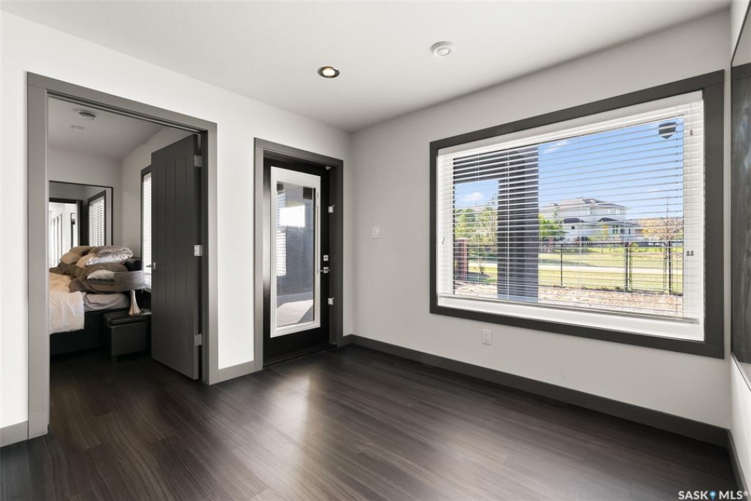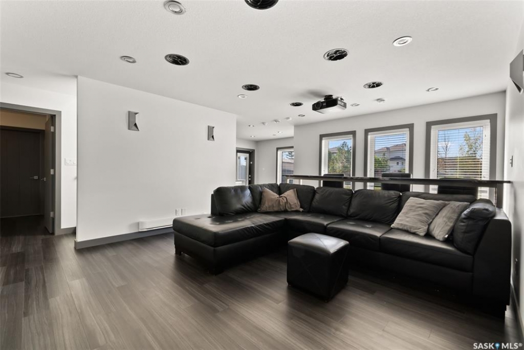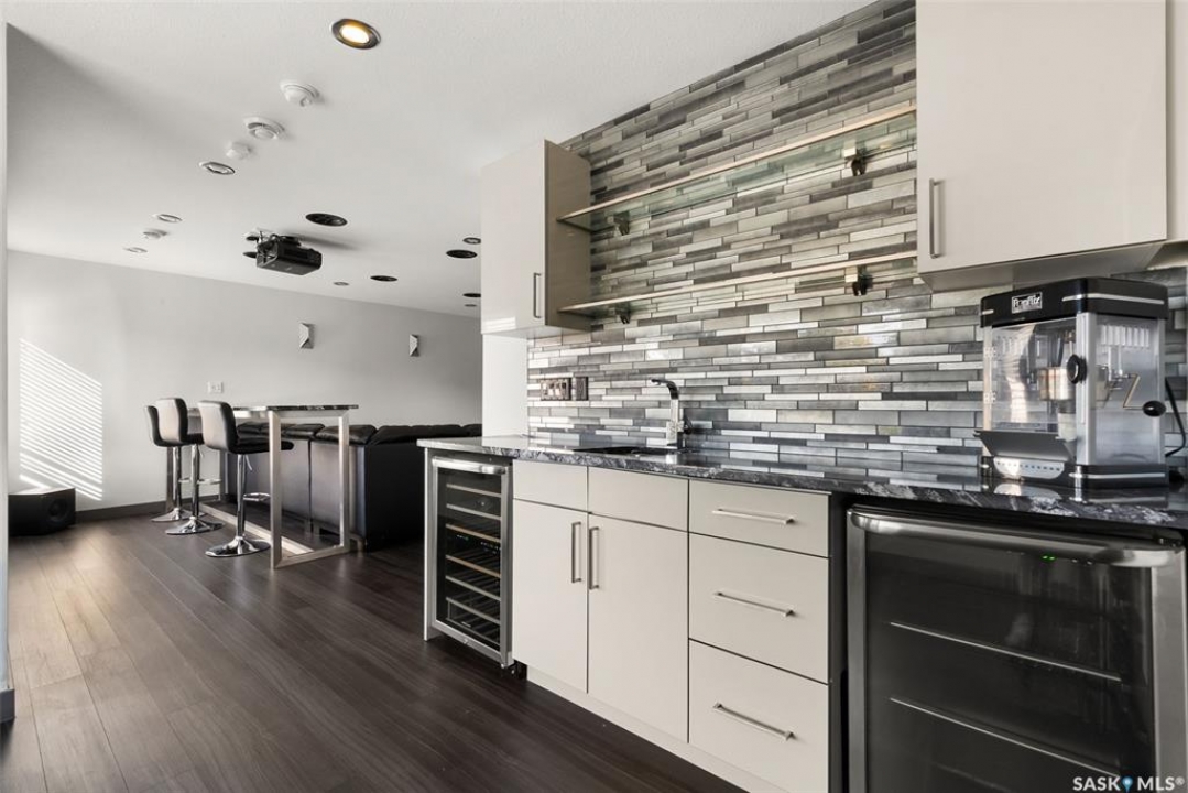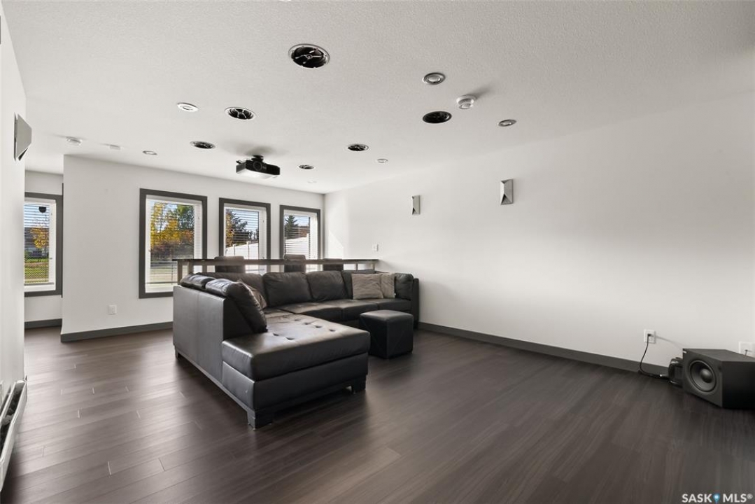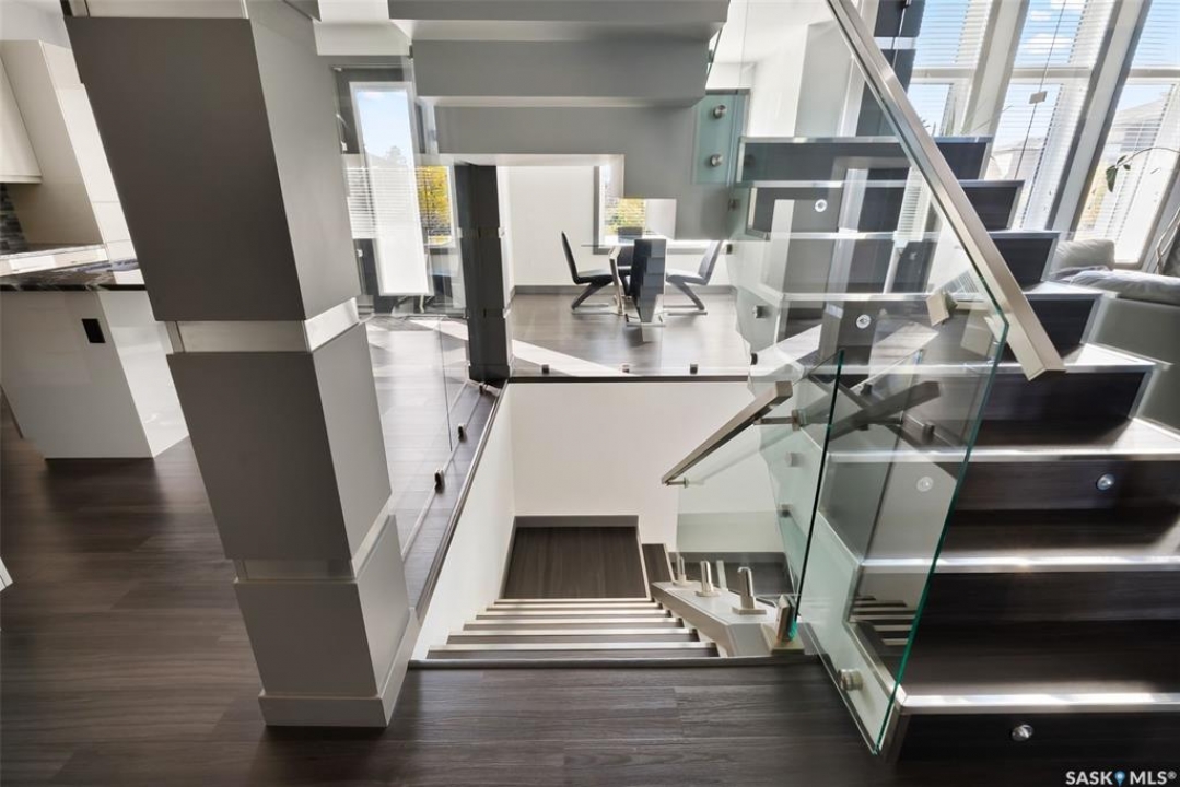 Welcome to this stunning custom-built walkout in Fairways West! This home is in a prime location and backs the beautiful green space and walking path leading to the Goulet Golf Course. The moment you step inside, 19-foot ceilings and floor-to-ceiling windows create a dramatic sense of space and light. A striking glass-and-stainless steel staircase, accented with subtle stair lighting, introduces the home's modern, refined style. The kitchen is both beautiful and practical, featuring custom white cabinetry, a generous sit-up island, granite countertops and premium stainless-steel appliances. There is garden door access from the kitchen which opens onto a private west-facing deck—ideal for morning coffee or evening entertaining while taking in the peaceful green space. Upstairs you'll find the primary retreat, complete with a walk-in closet and a luxurious five-piece ensuite featuring dual vanities, a stand-alone soaker tub and a custom-tiled shower. Two additional bedrooms, a four-piece bath, and a convenient laundry room complete this level. The fully developed walkout basement is built for entertaining or unwinding after a long day. The rec room is set up as a perfect home theatre complete with a projector screen and built-in sound system! A sleek wet bar adds style and convenience, while the fourth bedroom doubles as a guest room, office, or home gym. Expansive windows keep the space bright and welcoming. The oversized double attached garage is a standout—heated, drywalled and equipped with 12-foot ceilings, a floor drain, and water taps. There are built-in speakers throughout the house and receivers are all included. Every detail in this home combines contemporary design with practical luxury. Discover a residence where craftsmanship and lifestyle meet in one exceptional property. This Fairways West show piece is one you do not want to miss out on!