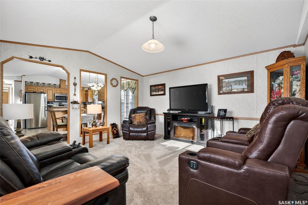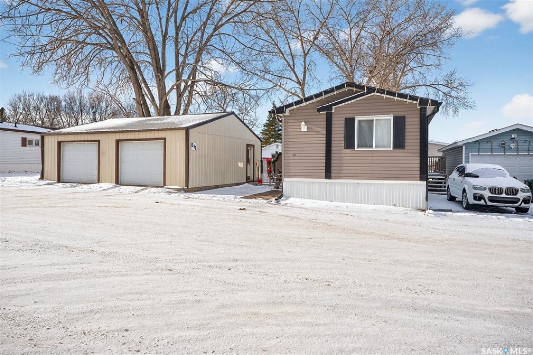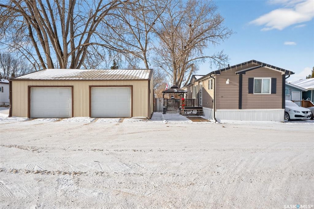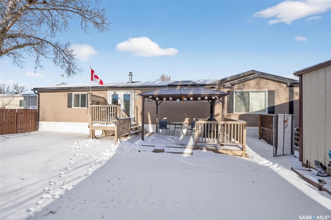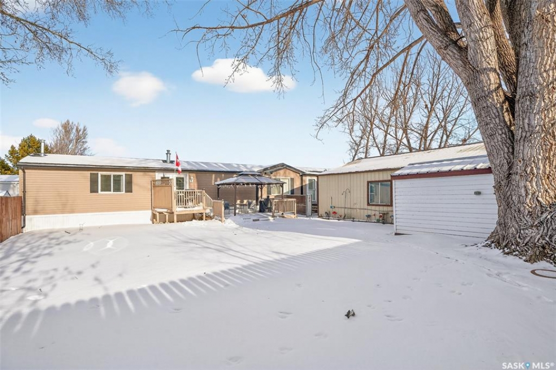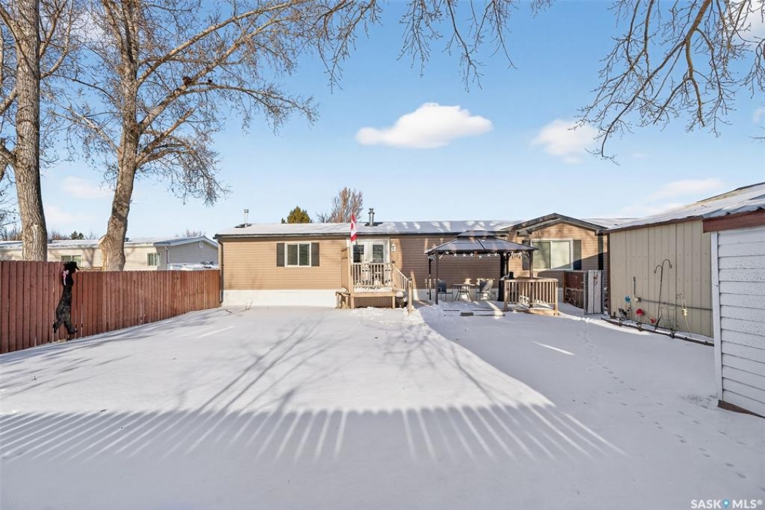 Nestled in the popular Prairie Oasis Trailer Court, this spacious 1,216 sq/ft 3-BED, 2-BATH HOME, built in 2008, offers a comfortable & modern living space. The open-concept living and dining areas are bright and inviting, featuring vaulted ceilings and abundant natural light—perfect for both everyday living and entertaining. The eat-in oak kitchen features an island, newer appliances replaced within the last five years, and is conveniently adjacent to the dining area. The primary bedroom is generously sized and includes a walk-in closet and a 4-piece ensuite. Additional highlights include central air conditioning, two decks, shingles replaced approximately three years ago, and an enormous fenced yard with plenty of lawn space, a covered gazebo, and a DOUBLE CAR HEATED garage. Monthly fees total $816.35, covering lot rent, city taxes ($95.49/month), and garbage/recycling services. With its combination of practical features, a prime location, and move-in-ready condition, this home is an excellent choice for anyone looking to settle in a welcoming community. Don't miss out on this fantastic opportunity—schedule your viewing today!