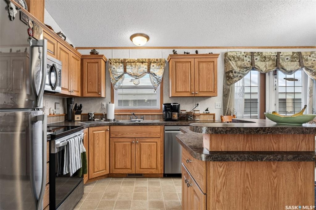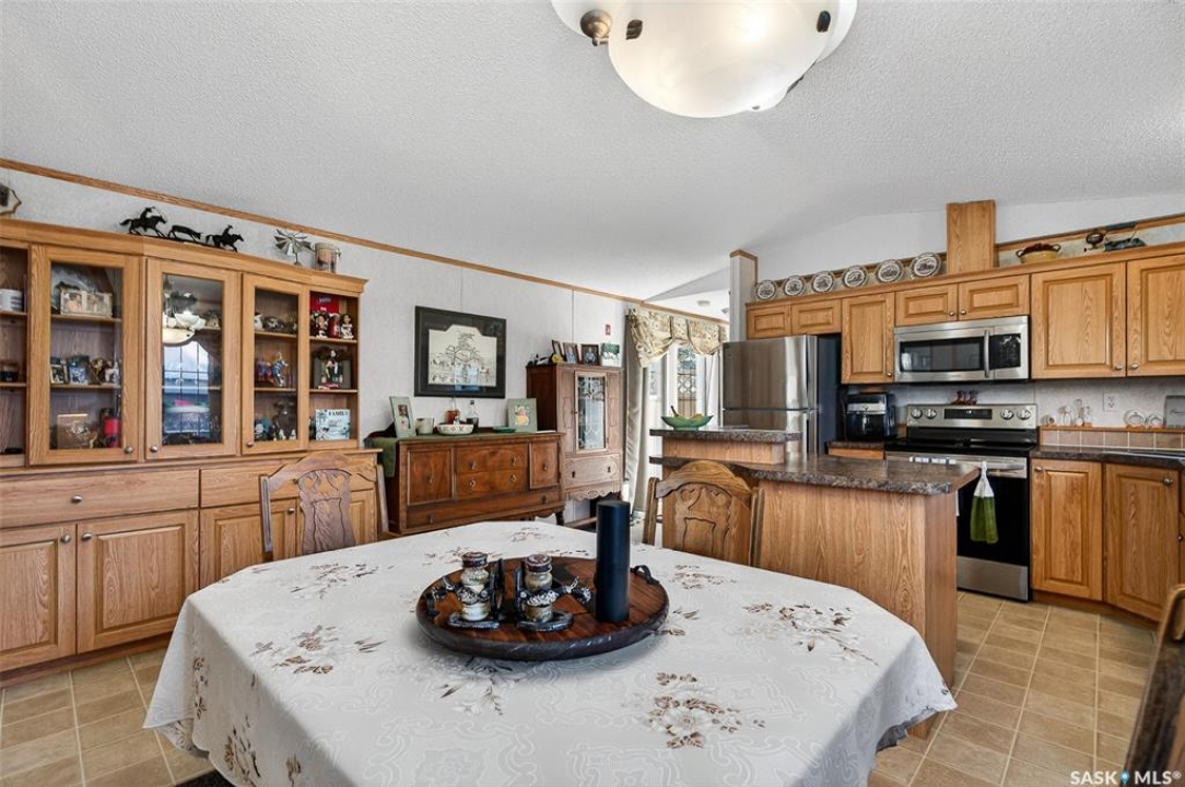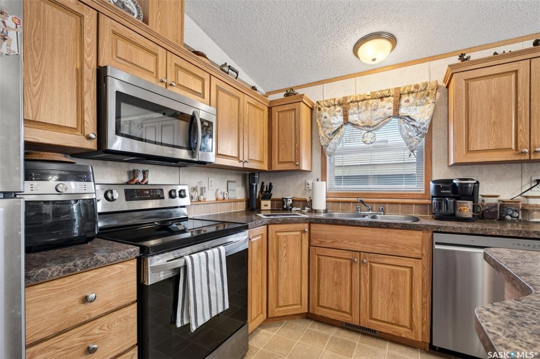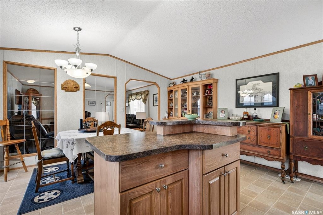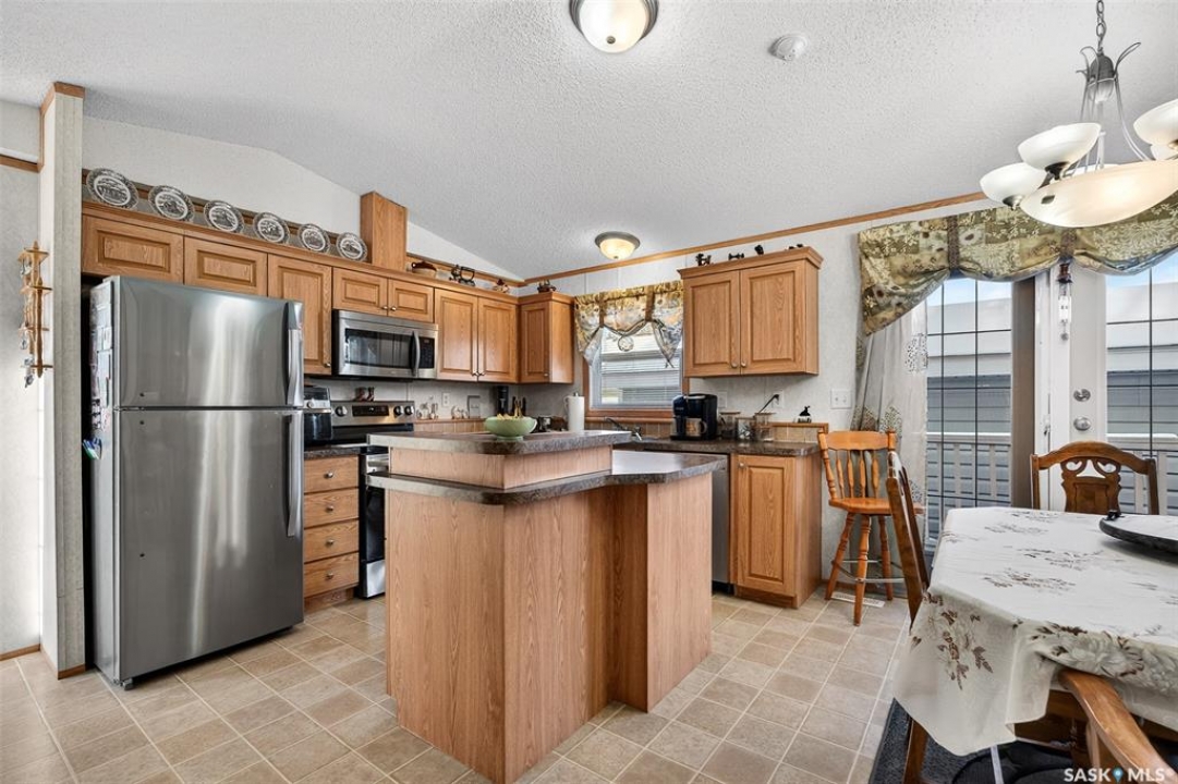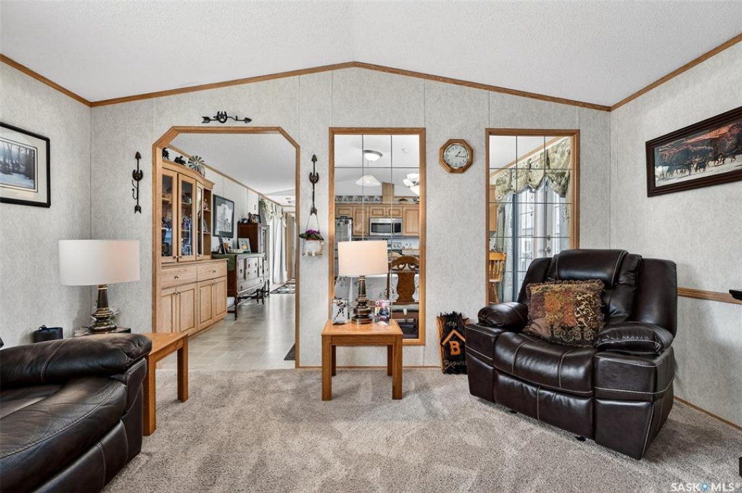 Nestled in the popular Prairie Oasis Trailer Court, this spacious 1,216 sq/ft 3-BED, 2-BATH HOME, built in 2008, offers a comfortable & modern living space. The open-concept living and dining areas are bright and inviting, featuring vaulted ceilings and abundant natural light—perfect for both everyday living and entertaining. The eat-in oak kitchen features an island, newer appliances replaced within the last five years, and is conveniently adjacent to the dining area. The primary bedroom is generously sized and includes a walk-in closet and a 4-piece ensuite. Additional highlights include central air conditioning, two decks, shingles replaced approximately three years ago, and an enormous fenced yard with plenty of lawn space, a covered gazebo, and a DOUBLE CAR HEATED garage. Monthly fees total $816.35, covering lot rent, city taxes ($95.49/month), and garbage/recycling services. With its combination of practical features, a prime location, and move-in-ready condition, this home is an excellent choice for anyone looking to settle in a welcoming community. Don't miss out on this fantastic opportunity—schedule your viewing today!