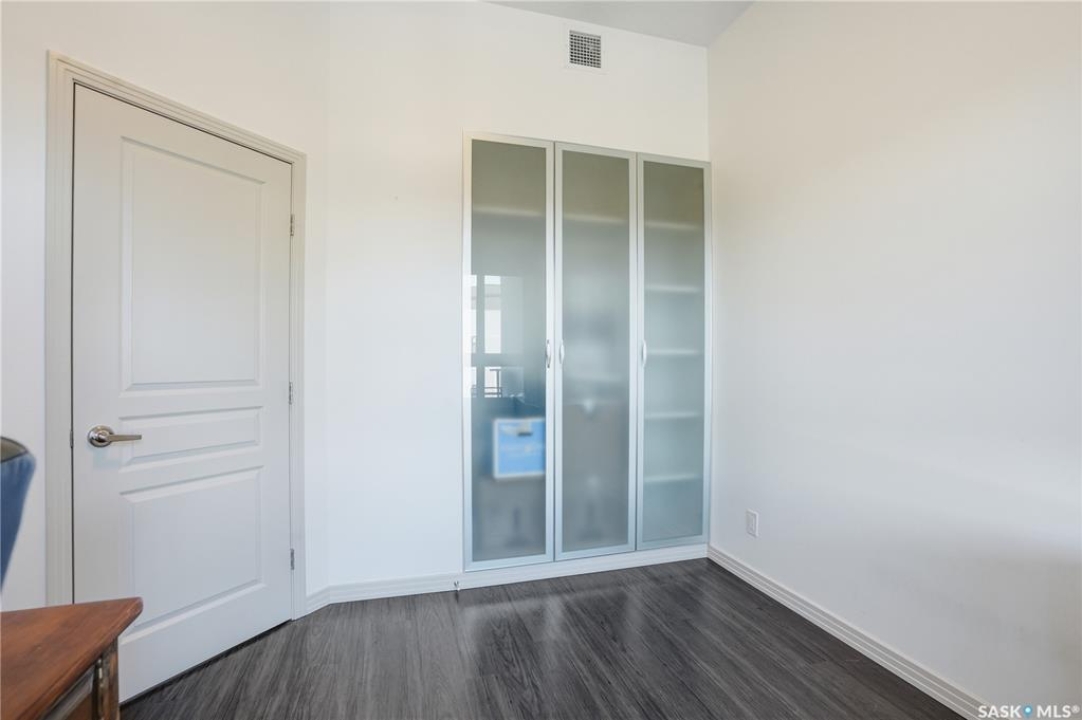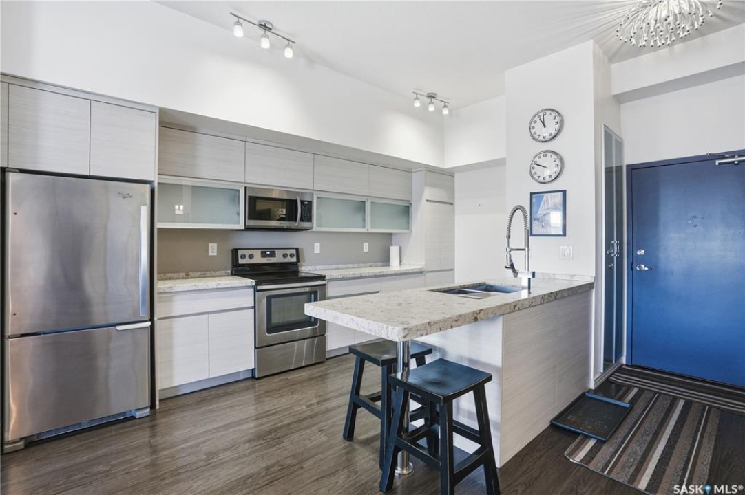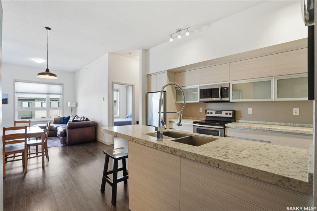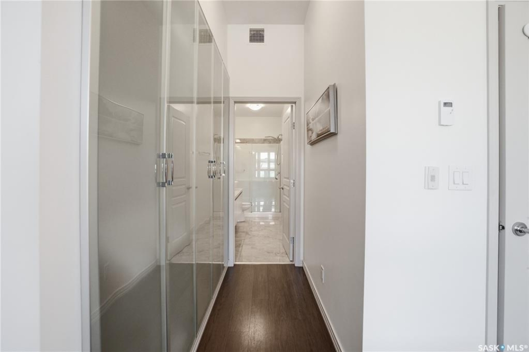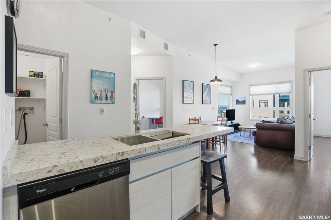 Spectacular top-floor condo in Sequoia Square! This impressive 2-bedroom, 2-bathroom residence features 10-foot ceilings and oversized windows that flood the space with natural light. The open-concept floor plan is beautifully finished and includes in-floor heating throughout for year-round comfort. The kitchen is designed to impress with quartz countertops, soft-close cabinetry, stainless steel appliances, and seamless flow into the dining and living areas. The primary bedroom is a true retreat, offering large windows, a sophisticated dressing/closet area, and a modern en-suite with double sinks, heated tile flooring, and a walk-in shower. A second bedroom, four-piece bathroom, and convenient laundry/storage room complete the interior. Additional highlights include a spacious balcony, central air conditioning, one underground parking stall with storage cage, and one electrified surface parking stall. Both parking spots are close to doors and elevator. The building offers a welcoming main lobby and recreational rooms on each floor. Ideally located with easy access to the University of Saskatchewan and surrounding amenities.