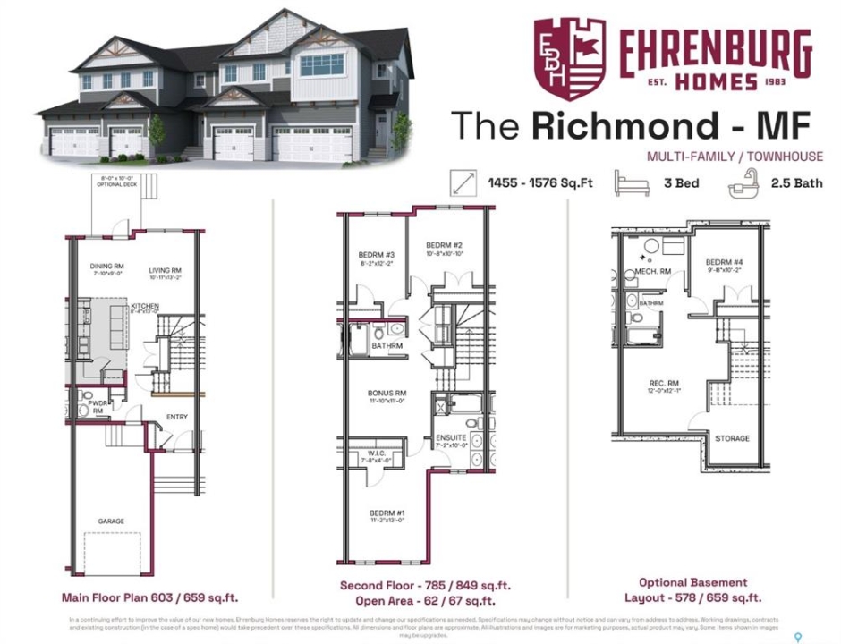 Welcome to “The Richmond” by premier builder Ehrenburg Homes, located in the vibrant Eastbrook community of Regina. This beautifully designed two-storey row/townhome offers 1,566 sq. ft. of above-grade living space and showcases quality craftsmanship with modern, functional finishes throughout. The main floor welcomes you with a bright, open-concept design finished in vinyl plank flooring, ideal for family living and entertaining. The spacious living room is filled with natural light and flows seamlessly into the dining area. The contemporary kitchen is the heart of the home, featuring a large island with eating bar, modern cabinetry, and excellent workspace—perfect for gatherings and everyday living. A convenient 2-piece bathroom completes the main level. Upstairs, you'll find three generous bedrooms, including a well-appointed primary suite with a walk-in closet and a private 4-piece ensuite including dual sinks. Two additional bedrooms are served by a 4-piece bathroom, while the second-floor laundry adds everyday convenience. A versatile bonus room provides additional living space, ideal for a family lounge, playroom, or home office. The full basement is unfinished, offering excellent potential for future development to suit your needs. Built with wood-frame construction, forced-air natural gas heating, and a gas water heater, this home is designed for efficiency and comfort. Outside, enjoy a single attached garage, underground sprinkler system in the front, and a low-maintenance lot. The home is currently under construction, with possession to be determined upon completion. Backed by the Saskatchewan New Home Warranty and Ehrenburg Homes' superior craftsmanship, The Richmond is the perfect blend of style, space, and peace of mind. PST & GST are included in the purchase price. Note: Interior photos are from a previous build of the same model; finishes and colours may vary, fireplace not included.