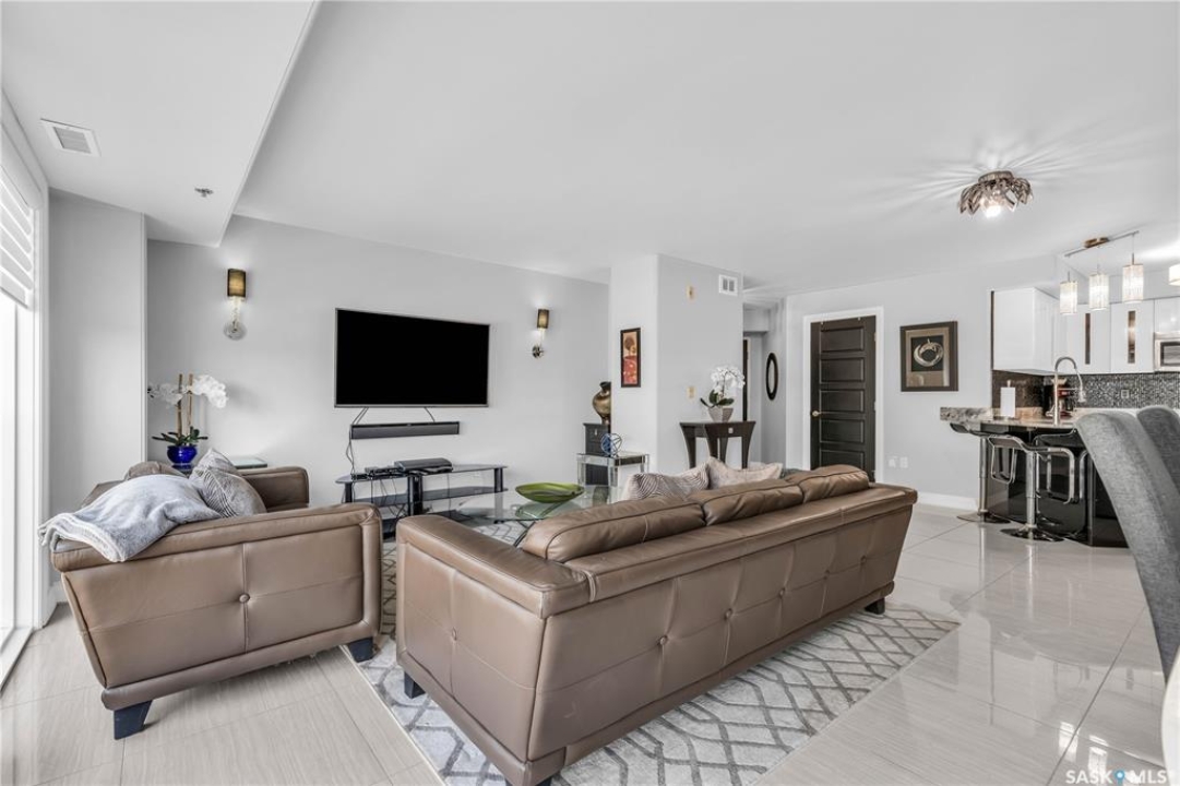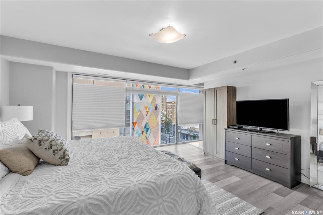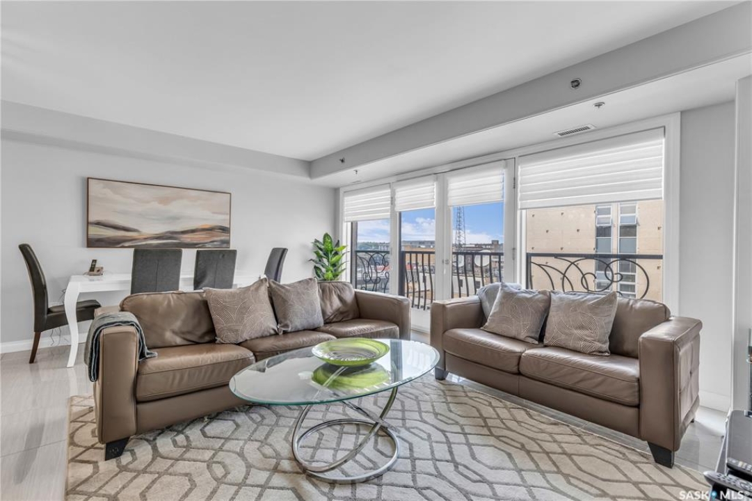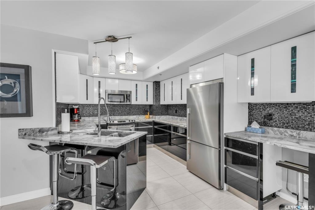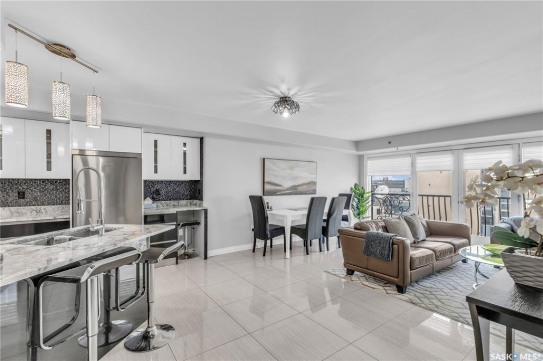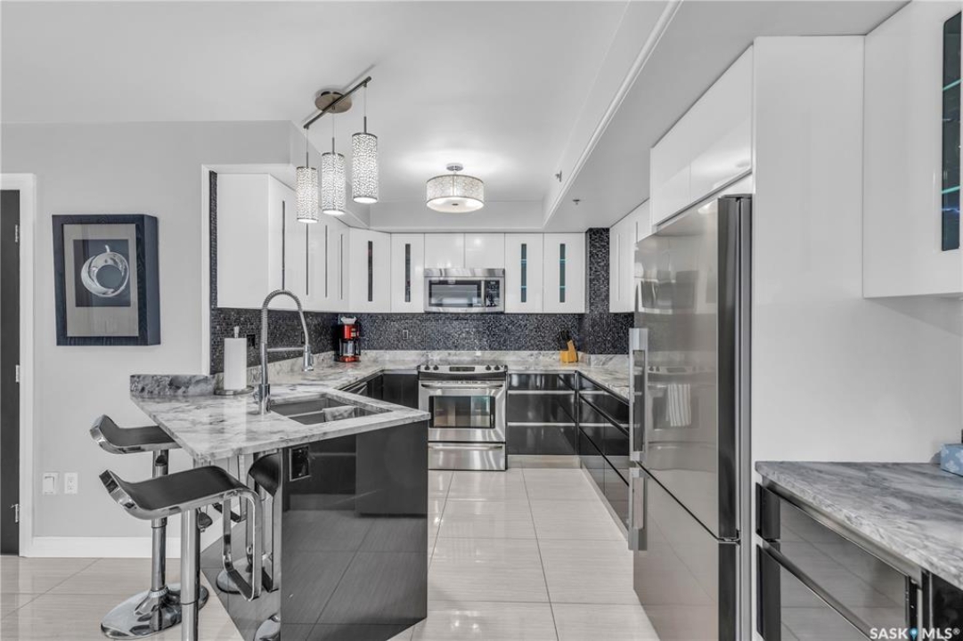 Fully-furnished top-floor executive suite with 2 bedrooms, 2 bathrooms and 2 Underground Parking Stalls! Historic elegance meets modern luxury at the Residences at King George. This iconic landmark is close to shops, dining and just a few blocks from the scenic riverfront. Luxurious limestone tile flows throughout, and floor to ceiling windows provide tons of natural light. The kitchen features sleek granite countertops and high-gloss white cabinetry with glass shelving and built-in accent lighting. A full stainless steel appliance package adds to the kitchen's functionality and style. Two sizeable bedrooms provide plenty of room for rest and relaxation, with ample closet space. The primary bedroom includes a private ensuite bathroom, ensuring a touch of luxury and privacy. The second bedroom is equally spacious, with easy access to the main bathroom, making it perfect for guests or a home office. Enjoy the convenience of in-suite laundry, and two secure underground parking spaces, providing peace of mind and protection for your vehicle year-round. For those who love to entertain or simply relax outdoors, you'll have access to a stunning rooftop deck. Complete with fully equipped outdoor kitchen, this expansive space is perfect for hosting friends or unwinding while taking in panoramic views of Saskatoon. Don't miss this chance to experience the best of historic charm and contemporary luxury at the Residences at King George.