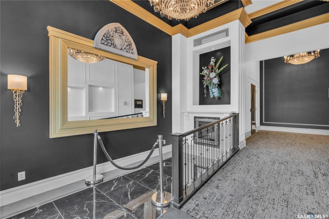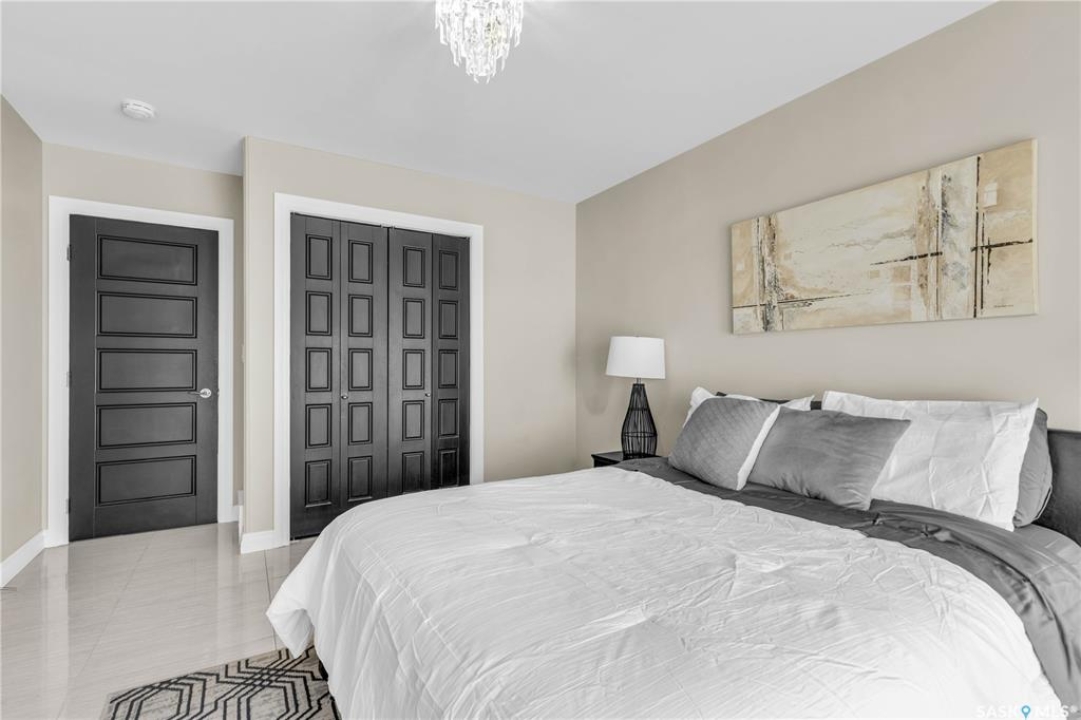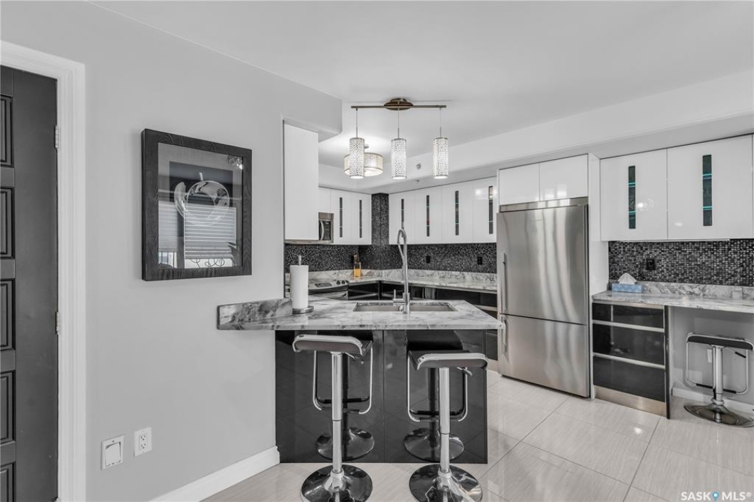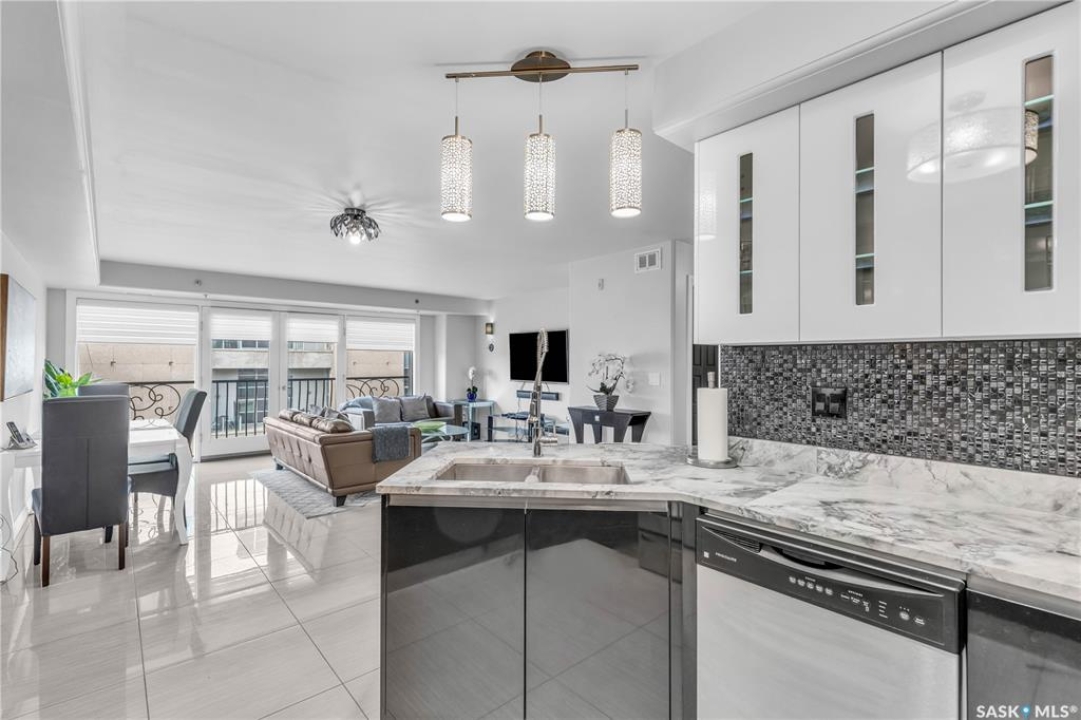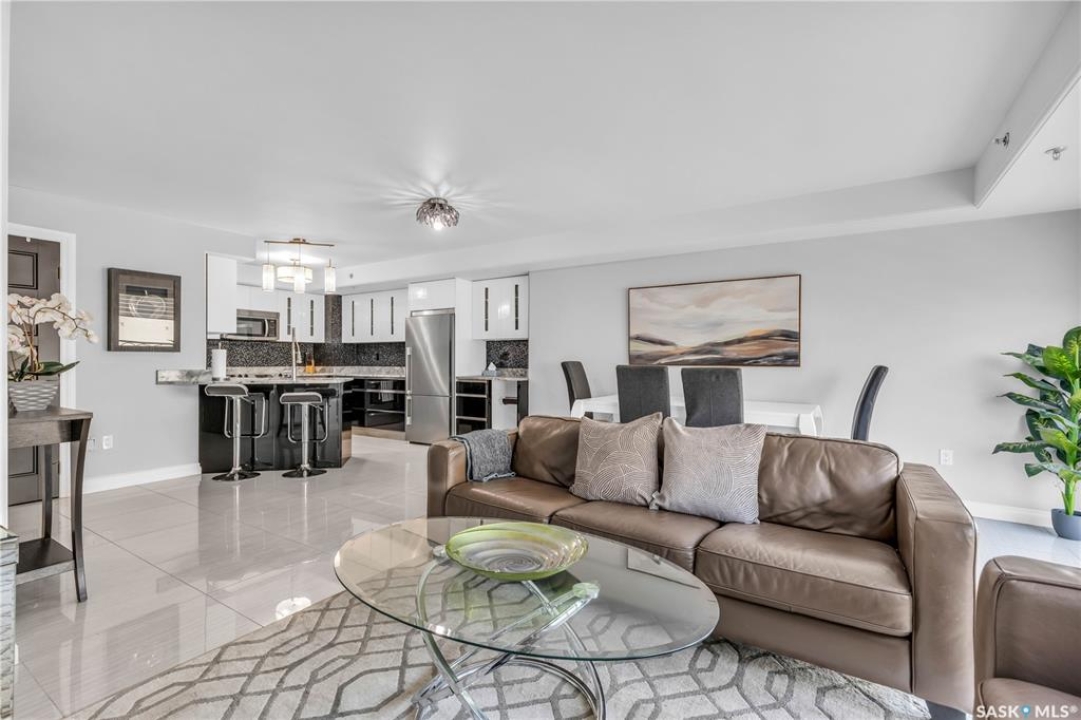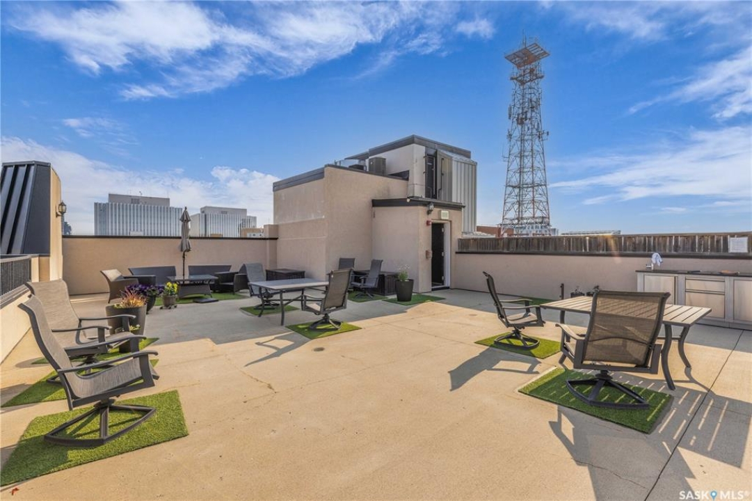 Fully-furnished top-floor executive suite with 2 bedrooms, 2 bathrooms and 2 Underground Parking Stalls! Historic elegance meets modern luxury at the Residences at King George. This iconic landmark is close to shops, dining and just a few blocks from the scenic riverfront. Luxurious limestone tile flows throughout, and floor to ceiling windows provide tons of natural light. The kitchen features sleek granite countertops and high-gloss white cabinetry with glass shelving and built-in accent lighting. A full stainless steel appliance package adds to the kitchen's functionality and style. Two sizeable bedrooms provide plenty of room for rest and relaxation, with ample closet space. The primary bedroom includes a private ensuite bathroom, ensuring a touch of luxury and privacy. The second bedroom is equally spacious, with easy access to the main bathroom, making it perfect for guests or a home office. Enjoy the convenience of in-suite laundry, and two secure underground parking spaces, providing peace of mind and protection for your vehicle year-round. For those who love to entertain or simply relax outdoors, you'll have access to a stunning rooftop deck. Complete with fully equipped outdoor kitchen, this expansive space is perfect for hosting friends or unwinding while taking in panoramic views of Saskatoon. Don't miss this chance to experience the best of historic charm and contemporary luxury at the Residences at King George.