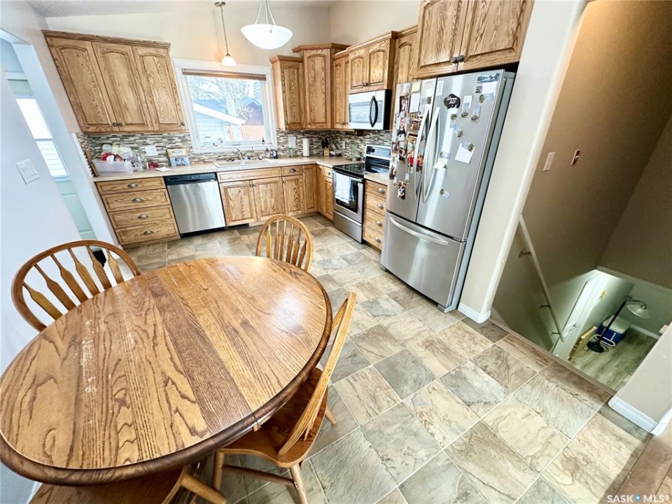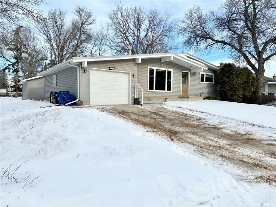 Welcome to 3 Scott Crescent, a beautifully maintained mid-century modern bungalow located on a quiet crescent in one of Weyburn's most desirable neighbourhoods, surrounded by mature trees and close to the high school, track and walking trails. The main floor features a bright and inviting living room highlighted by vaulted ceilings and a gas fireplace, creating a warm and stylish gathering space. Interior updates include hardwood flooring and a functional kitchen complete with stainless steel appliances. Convenient main-floor closet laundry adds to the home's practicality. This home offers four bedrooms total, with two on the main floor and two in the fully developed basement. The primary bedroom includes a 3-piece ensuite with a glass shower as well as a walk-in closet. Additional highlights include PVC windows, a durable metal roof, and a high-efficiency furnace for long-term comfort and peace of mind. A mudroom accessible from the kitchen provides access to the 12' x 24' attached garage, while the backyard includes a 24' x 24' fully finished detached garage which is ideal for vehicles, hobbies, or additional storage. There is also an RV parking space on the west side of the detached garage for extra parking. Enjoy outdoor living on the large rear deck, perfect for relaxing or entertaining. Move-in ready and thoughtfully updated, this property offers the perfect blend of character, comfort, and functionality in a sought-after location. Call to book a showing today.