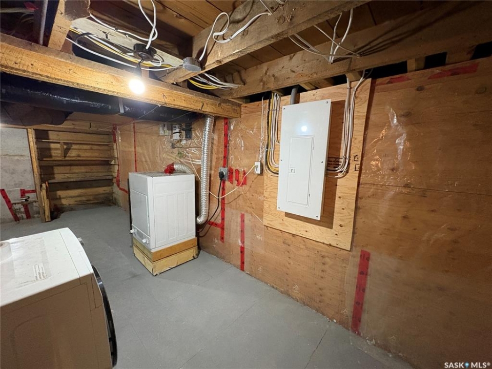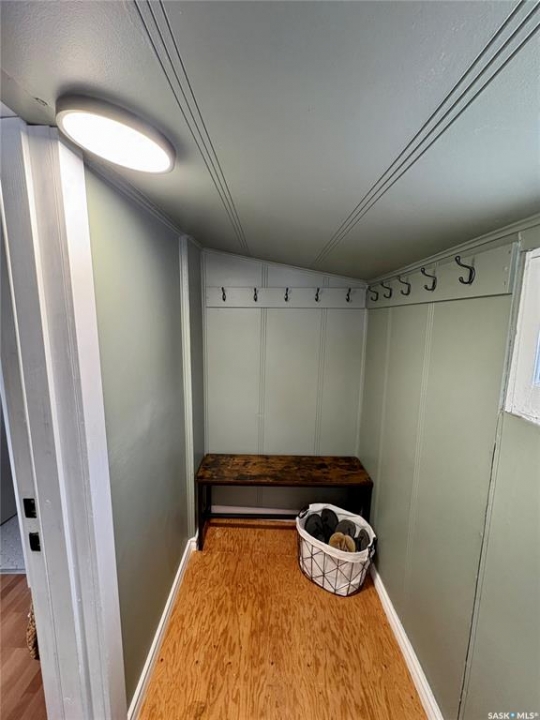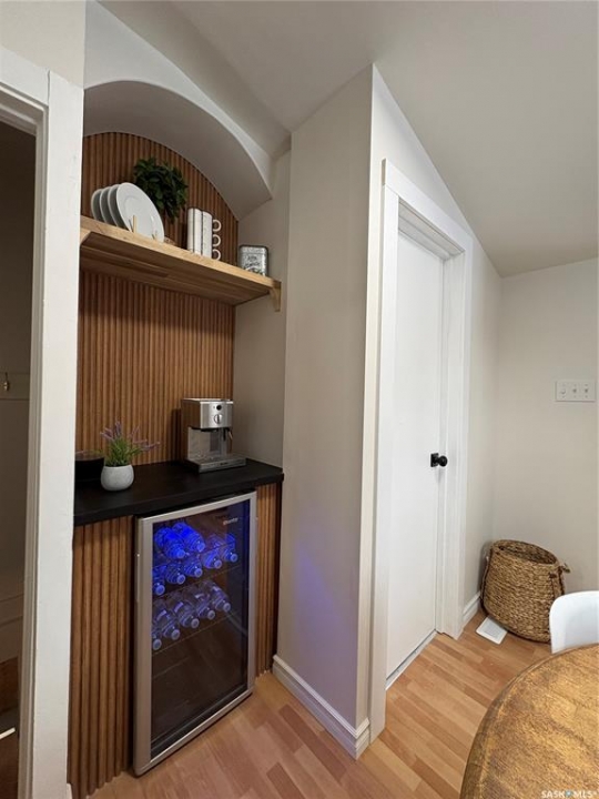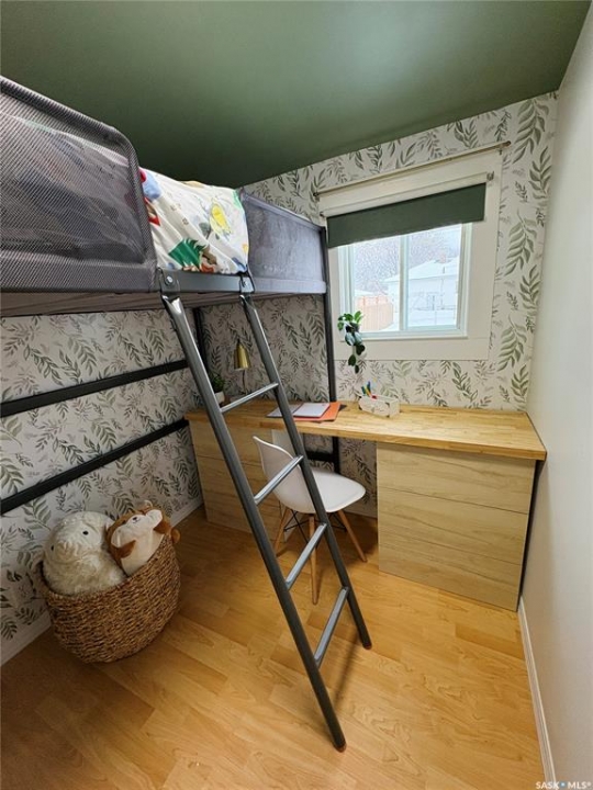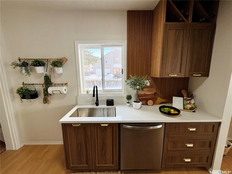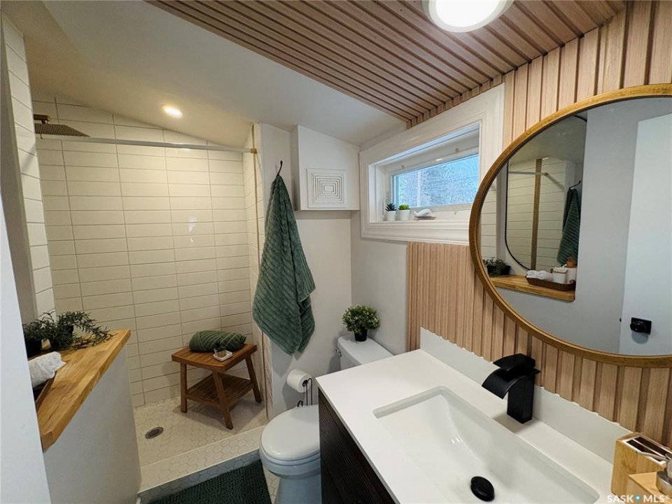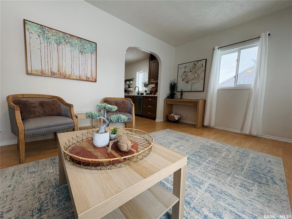 This charming 632 sq. ft. home offers a warm, cozy tiny-house vibe while still providing plenty of space to host family and friends. Large windows throughout fill the home with natural light, enhancing the inviting atmosphere. The thoughtfully designed layout includes two bedrooms, with an exceptional second bedroom that's perfect for kids. Clever storage nooks are tucked throughout the home, maximizing functionality without sacrificing style. The beautiful kitchen features quartz countertops and a matching quartz backsplash, complete with built-in wireless charging ports and a stylish coffee bar with a mini fridge. The bathroom has been beautifully renovated, and there is ample additional storage in the basement. Outside, you'll find a spacious 22 x 24 garage ideal for parking, or projects. The property sits on a corner lot with a mature, grassed yard, directly across from a park—an ideal setting for a starter home, families, or even downsizing. Come see what Rosthern has to offer, including a newer school, hospital, arena, golf course, cafe's and restaurants.