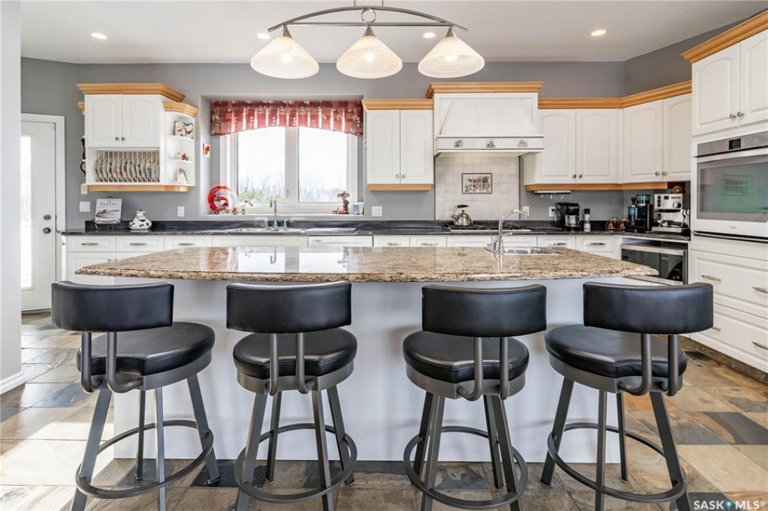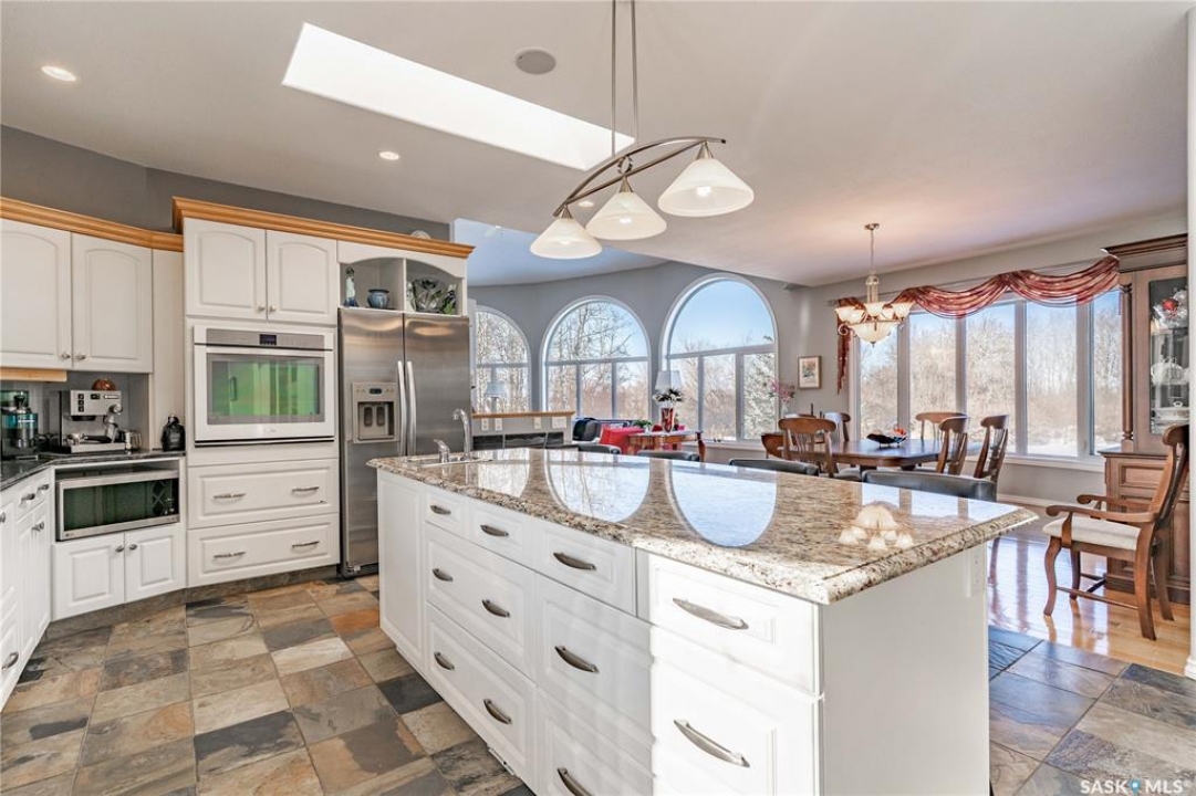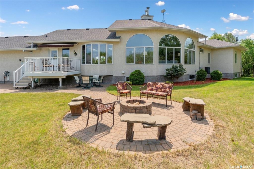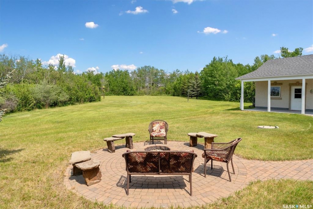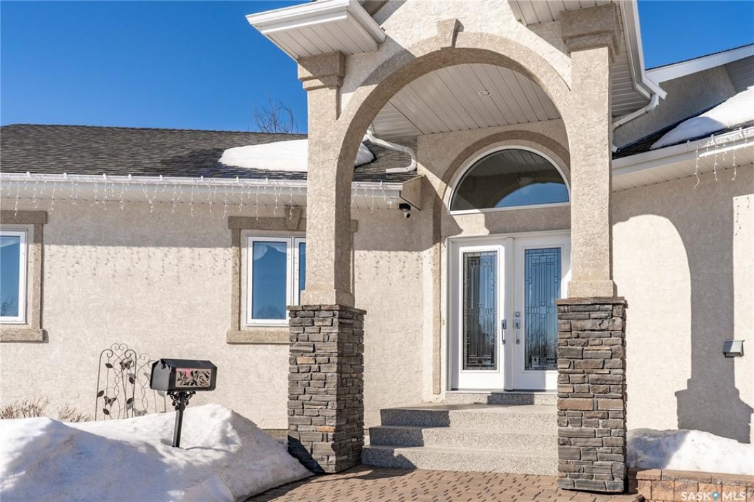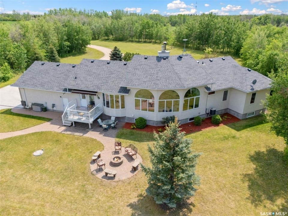 Welcome to The Meadow, 80 acres of pure serenity on the southeast doorstep of Saskatoon. This peaceful paradise offers the privacy and tranquility of country living, just minutes from Costco and Greenbryre Golf & Country Club. This sprawling, custom-built Ehrenburg bungalow is designed for comfort, beauty, and connection to the nature. The grand front entry welcomes you with soaring vaulted ceilings and a sweeping sense of space. The centerpiece of the great room is a stunning wood-burning fireplace, creating a warm, inviting atmosphere enhanced by floor-to-ceiling windows that frame breathtaking views of the wilderness waiting for you out your back door. White oak hardwood gleams throughout the main floor, paired with slate tile in the foyer and kitchen. The spacious kitchen features a large 8-foot granite island, gas stove, built in oven, ample cupboard space, and easy flow into a turret-shaped sun porch—perfect for morning coffee or sunny, lazy afternoons. This south-facing gem is flooded with natural light and designed to make the most of every season. The main floor also includes laundry, three well-appointed bathrooms, and three bedrooms. The primary bedroom offers a peaceful retreat, complete with a three-piece ensuite and a private turret-shaped sunroom for year-round quiet moments of rest and reflection. Additional features include a heated double attached garage and a wide single detached garage with shower and bathroom facilities—an ideal workshop with ample space for storage and tons of room for any project. The full basement is ready for your custom development, with in-floor heating lines already roughed in. Whether you're looking to raise a family, escape the city, or simply enjoy life in harmony with nature, The Meadow delivers the best of all worlds—privacy, space, and proximity to everything you need. Must be experienced to be fully appreciated. Call your favourite Realtor � to arrange a private viewing today!