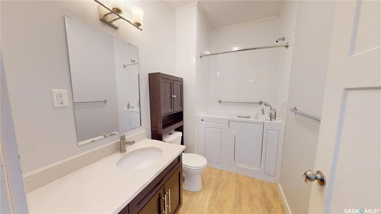Awesome pet-friendly condo with 2 bedrooms, 2 full bathrooms, and 2 parking spaces ready for immediate possession! Please view the Matterport 3D virtual tour in this listing. You'll love the stylish kitchen with floating shelves, stone wall tile, and sleek stainless steel appliances. The open-concept kitchen, dining area, and living room have an airy feel with nine-foot ceilings, a ceiling fan, and durable laminate flooring. A garden door leads to the balcony with a glass railing, where you can relax with your morning coffee and enjoy the fresh air. In-suite laundry, forced air heating, and central air conditioning are more desirable amenities. The primary bedroom has a 3pc ensuite with a shower and a walk-in closet. This ground-floor unit is located right next to a building exit hallway, leaving you with one less adjacent neighbour, and the surface parking stall is right outside the door for added convenience. The heated underground parking stall will keep your car warm through the winter, and additional storage is located in front of the underground stall. The kitchen and the main bathroom feature universal design and accessibility enhancements, offering comfortable functionality for all users. A professional home inspection report and a Property Condition Disclosure Statement (PCDS) are available for review, giving buyers the opportunity to make a more informed offer. Call now for your own private viewing.