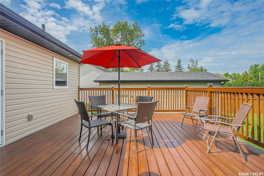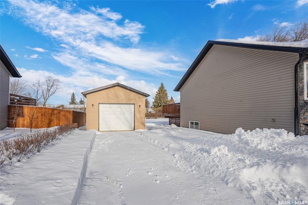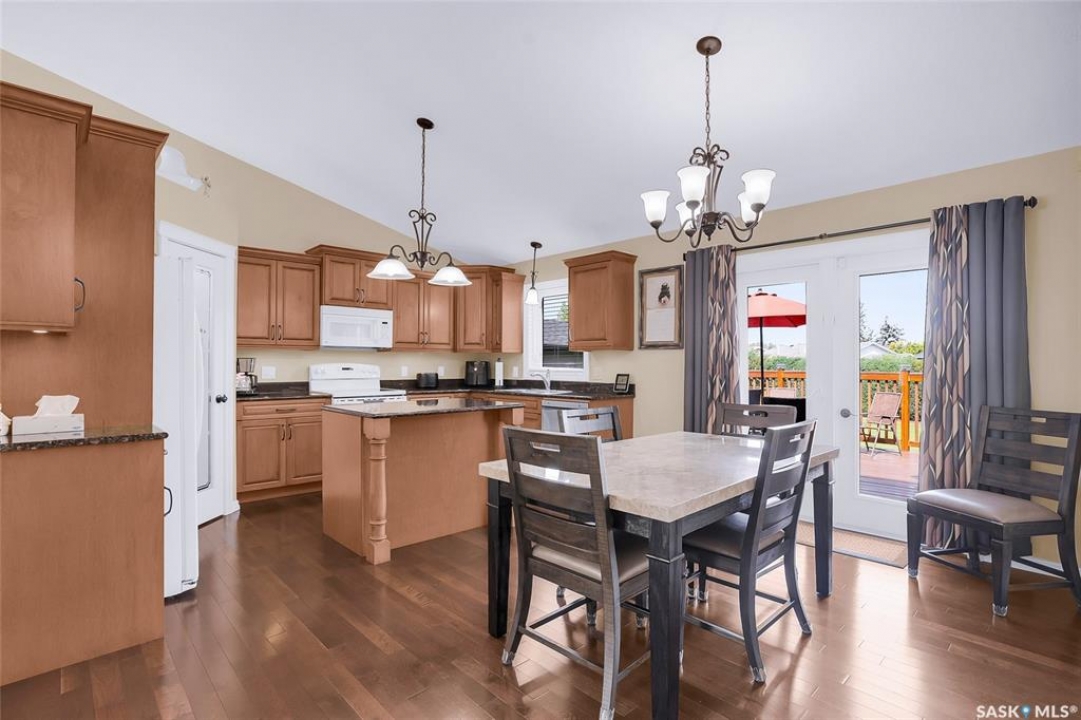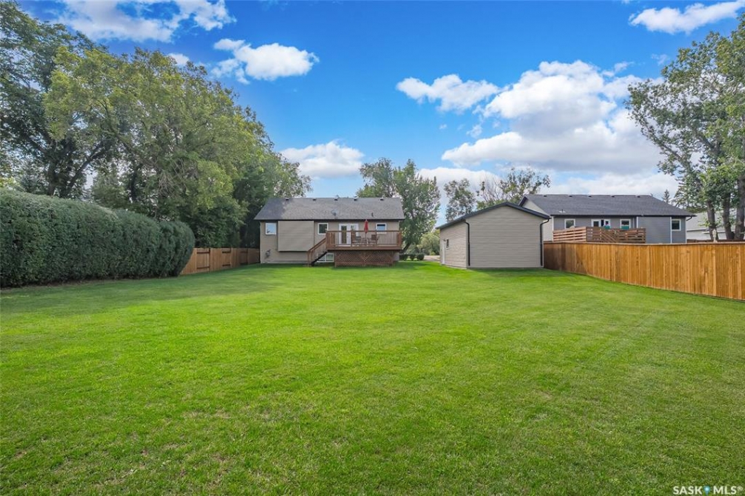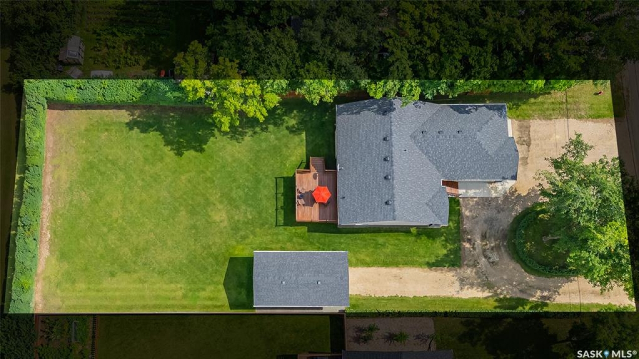 Stunning Executive Home Just 30 Minutes to Saskatoon! Discover luxury living in this absolutely gorgeous home where quality and craftsmanship are evident from the moment you arrive. Nestled on an oversized, fully landscaped 81.5 x 200-foot lot offering exceptional privacy, this property is a beauty. Step inside to vaulted ceilings and an open floor plan that seamlessly blends elegant living with everyday comfort. Beautiful hardwood floors flow throughout, while the kitchen showcases granite countertops and rich maple cabinetry. The thoughtfully designed layout includes three spacious bedrooms, with the primary suite featuring a 4-piece ensuite and generous walk-in closet. The open-concept basement expands your living space dramatically, boasting impressive 9-foot ceilings making you feel like you are not in a basement! Here you will find a games room, family room with electric fireplace, an oversized bedroom, large storage room, 3-piece bathroom, and laundry room with additional storage solutions. Entertain in style on the oversized deck, perfect for gatherings and quiet relaxation. Vehicle and storage enthusiasts will appreciate the exceptional 24x24/26-foot attached garage with 10-foot ceilings and 8-foot doors, PLUS a fully insulated 16x30-foot detached garage. New shingles 2025. Conveniently located near the school, park, and post office, this home offers the perfect blend of peaceful country living with easy access to urban amenities. This is more than a house, it's a lifestyle.