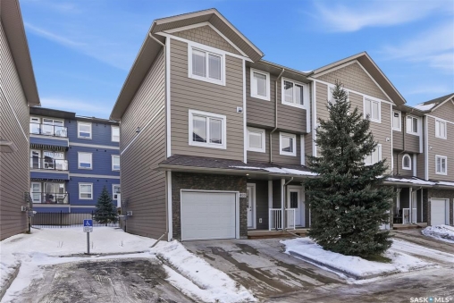 Welcome to this beautifully maintained end-unit townhouse in the highly sought-after Stonebridge community. Ideally located close to parks, walking paths, shopping, restaurants, and transit, this move-in-ready home presents an excellent opportunity for homeowners and investors alike. A rare and standout feature of this property is its three spacious bedrooms, each complete with its own full bathroom, an exceptional layout seldom found in townhome living. The main floor offers a welcoming foyer with ample storage, durable tile flooring, and direct access to the single attached garage. The second level features a bright and open living space highlighted by soaring 12-foot ceilings, large windows, and access to a private deck, perfect for relaxing or entertaining. The modern kitchen is thoughtfully designed with dark cabinetry, stainless steel appliances, granite countertops, and a tile backsplash, opening seamlessly to a generously sized dining area. This level is completed by a convenient two-piece bathroom and laundry room. Upstairs, the primary bedroom provides excellent space, abundant natural light, two walk-in closets, and a four-piece ensuite. The second bedroom on this level also includes a walk-in closet and its own four-piece ensuite. There is also a small bonus area ideal for a desk or home office. The fully finished basement adds even more versatility with a third bedroom, complete with its own four-piece ensuite, making it ideal for guests, extended family, or additional rental flexibility. This well-designed townhome offers comfort, functionality, and a truly unique layout in one of Saskatoon's most desirable neighbourhoods.