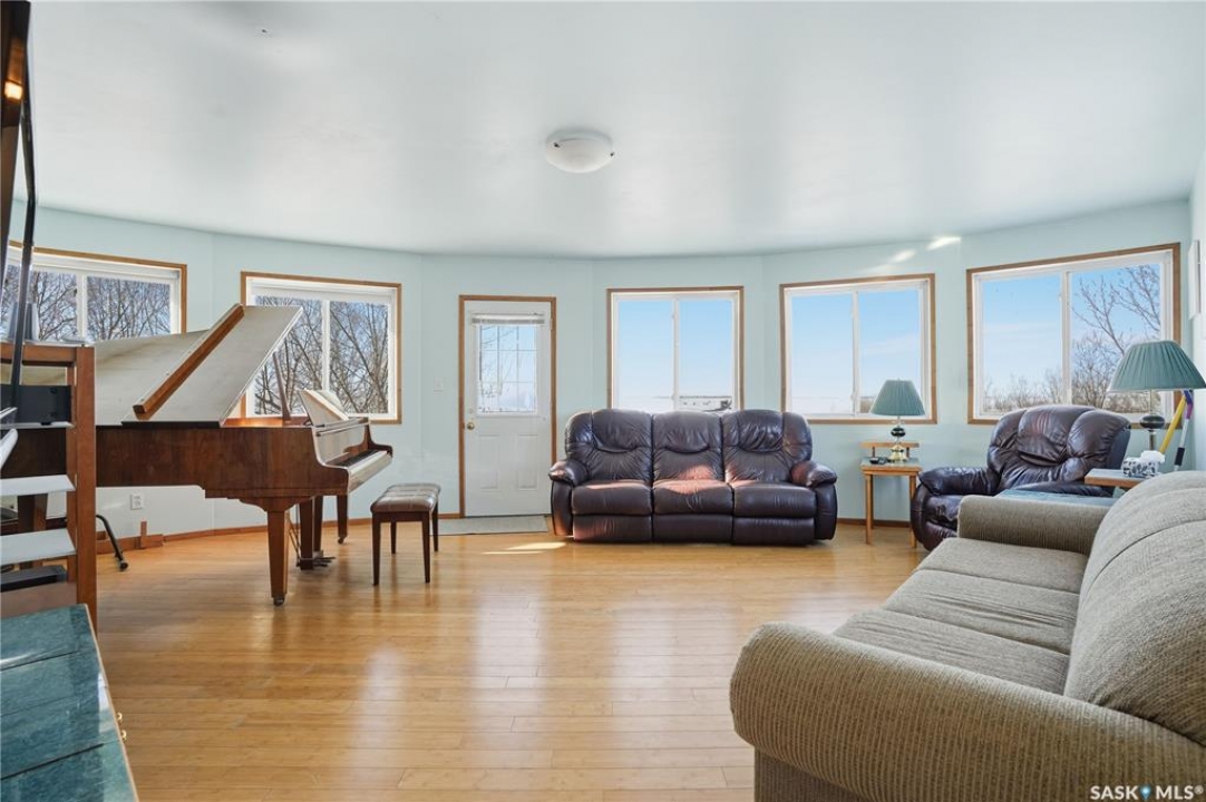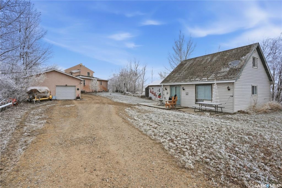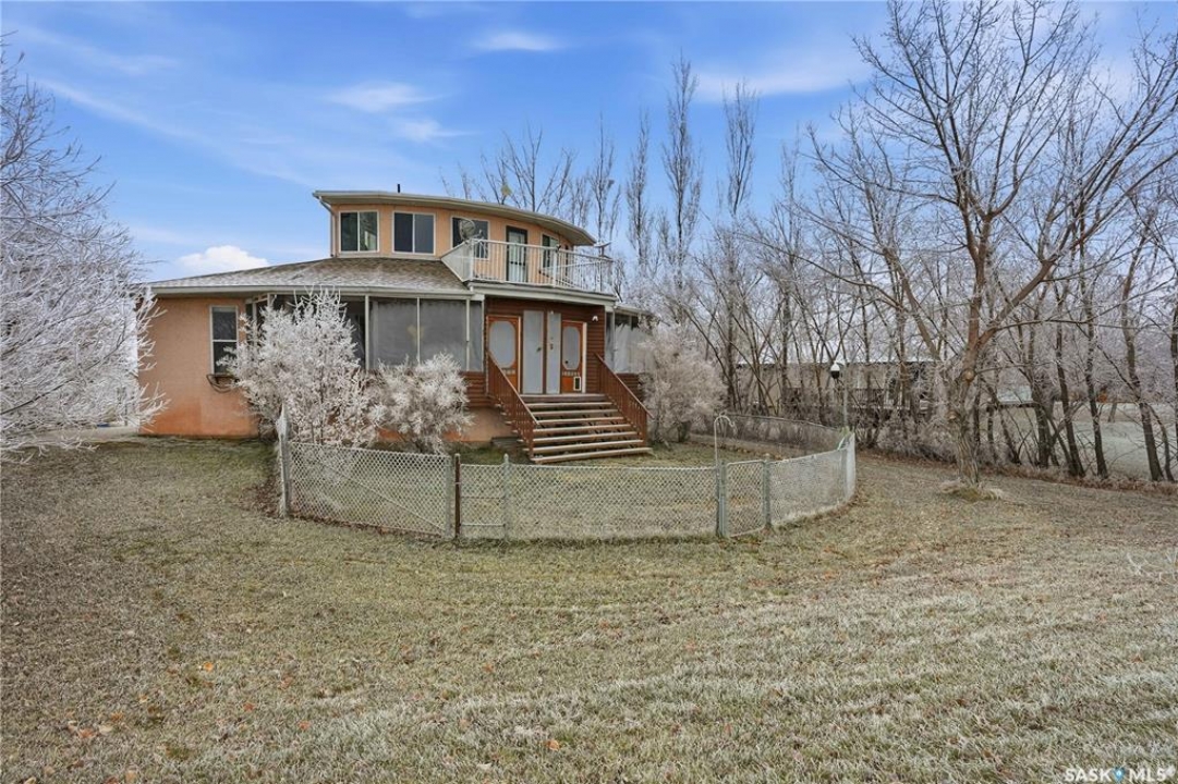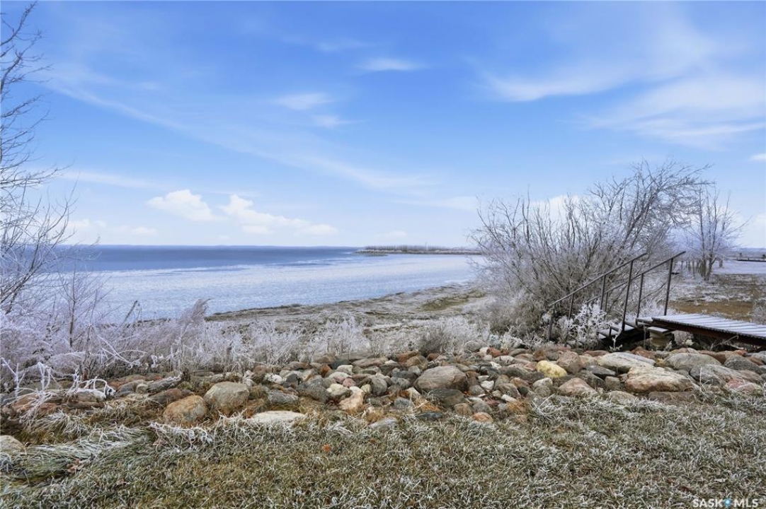 Experience the ultimate in lakeside living with this extraordinary four-season retreat, where architectural innovation meets breathtaking natural beauty. This unique 1 1/4 story home is defined by its striking panoramic arc, featuring a continuous span of large windows along the north and west elevations that frame stunning views of the water. This architectural masterpiece flows seamlessly through the den, living room, and master suite, while a massive 10-foot-wide covered and screened deck mirrors the curve outside, offering a protected sanctuary to enjoy the lake breeze and beach views. The main level welcomes you with a sun-drenched living room and a kitchen equipped with an abundance of cabinetry and pantry storage. This floor also hosts two spacious bedrooms, a flexible den, and a generous five-piece bathroom featuring a luxurious soaker tub with direct access from the master suite. For those seeking a quiet escape, the upstairs loft serves as a private sanctuary, complete with its own west-facing balcony—the perfect vantage point for watching the sunset. Built for longevity, the home features Insulated Concrete Form (ICF) construction for the full basement and main floor walls, providing superior energy efficiency. Comfort is guaranteed year-round with a gas boiler system providing cozy in-floor heat across all levels. The lower level offers immense potential, already featuring electrical and drywall work for two expansive recreation areas, an additional bedroom and funtional three piece bathroom. The expansive 22,000 sq. ft. lot offers incredible space for gardening and play, bordered by the lake and a public green space. This property also includes a separate guest house (appliances included), making it an ideal setup for visitors. Conveniently located just 15 minutes from K-12 schooling in Strasbourg and 25 minutes from Bulyea, this home is the perfect blend of robust construction and serene lakefront luxury.