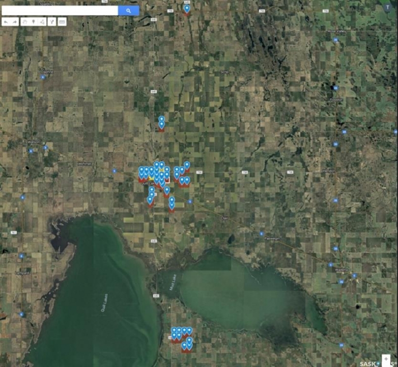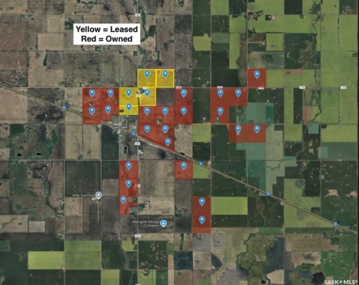 A rare opportunity to acquire 5,242.63 titled acres of Saskatchewan prime farmland in the sought-after northeast region of the province. This farm consists of 4,759 cultivated acres (SAMA) with a total assessed value of $12,202,100 (SAMA). The property is located approximately 60 km east of Humboldt, Saskatchewan, surrounding Quill Lake. This area has a long history of strong agricultural production and is supported by multiple nearby grain elevators, including Parrish & Heimbecker, Limited in Quill Lake, BroadGrain Commodities Inc. in Dafoe, and Bunge and Richardson Pioneer in Wadena. The region also benefits from excellent access to equipment and service dealerships, including Pattison Agriculture in Wynyard and Humboldt, as well as Redhead Equipment, GBC Equipment, and Hergott Farm Equipment Ltd. in Humboldt. The farm spans three separate Rural Municipalities, offers over 390,000 bushels of grain storage, and is located directly on Highway 5, providing excellent year-round access. Soil classes range from G to L, with approximately 50 percent Class G, 20 percent Class F, and the balance in Classes H through L, indicating above-average soil quality for the region. The land base includes 3,342.94 titled acres in the RM of Lakeside No. 338, 1,429.20 titled acres in the RM of Big Quill No. 308, and 470.49 titled acres in the RM of Spalding No. 386, for a total of 5,242.63 titled acres. An additional 659.58 titled acres of leased land may be available. Red land indicates owned acres and yellow indicates leased acres. PT SE 9-36-16-W2, being the south half with the residential improvements and consisting of approximately 22 acres, is currently in the process of being subdivided out and will not be included in the sale.