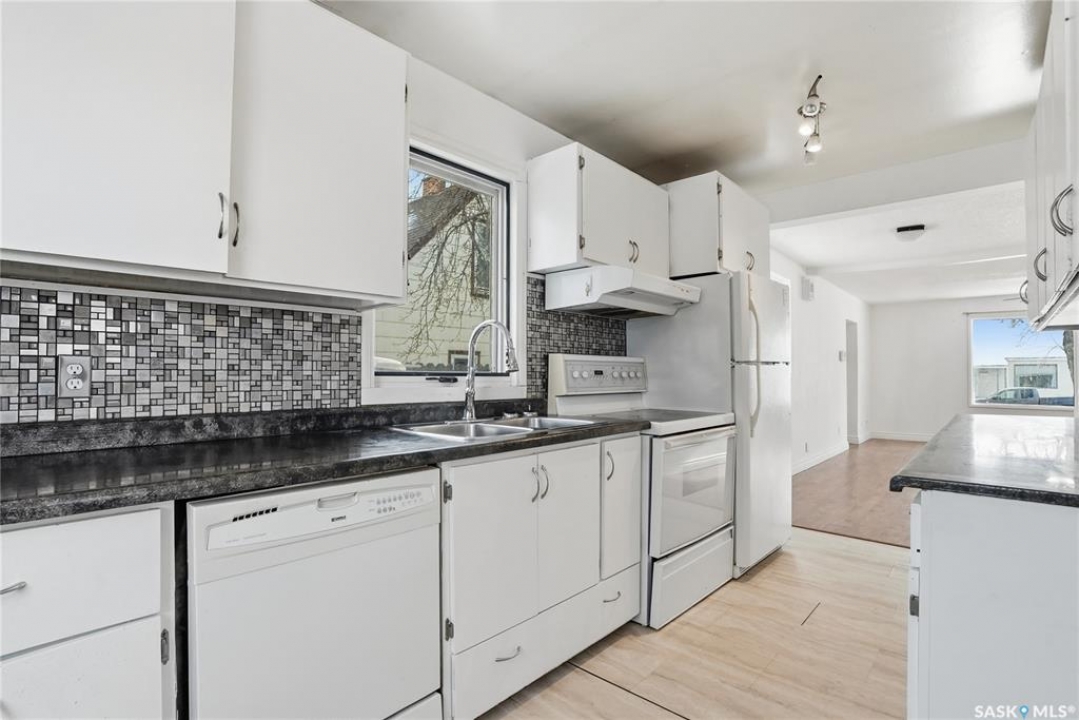 Welcome to 10 Connaught Place, a charming 903 sq ft bungalow tucked onto a quiet crescent in Saskatoon's Kelsey/Woodlawn neighbourhood. Built in 1957, this classic home has been refreshed for comfortable everyday living. Mature trees frame the front yard and the low-maintenance exterior delivers great curb appeal. Step inside to a bright, welcoming main floor with a spacious front living room, updated flooring and a fresh, neutral palette that's easy to personalize. A practical entry includes convenient closet storage to keep things tidy. The layout flows to the dining area and kitchen, where you'll appreciate crisp white cabinetry, a contemporary tile backsplash, generous counterspace and a window that keeps the space sunny while you cook. Down the hall are two comfortable bedrooms and a full bathroom. The fully developed basement adds excellent bonus space with a large family/rec room which can be used as a third bedroom, a second bathroom, dedicated laundry area and plenty of storage—ideal for a home office, gym, play space or movie nights. With an open footprint, you can create separate zones for entertaining, guests and hobbies and still have room to add your own finishing touches. Outside, enjoy a private backyard with space to relax, garden and host friends. A deck area is perfect for summer BBQs, and there's room for a firepit and play space. You'll also appreciate an oversized storage shed, extra parking and alley access. Located close to schools, parks, shopping, transit routes nearby and offering quick access to downtown and commuter routes, this 3 bedroom, 2 bathroom property is a fantastic option for first-time buyers, young families or investors looking for a move-in ready home in an established area. Don't miss it—book your showing today!